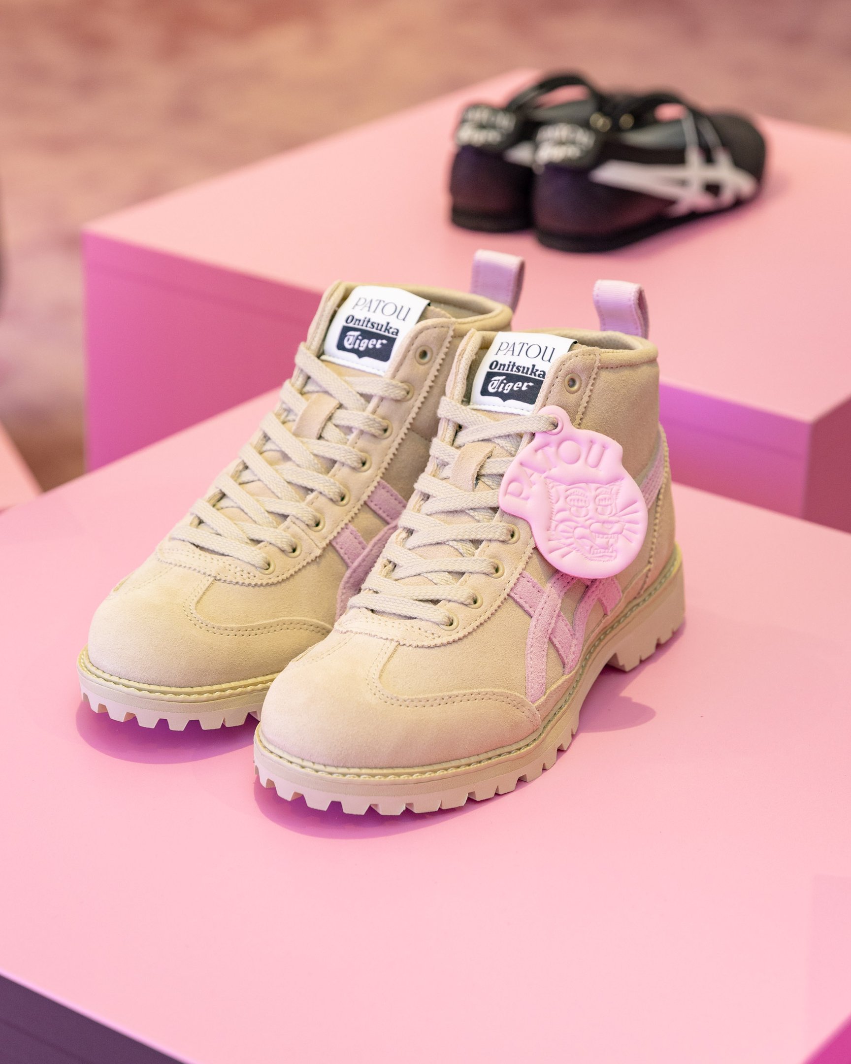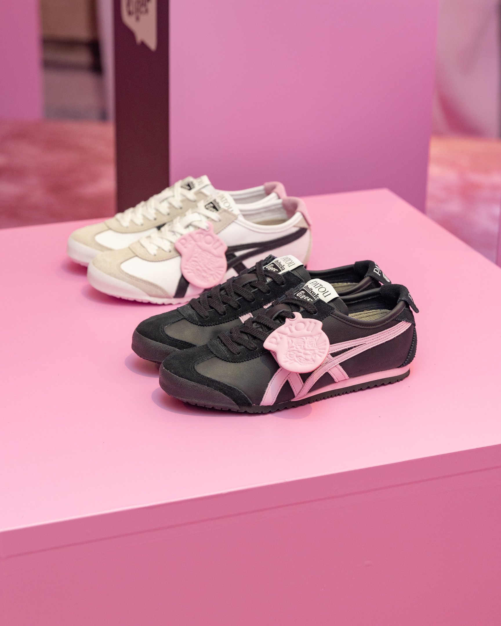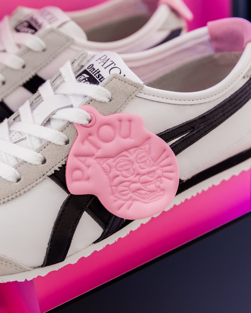 ヒールカウンターや、タイガーモチーフ"オニトラ"の取り外し可能なチャームはパトゥのシグニチャーカラーのピンクが採用されたほか、アイコニックなグログランリボンがオニツカタイガーストライプの一部に使われていたりと、クラシックな「MEXICO 66?」のベースにパトゥの"胸キュン"要素が取り入れられており、日常使いにもぴったりなデザインに仕上がりました。