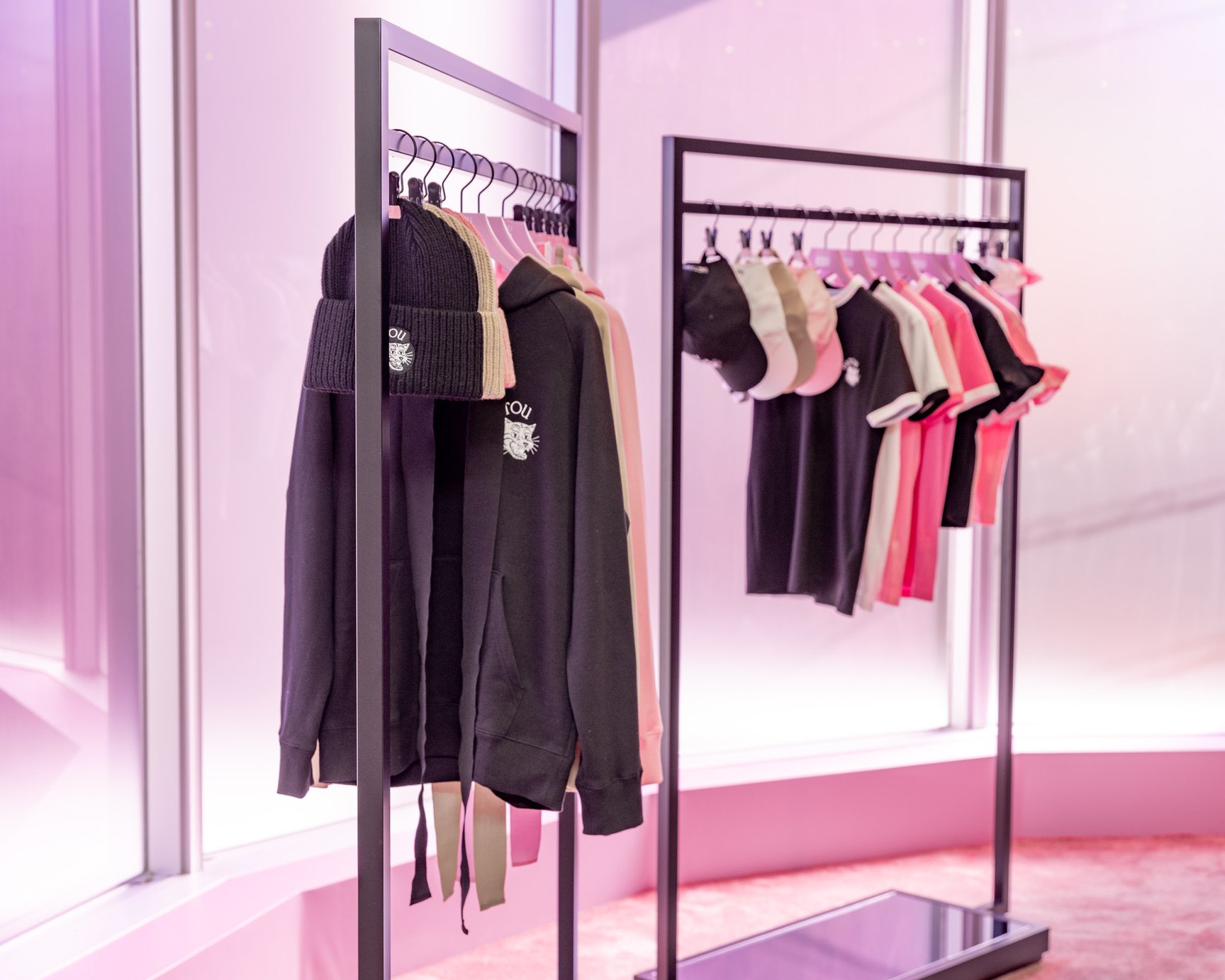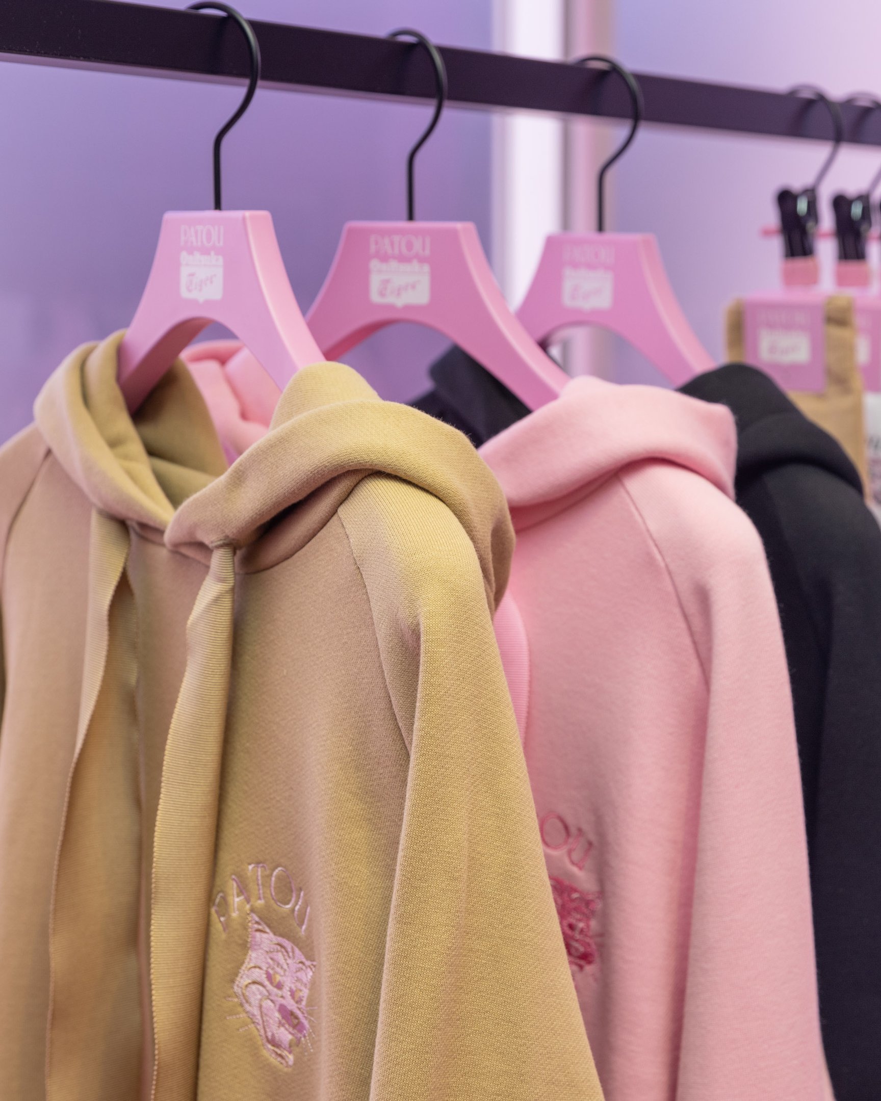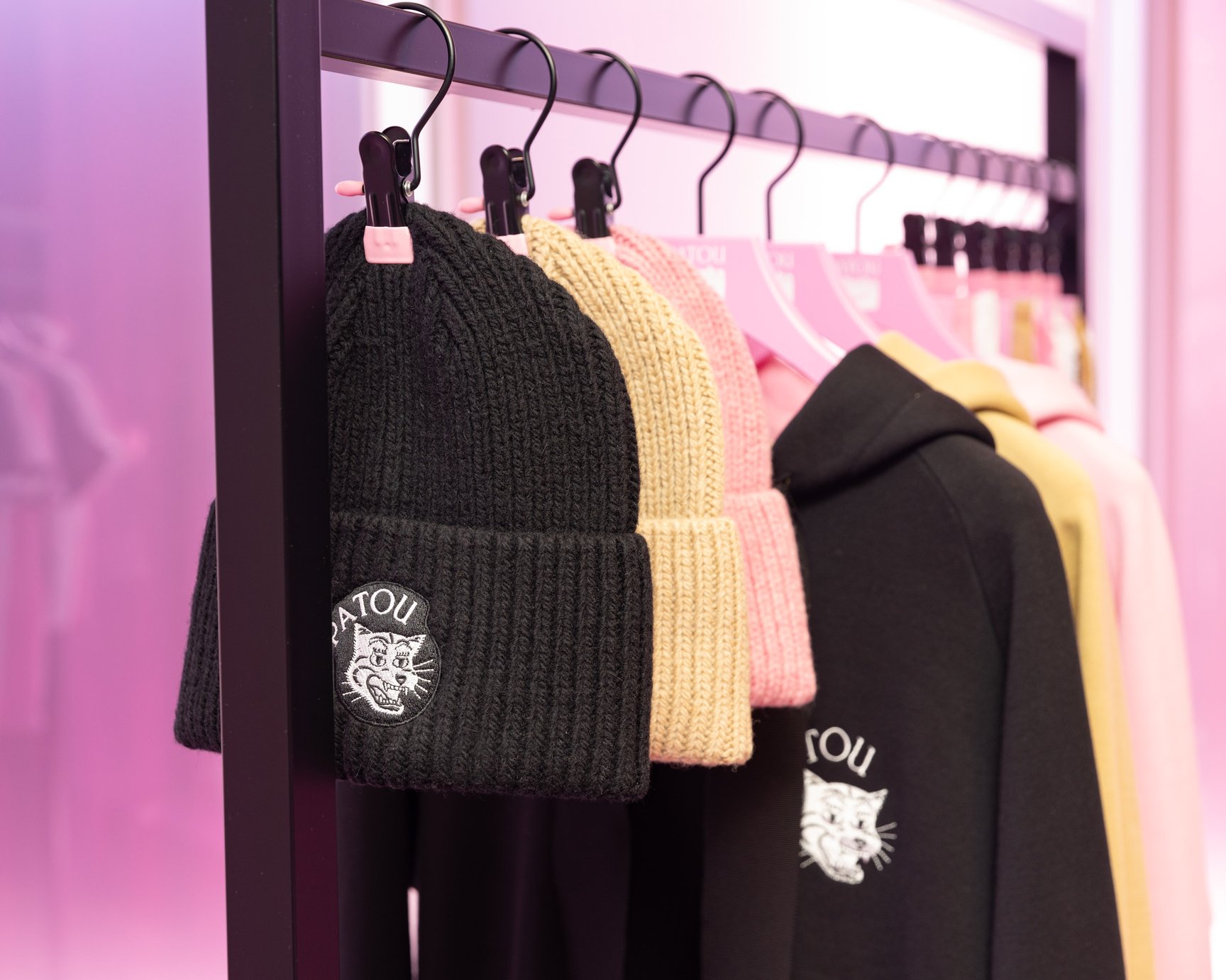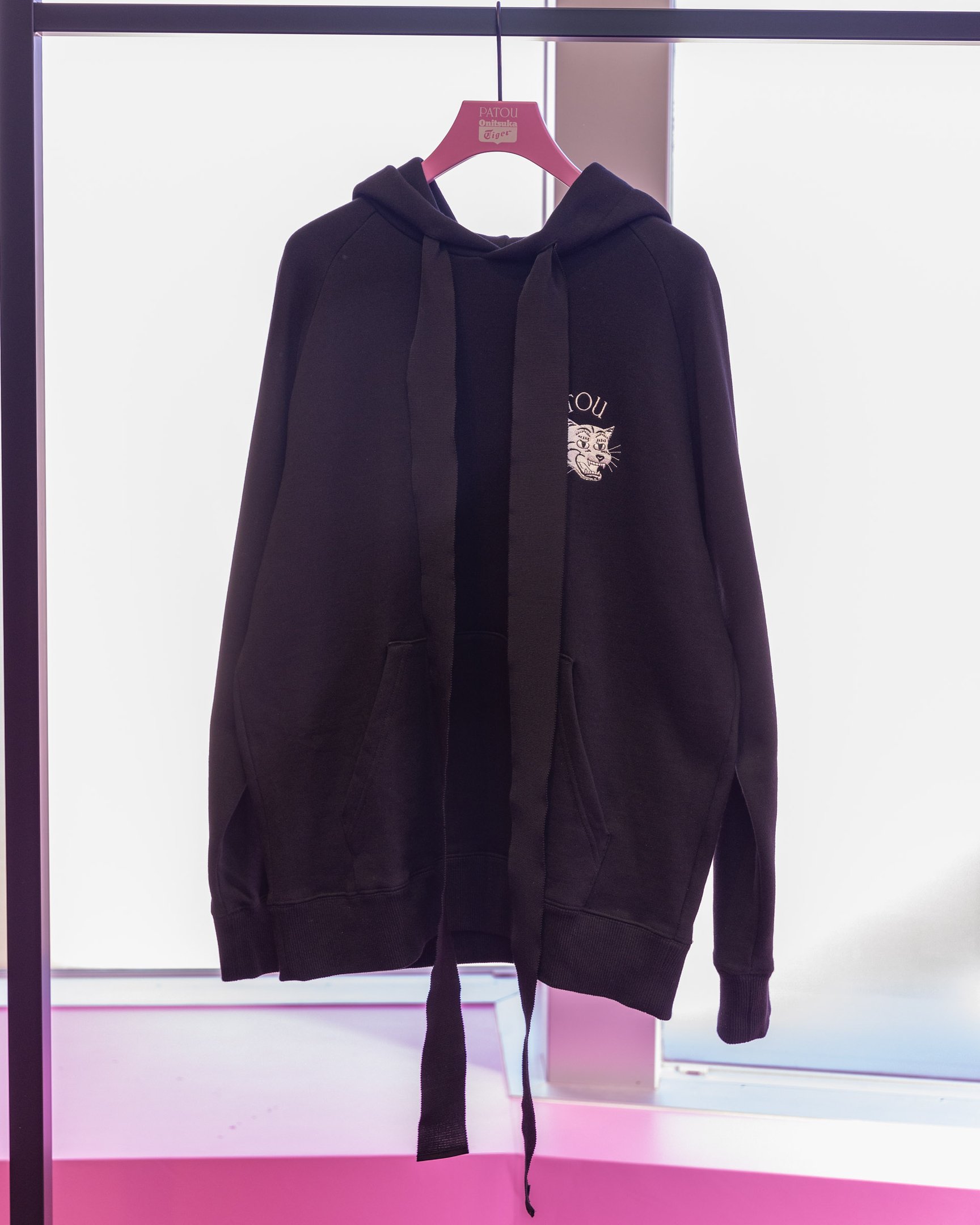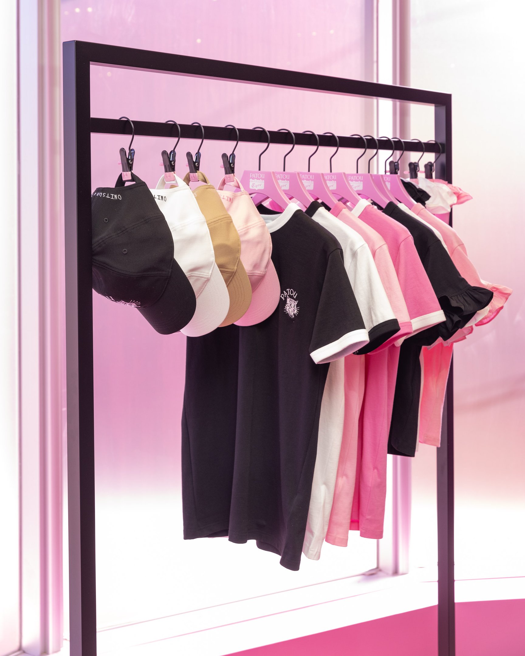 シューズのカラーと連動したアパレルアイテムにも注目です。リボン結びができる長いグログランリボンがドローストリングとしてデザインされたフーディ(4万9500円)や、タフタ素材のフリルがあしらわれたTシャツ(2万7500円)、シューズと合わせて履きたいソックス(4070円?5500円)、「PATOU」の文字と見れば見るほどクセになりそうな"オニトラ"のダブルネームロゴが印象的なキャップやビーニー(各1万8700円)などが登場。