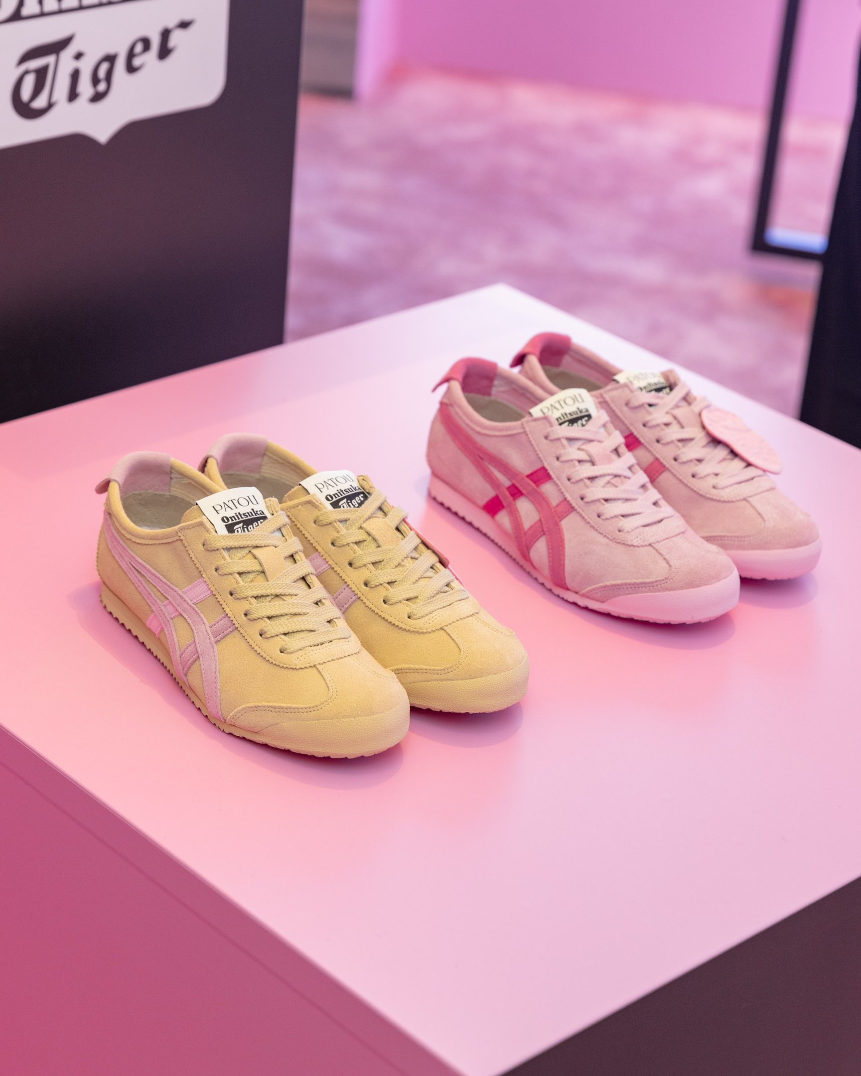 オニツカタイガーの代表的なモデル「MEXICO 66?」(3万6300円)は、パトゥらしいカラーリング全4色で登場。風合いのあるスウェードのピンクとベージュ、マットレザーのブラックとホワイトのアッパーにそれぞれコントラストの効いた配色でオニツカタイガーストライプがあしらわれています。