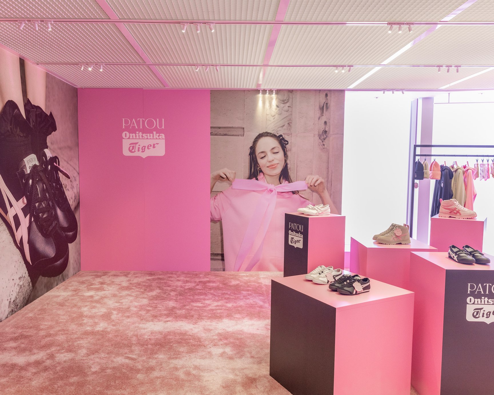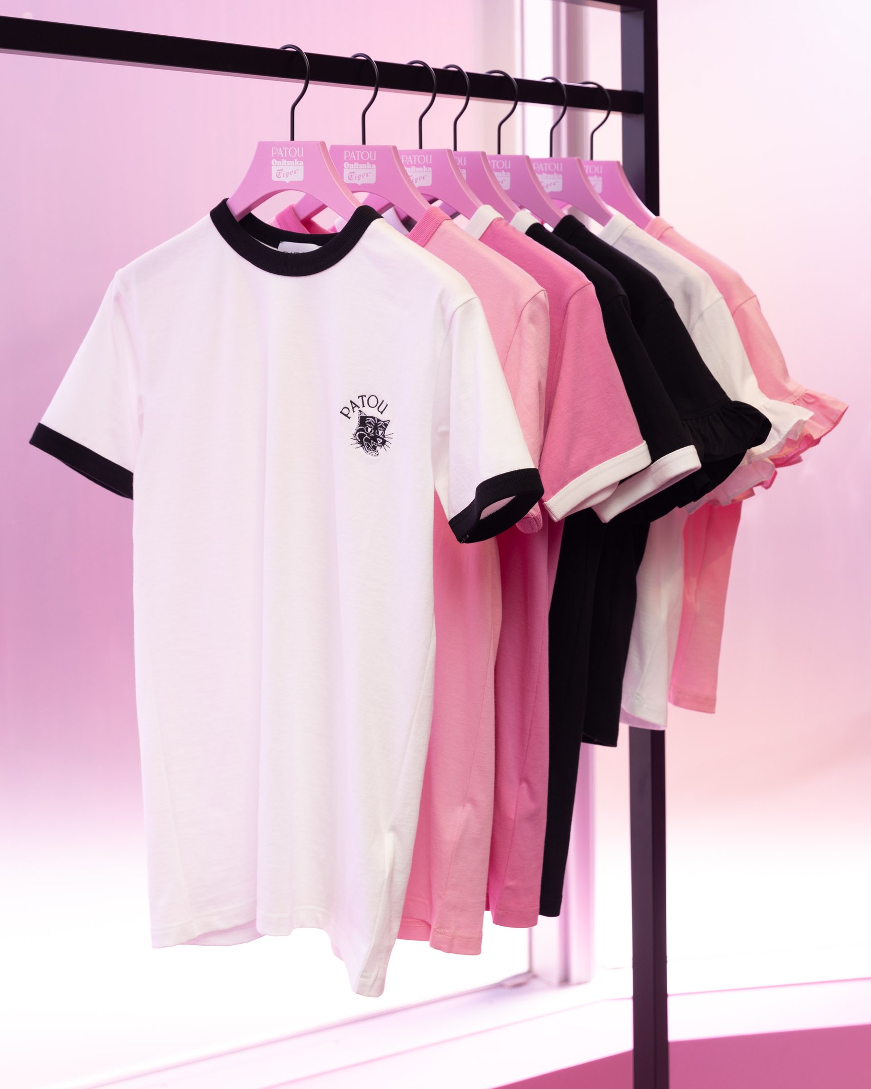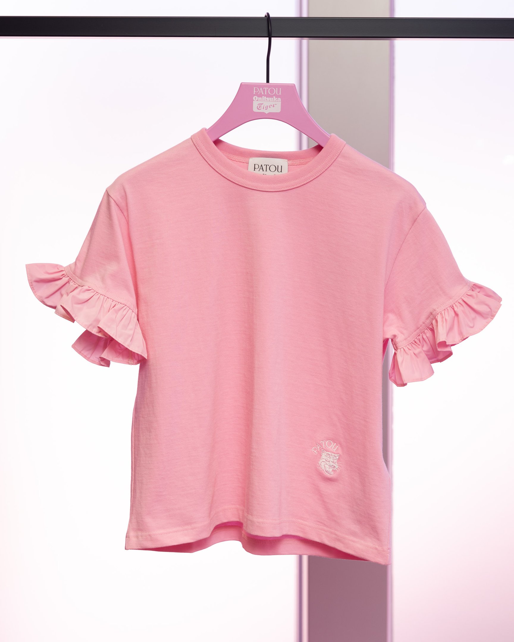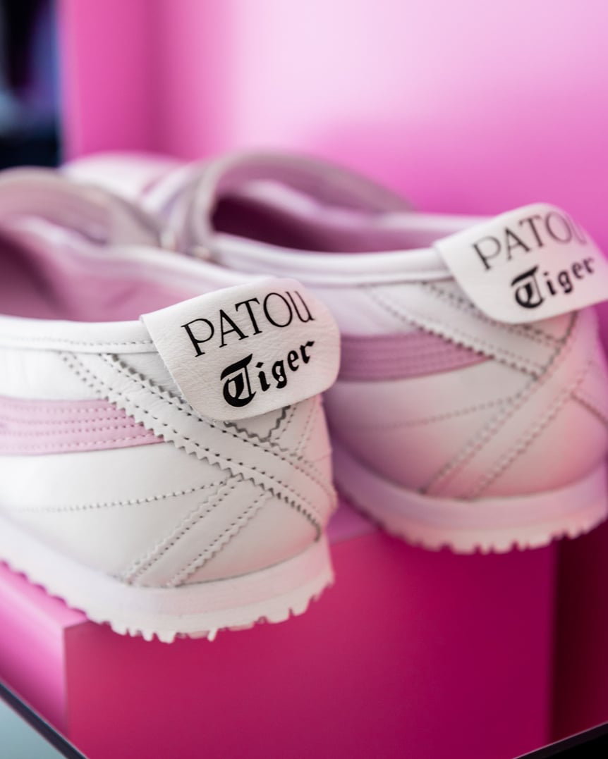 今年75周年を迎える「オニツカタイガー」と創業110周年を迎えた「パトゥ」というどちらもアニバーサリーイヤーを迎えた歴史あるブランドの異色コラボ。1914年に誕生したパトゥは、ラッフルやリボン、ロマンティックでガーリーなデザインに定評があるメゾンブランドです。日本とフランスにバックグラウンドを持つ両者が、今回ブランドのアイデンティティを持ち寄り、モダンなアプローチでシューズ3型、アパレル8型を発売しました。