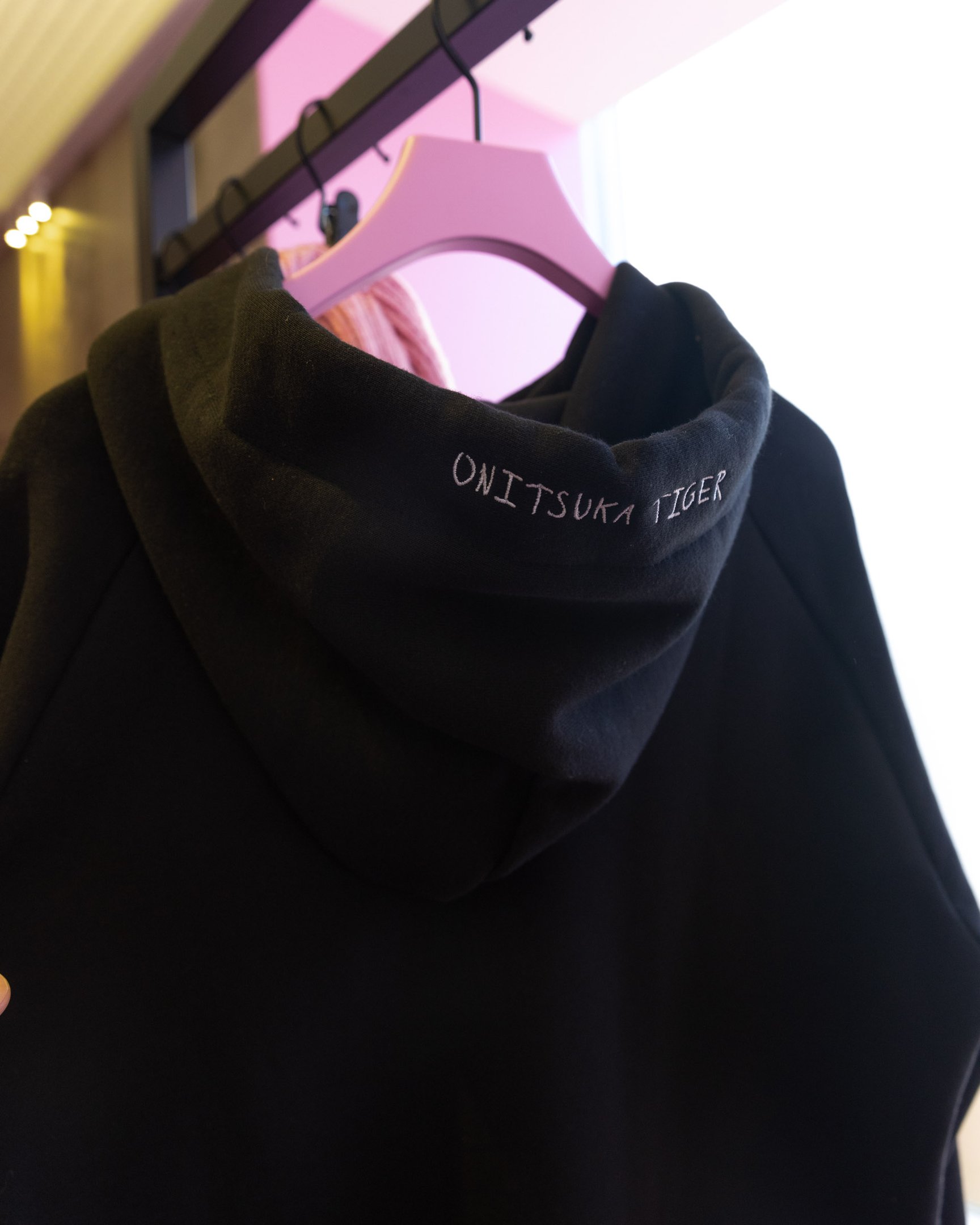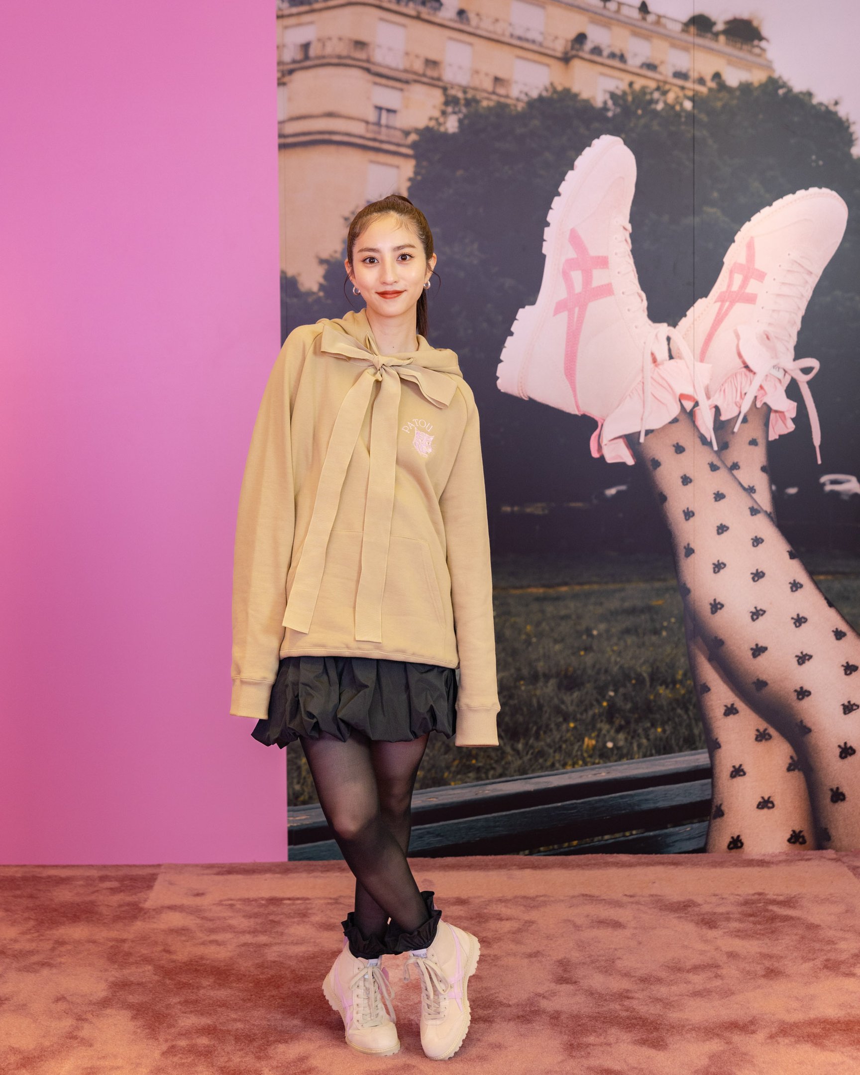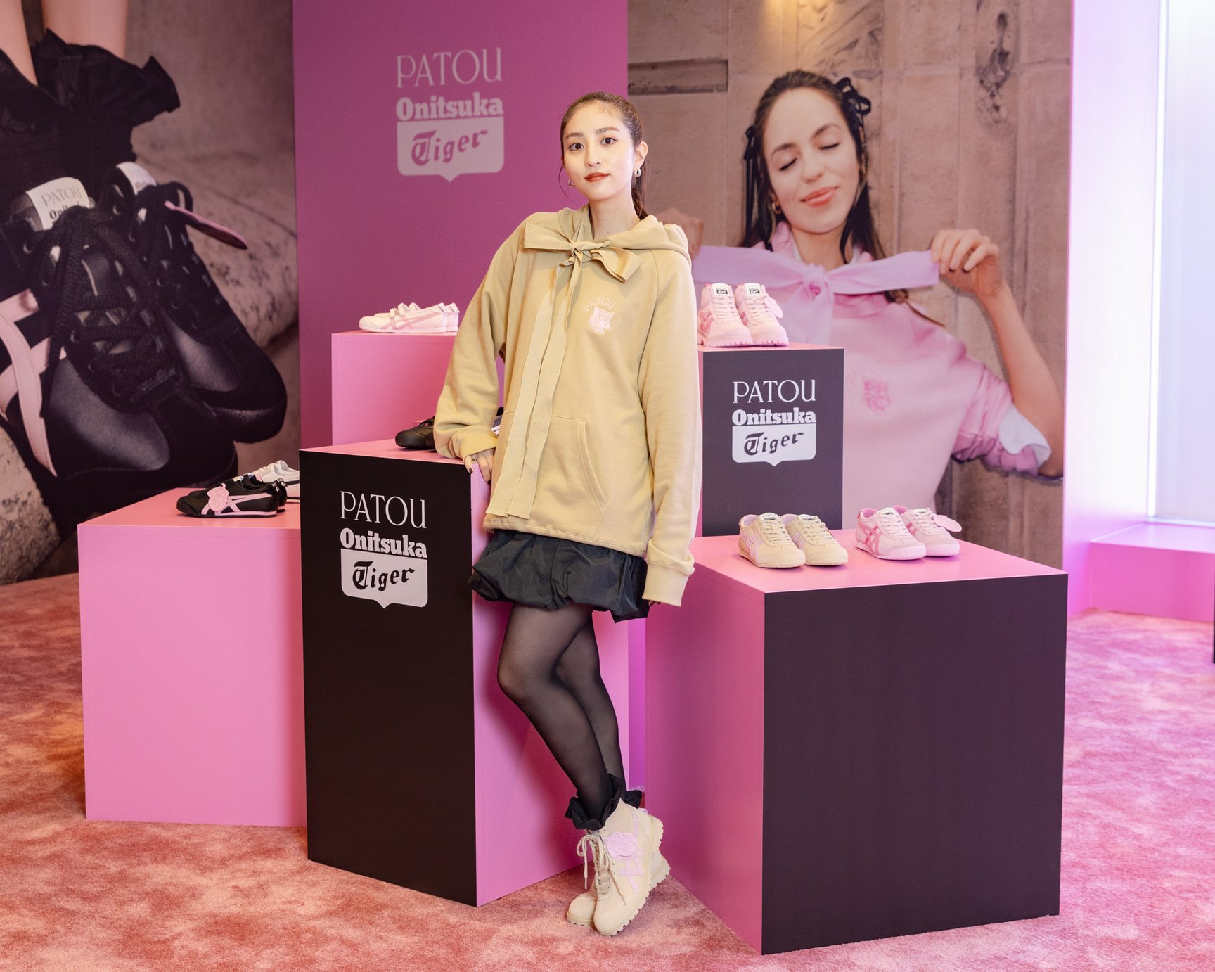 発売前日には、Onitsuka Tiger表参道にモデルで女優の堀田茜さんが来場。ベージュのフーディと同色の「MEXICO RINKAN?」にブラックのフリルソックスが覗く、カジュアルキュートなコーディネートを披露し、「ピンクと黒の世界にベージュの大人っぽいムードが合わさってすごくときめきました。モードなデザインに甘いものを合わせるのが今の気分にぴったりでした」とコレクションを堪能しました。