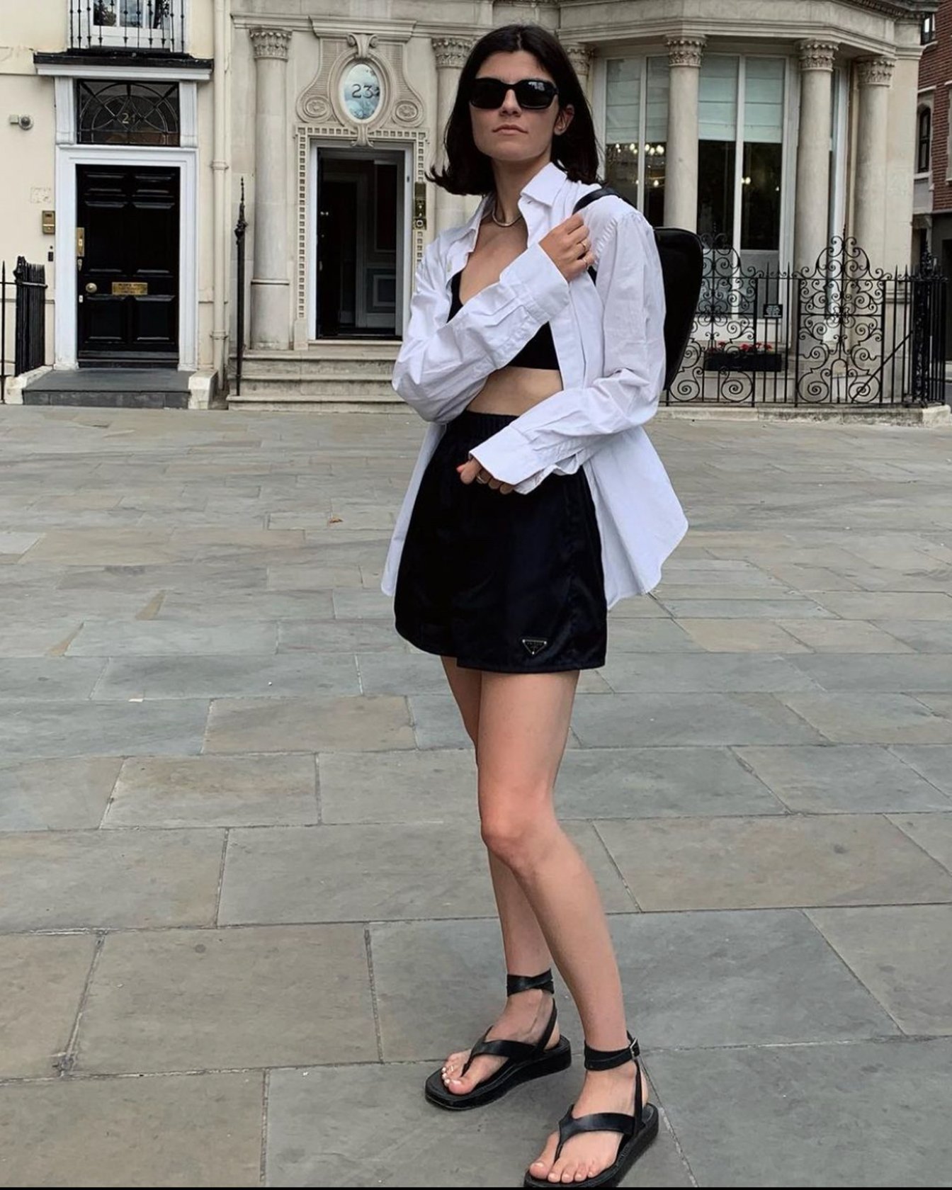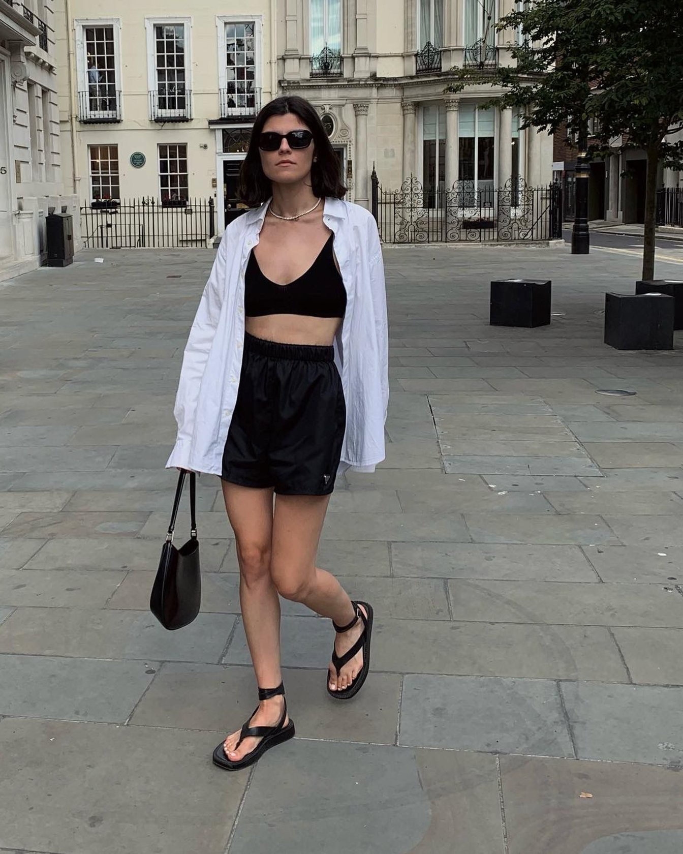 服を選ぶ時、ベースとなるピースをまず決めて、その日の服装を決めるの。スポーティカジュアルなバイブスが好きだから。今日はジャックムスのブラレットをナイロンショーツ合わせてみた。シャツやブレザースとか、1アイテムはメンズの服を入れることが多いんだけど、今日はメンズのシャツとレザーバッグで少しシックなルック。