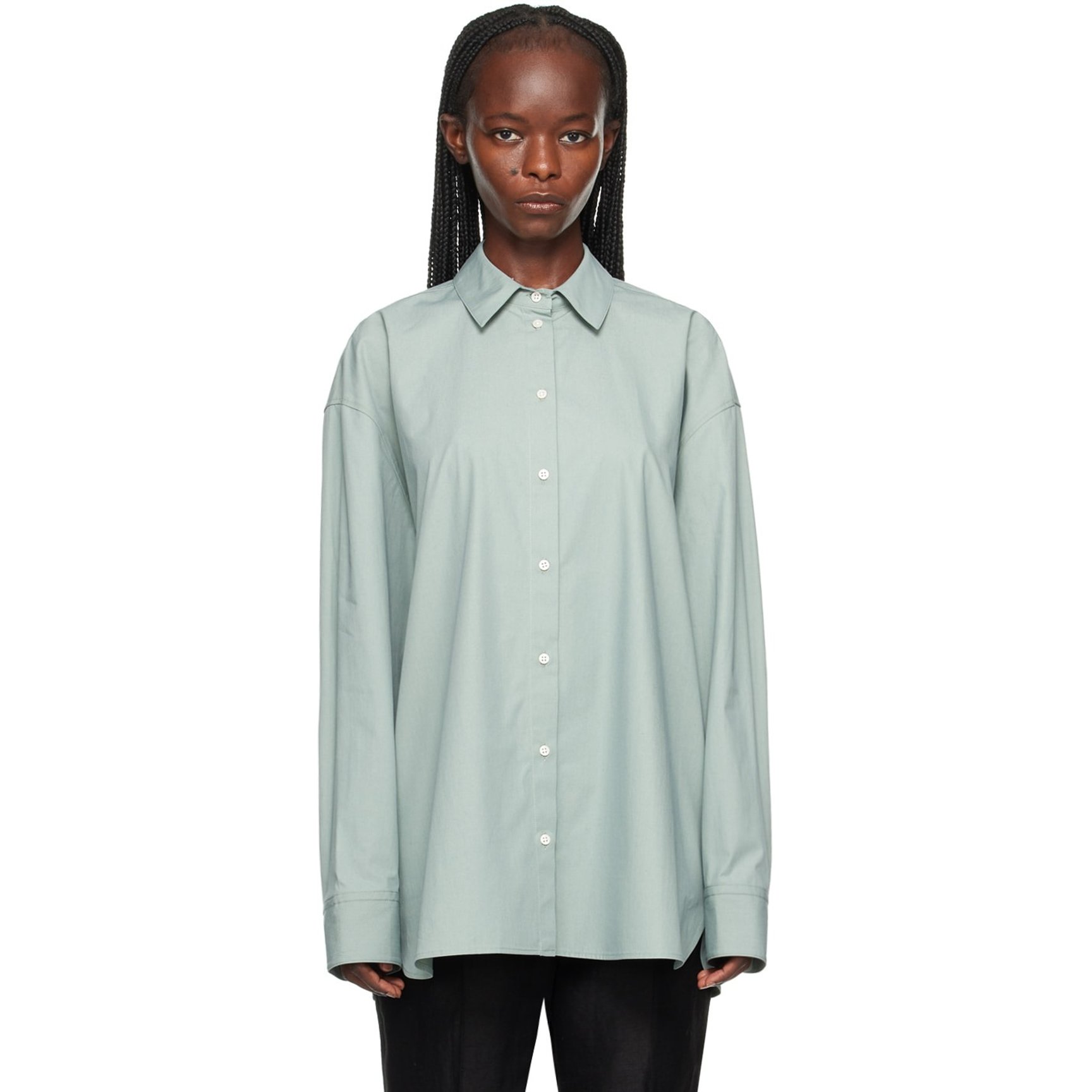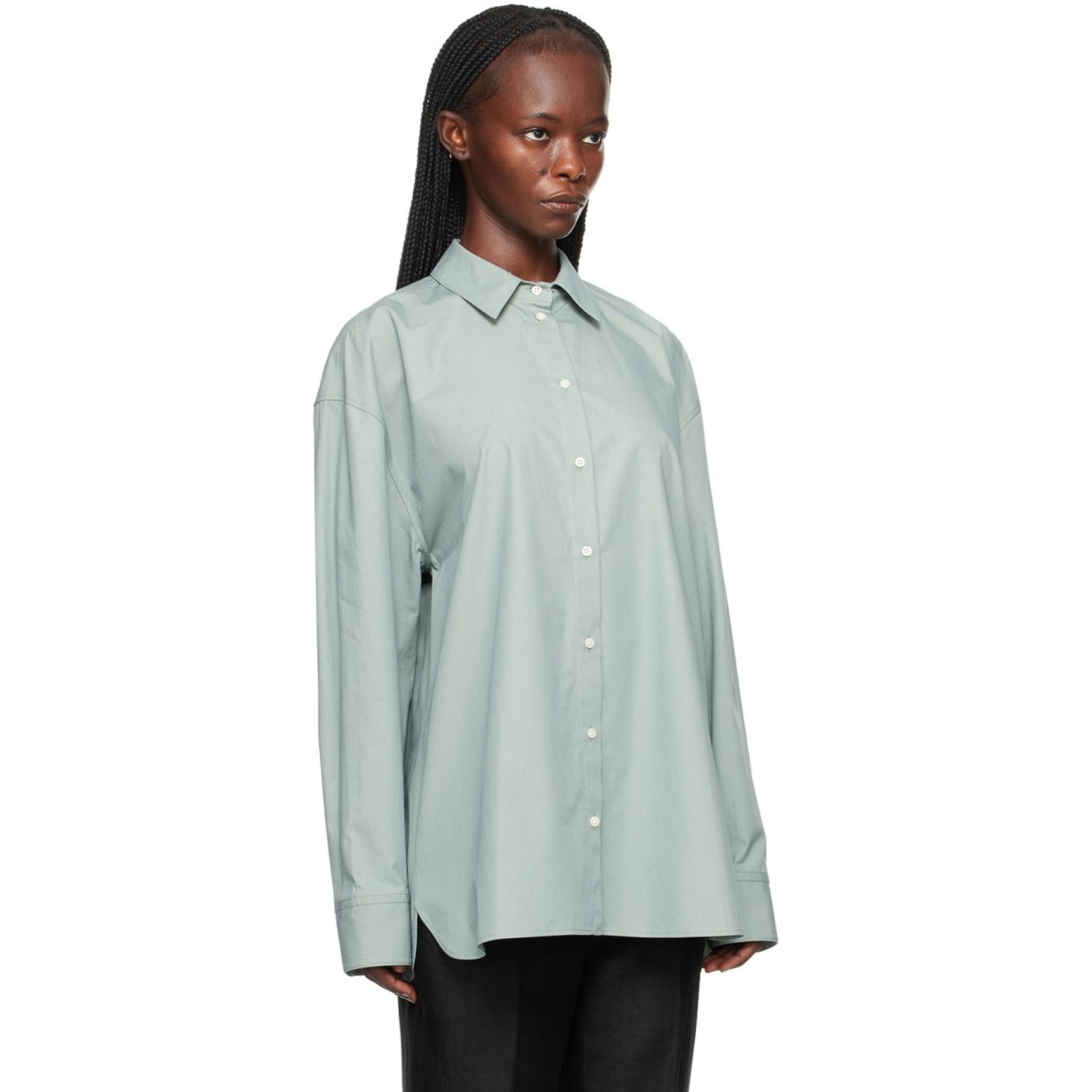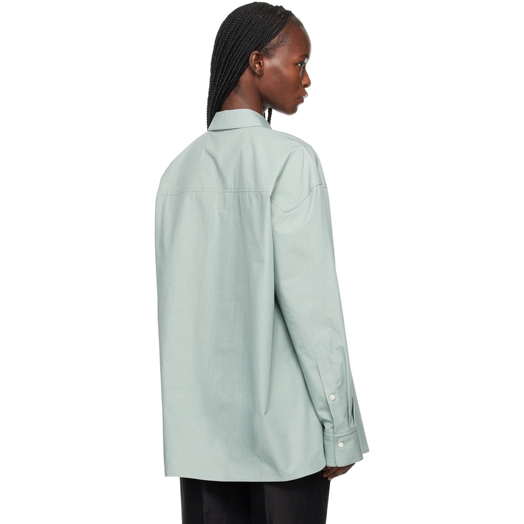 オーガニックコットンで作られた「ロウロウ スタジオ(LOULOU STUDIO)」のポプリンシャツ。ブルーとグリーンの間のような絶妙なニュアンスカラーがスタイリッシュ。シングルボタンのバレルカフスがポイントです。