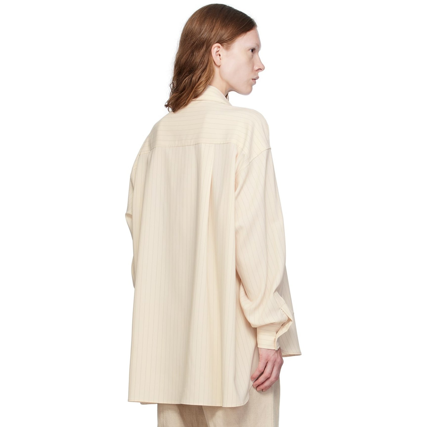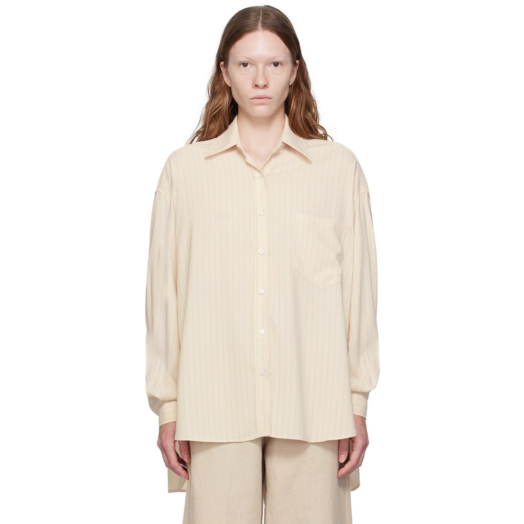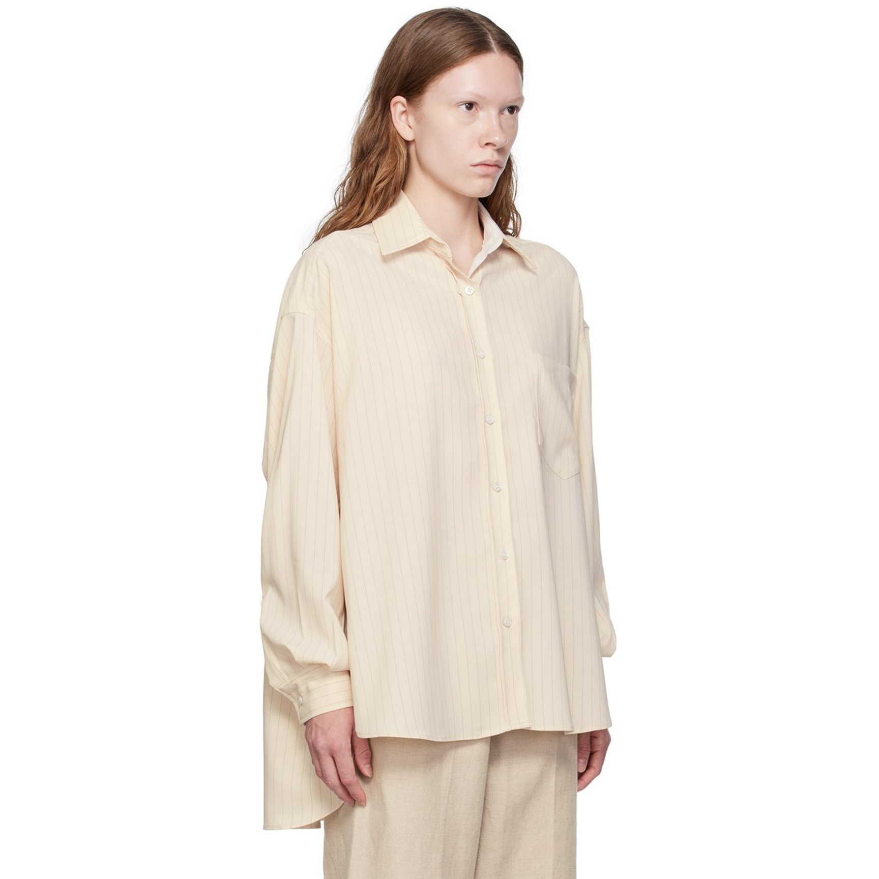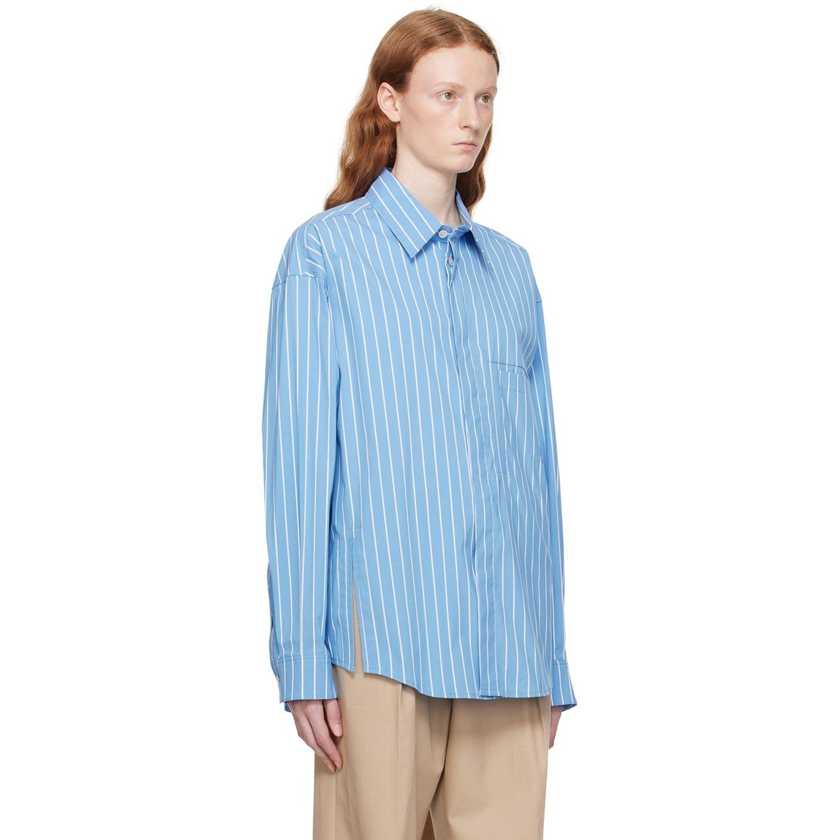 ドロップテールの裾が印象的な「フランキー ショップ(THE FRANKIE SHOP)」のシャツ。さり気なくストライプが入っており、程よく装いにリズムを加えてくれます。