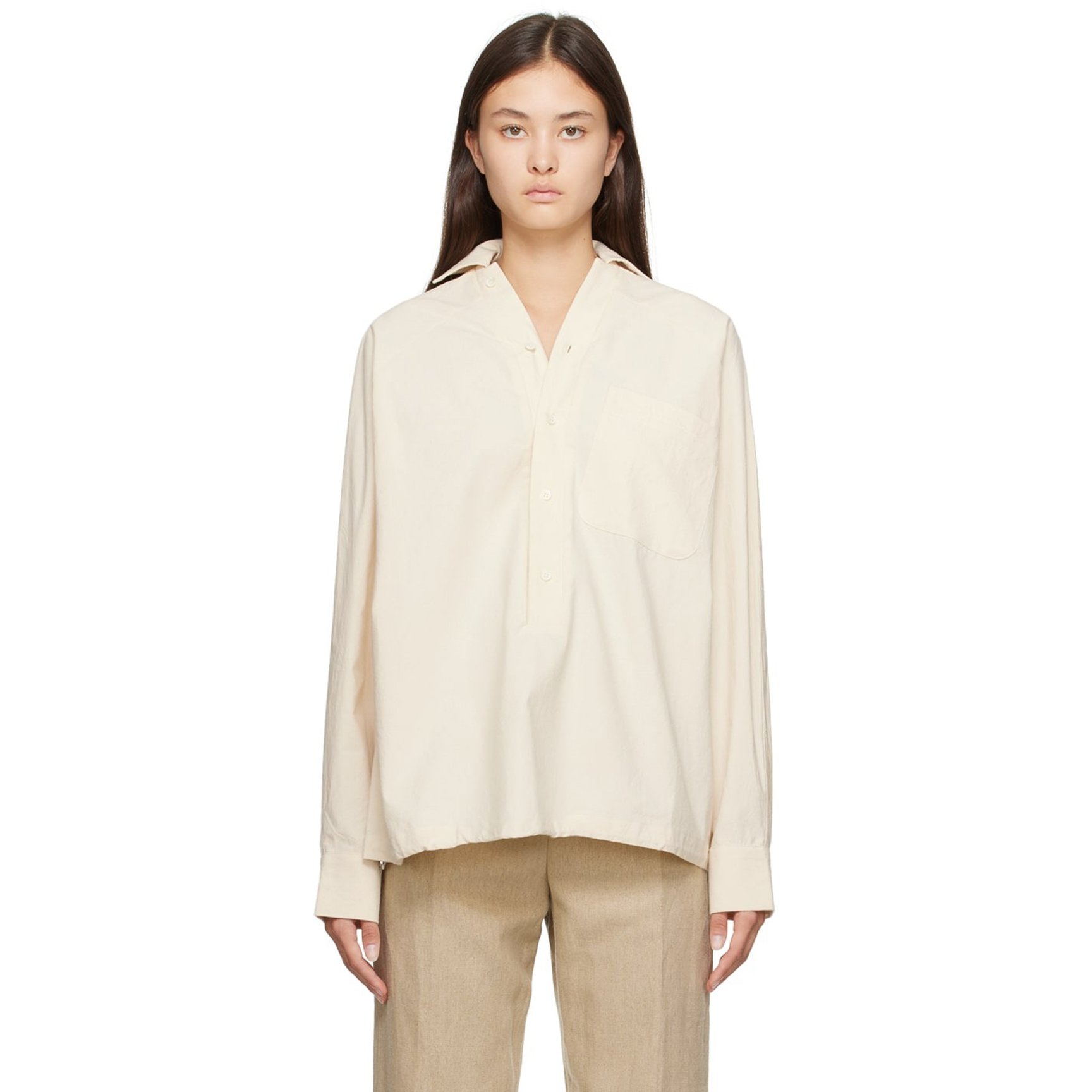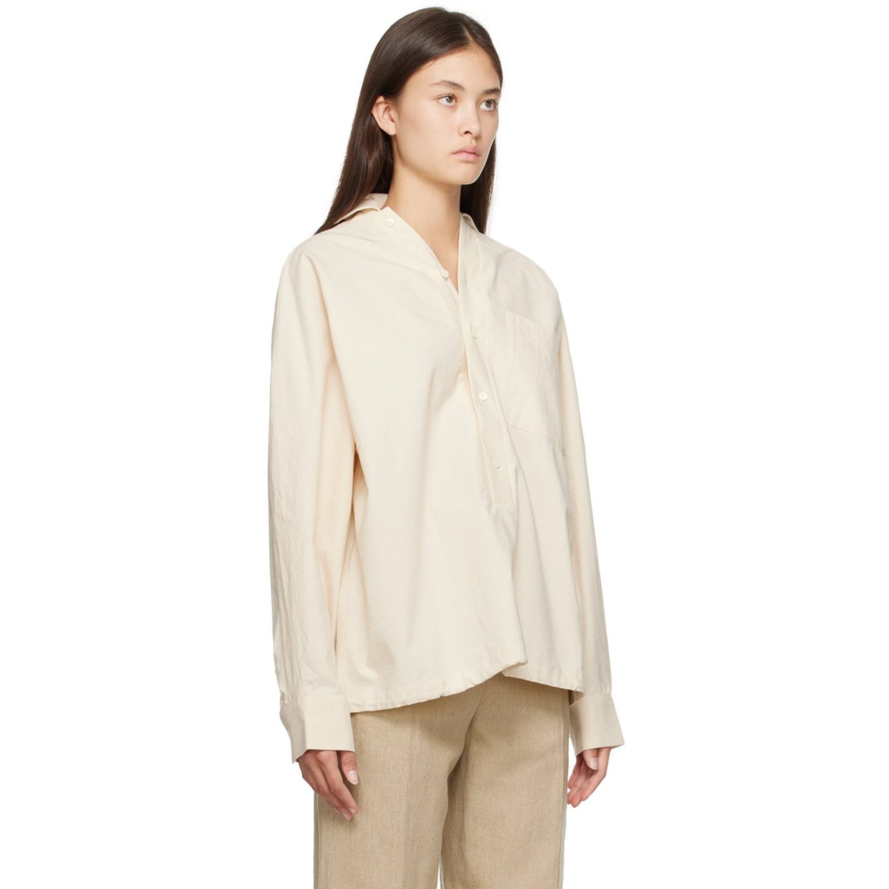 「ジャックムス(JACQUEMUS)」のシャツは裾がドローストリング仕様なため、絞ることで違った印象で楽しむことができます。ハーフボタンでラフさもありながら、貝ボタンが上品な印象をもたらします。