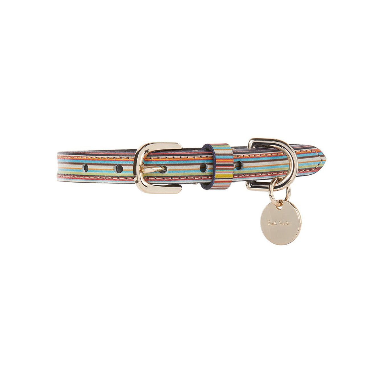 リードとあわせて是非ゲットしたい、「ポール?スミス(Paul Smith)」マルチカラーストライプの首輪。こちらもしっかりとパープルのコバ処理が施され、ゴールドのロゴチャームが凛々しく揺れ動きます。この機会に、絵になるお散歩スタイルを叶えてみてはいかが?