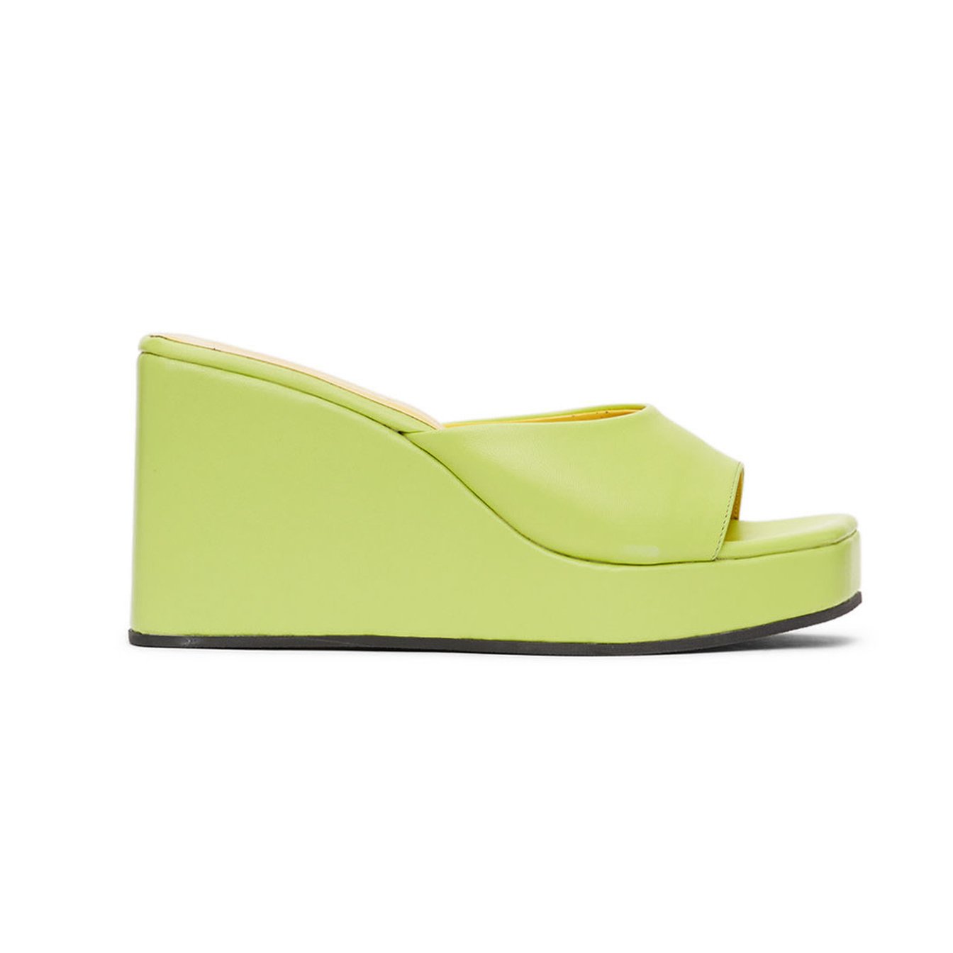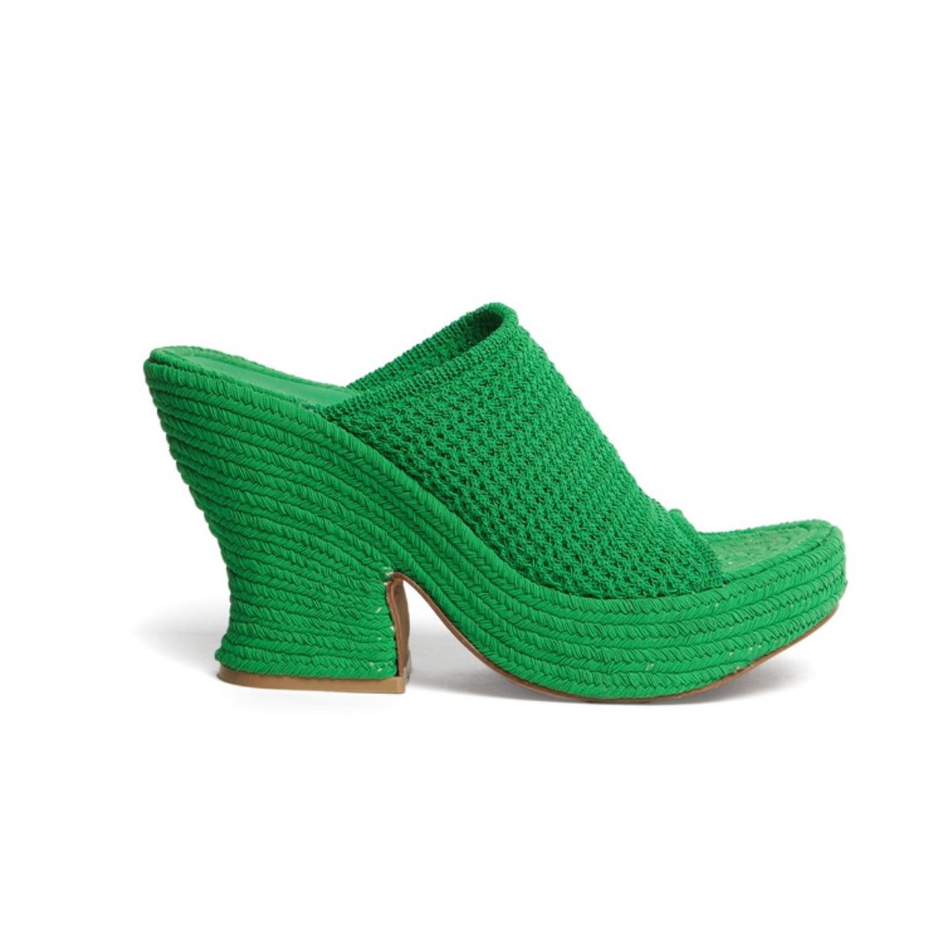 「ボッテガ?ヴェネタ」のプラットフォームミュールは今の時期にぴったりのフレッシュなグリーン。幅広のニットメッシュは足をすっぽりと包み込んでくれて摩擦もないので長時間歩いたって問題なし。彫刻的なフォルムも相まってスタイリッシュ且つ実用的なパーフェクトなプロダクト。