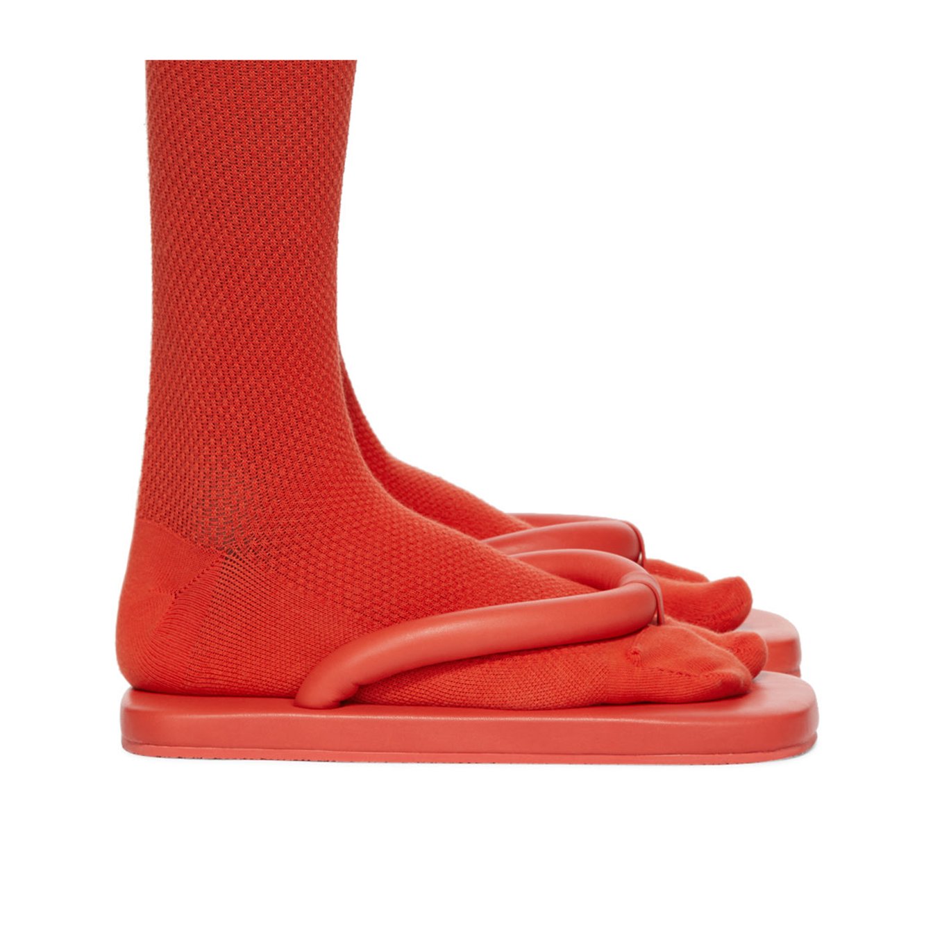 全カーフスキンで作られた朱色の滑らかなサンダルは「カンペールラボ(CAMPERLAB)」から。ここ最近トレンドとして浮上する雪駄デザインですが、ここまで華やかでパキッとした朱色は珍しい。スタイルに個性を投下してくれるアイコニックな1足はいかがでしょうか。