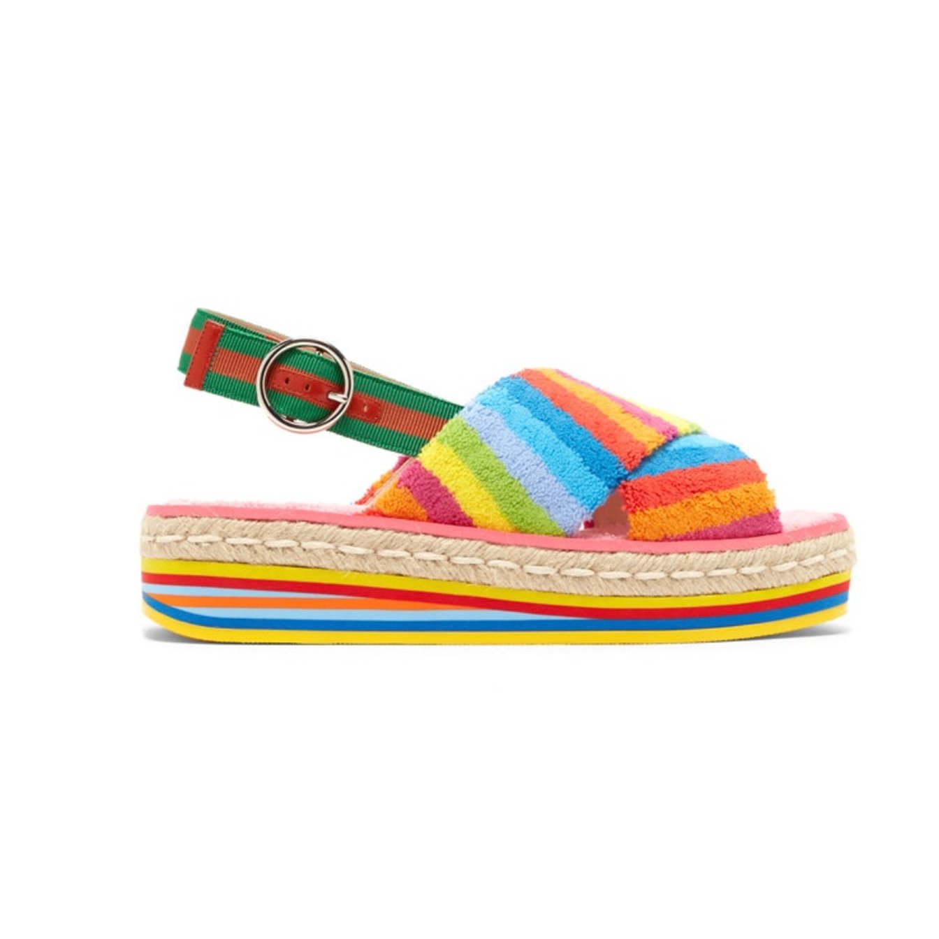 「グッチ(GUCCI)」からはポップでハッピーな一足をピックアップ。マルチカラーのプラットフォームサンダルはここぞとばかりに個性を主張。全体的にレインボーカラーを纏うシューズにさらっと配されるのは一流ブランドの証であるグリーン&レッドのウェブストライプキャンバス。