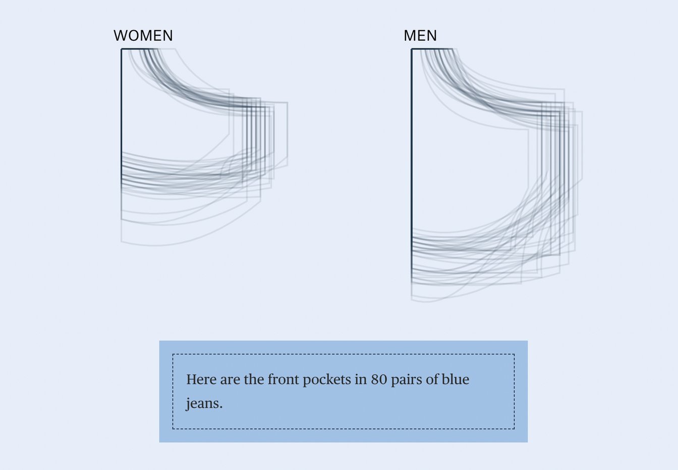 では実際に、女性のジーンズのポケットは、そんなに「使えない」のだろうか。NY発のデジタルパブリケーション『The Pudding』のビジュアルエッセイ「かつて賢人がポケットは女性に許可されていないと言った」(2018年)に興味深いデータが掲載されている。アメリカで人気の20のデニムブランドを測定した結果だ。32インチのスキニー/ストレートの計80本のデータを集め、男女のポケットサイズを比較している。