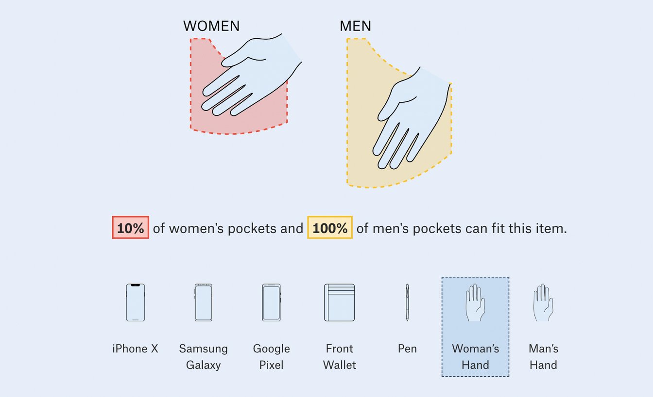 「アバクロンビー&フィッチ(Abercrombie & Fitch)」や「カルバン?クライン(Calvin Klein)」などのデニムを測定すると、平均して女性のジーンズのポケットは男性のそれよりも48%短く、6.5%狭いことが分かった。さらに同記事では、男女別のポケットに様々な日用品が収まるかどうかも検証している。iPhone Xの場合、100%の男性のポケットに収まるが、40%の女性のポケットしか収めることができない。平均的な女性の手がポケットに収まる確率もたった10%だった。