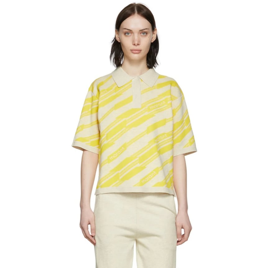 全体にジャカード編みのロゴ模様を施した「イザベル マラン エトワール(ISABEL MARANT ?TOILE)」のリブ編みポロシャツ。ボタンをスナップボタンにすることでカジュアルになりすぎず、より洗練された印象に。