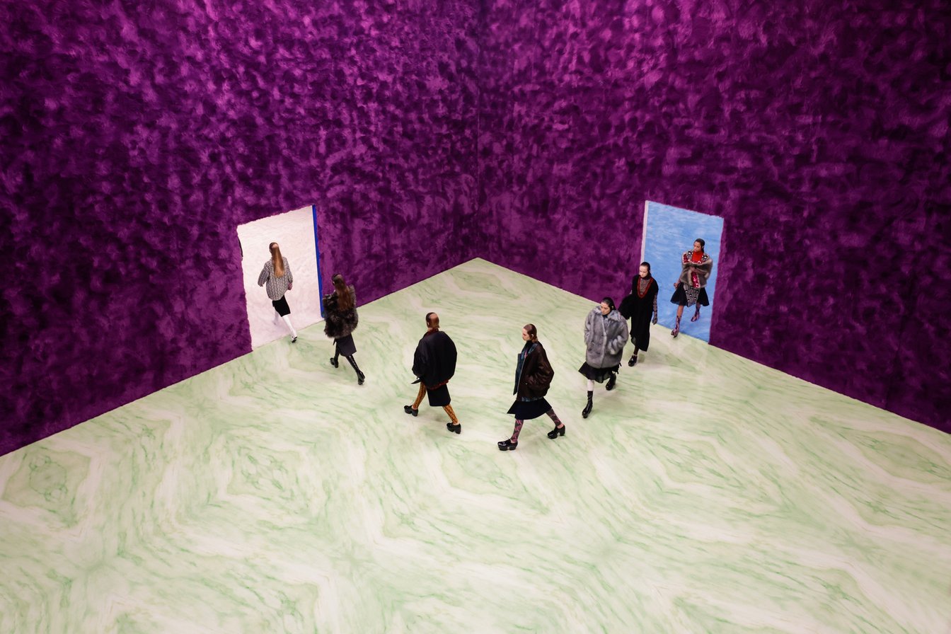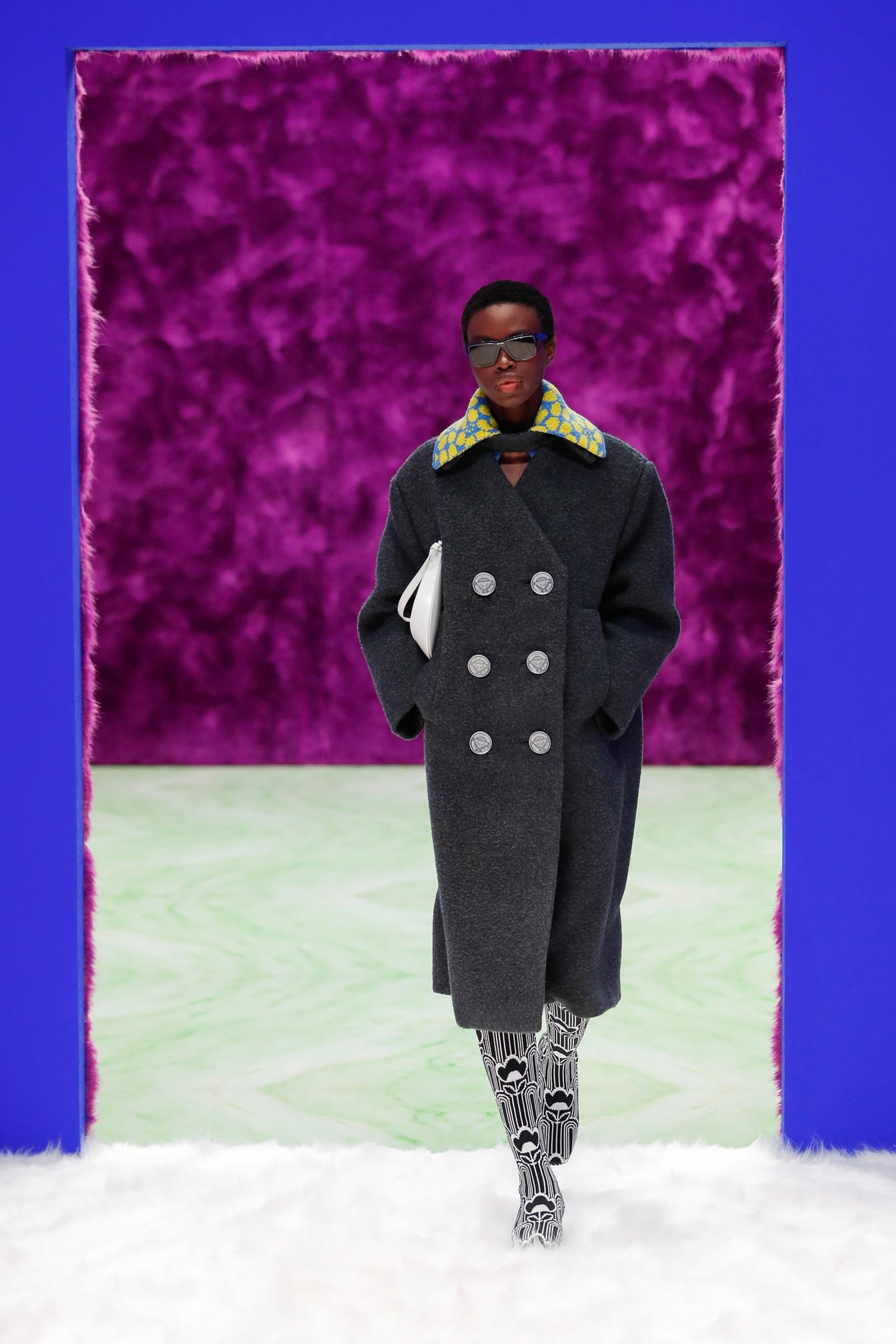 ランウェイモデルはコートの襟元を片手で掴んでいるが、これはショーのフィナーレなど公の場でミウッチャがよく見せるジェスチャーとして知られている。ここ数シーズンはプラダのショーモデルにもこのジェスチャーを取り入れており、「プロテクション」と「優美」を象徴しているという。