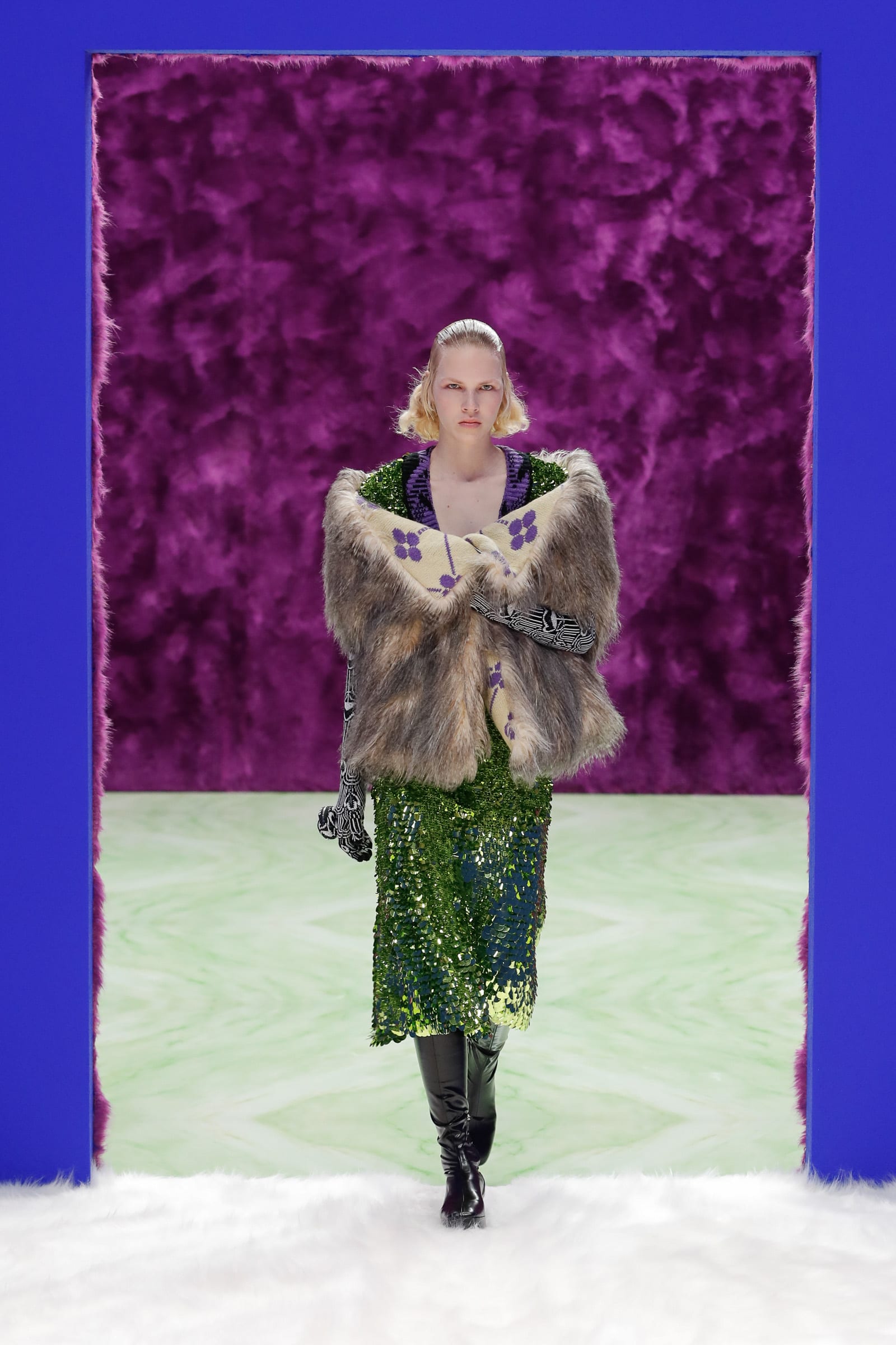 コレクションの着想源は、「THE IDEA OF CHANGE AND TRANSFORMATION, OPENING POSSIBILITIES(可能性を拡げる、変化?変形すること)」。このテーマへの答えとしてミウッチャとラフがランウェイで披露したのは、「意図」が変化していく服。オーナメントが機能的になったり、実用的なものが装飾的になったり。Vネックのイヴニングガウンはニットがあしらわれた実用的なジャンプスーツとして提案され、フォーマルな場でも活躍しそうなクラシックなテーラードコートはシークインや鮮やかなカラーリングで登場した。
