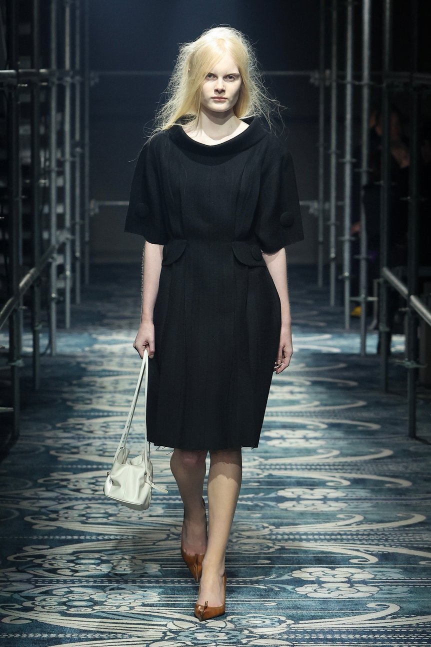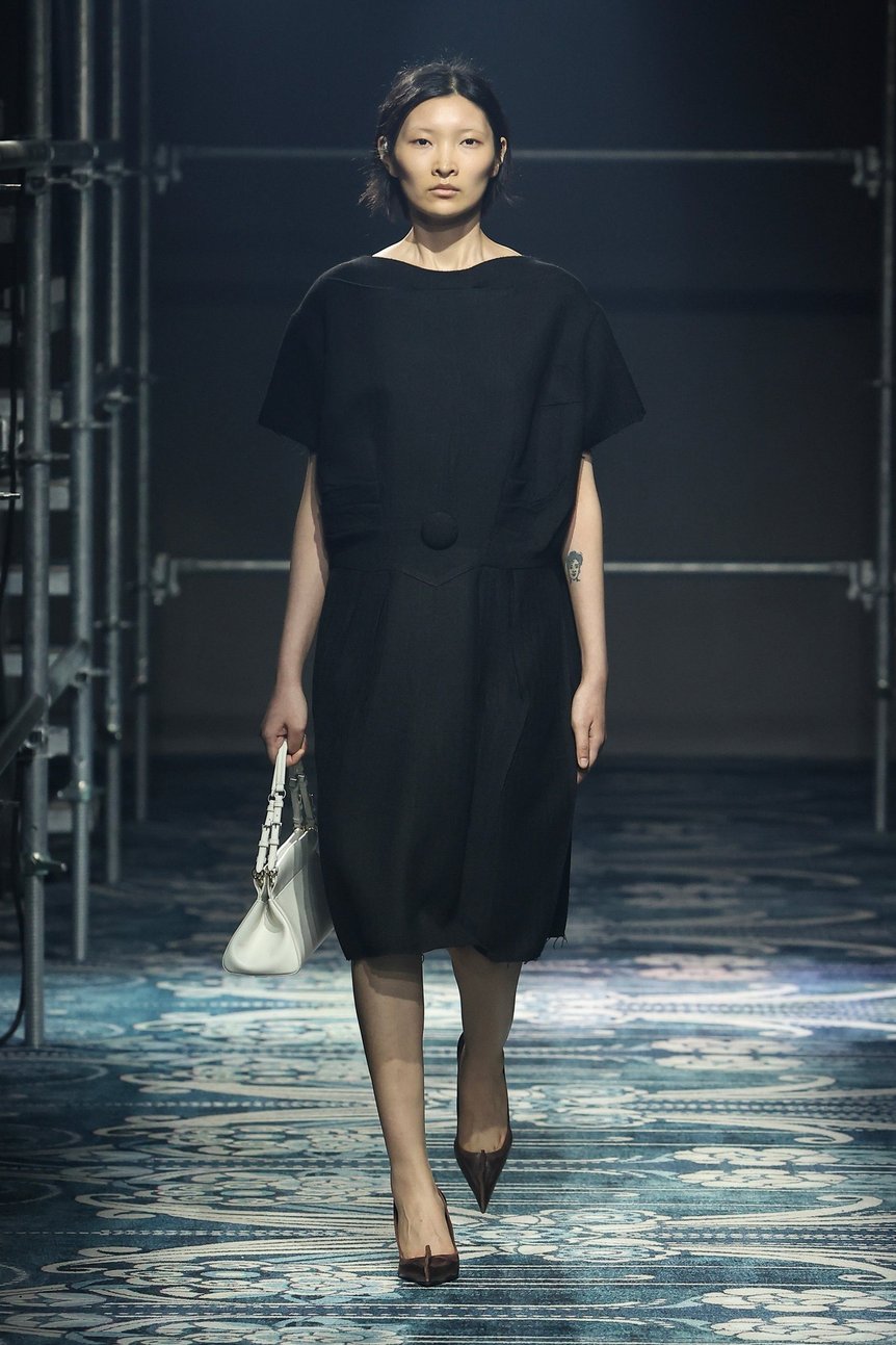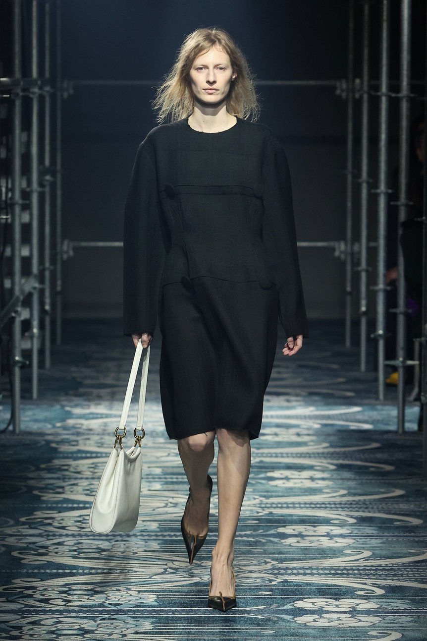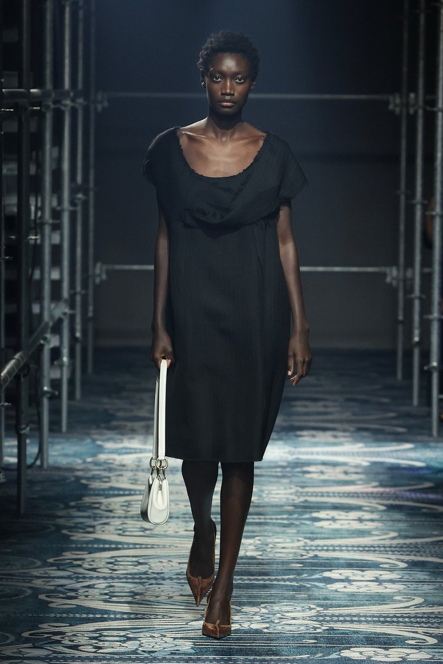 プラダはこれまでも、従来の美の概念に風穴を開けるデザインを生み出してきた。今シーズンも、「女性らしさ」の定義を再考するというテーマのもと、クラシックな要素を解体し、新たな視点を提示している。冒頭に登場した4体のリトルブラックドレス(LBD)は、単なる"女性を魅力的に見せる服"の象徴ではなく、LBDのステレオタイプから離れ、解放的な服へと変貌。ウエストが絞られた体に沿うラインではなくゆったりとしたシルエットに、切りっぱなしの裾、未完成のような縫い目の露出、首元の襟は浮いていたり、シワをあえて刻んだ生地は、近代ファッション史におけるLBDが社会的に果たしてきた"完璧さ"や"洗練さ"とは異なる方向性を打ち出している。