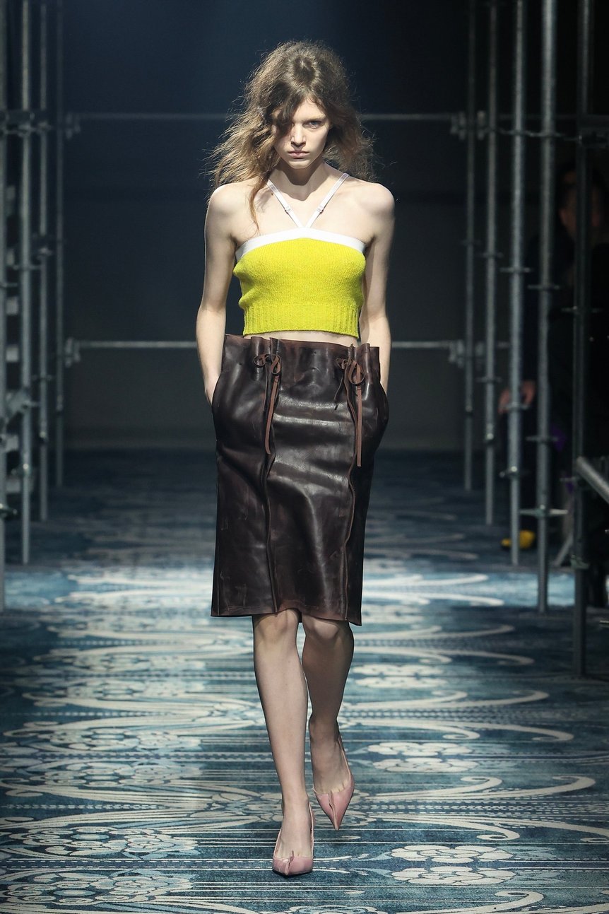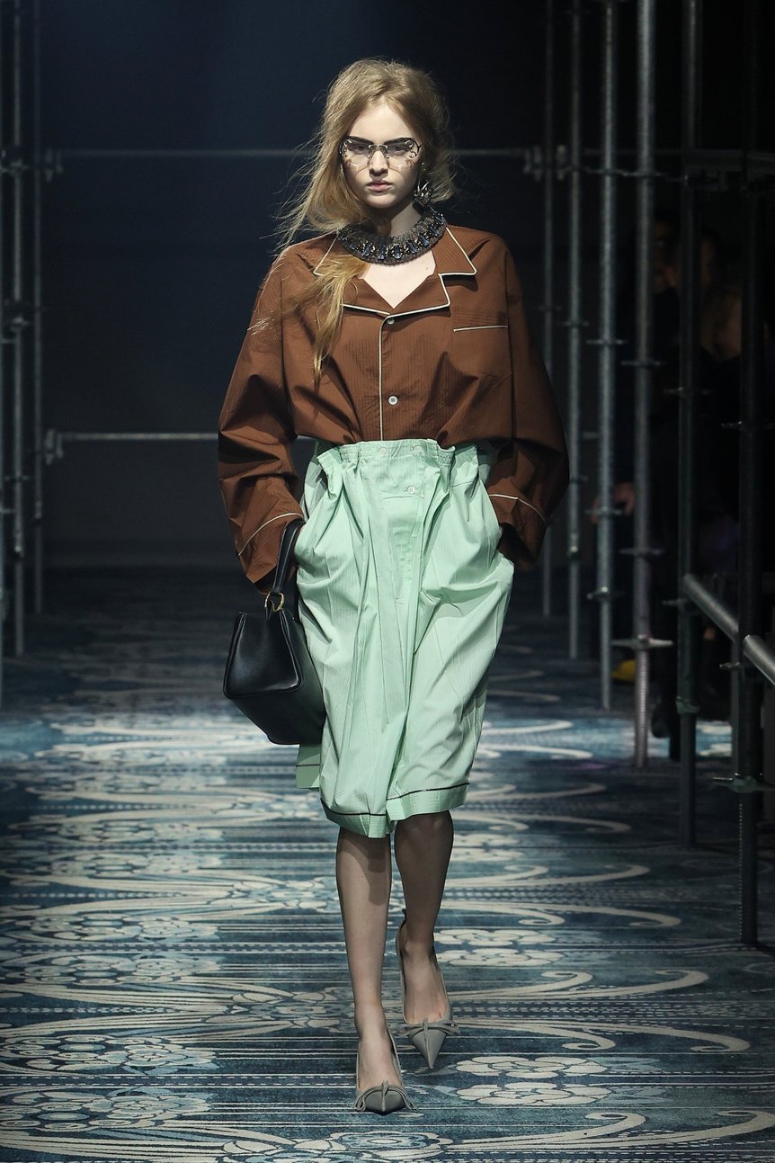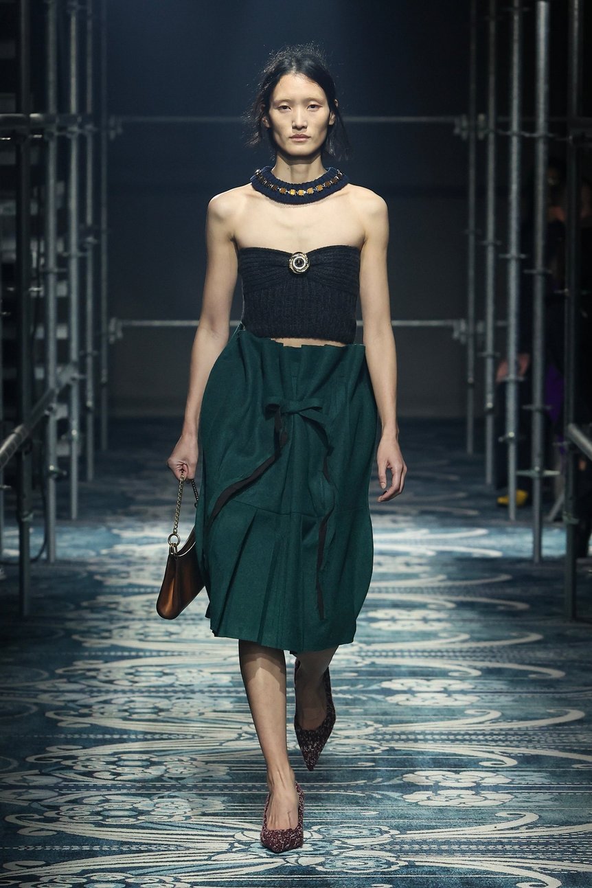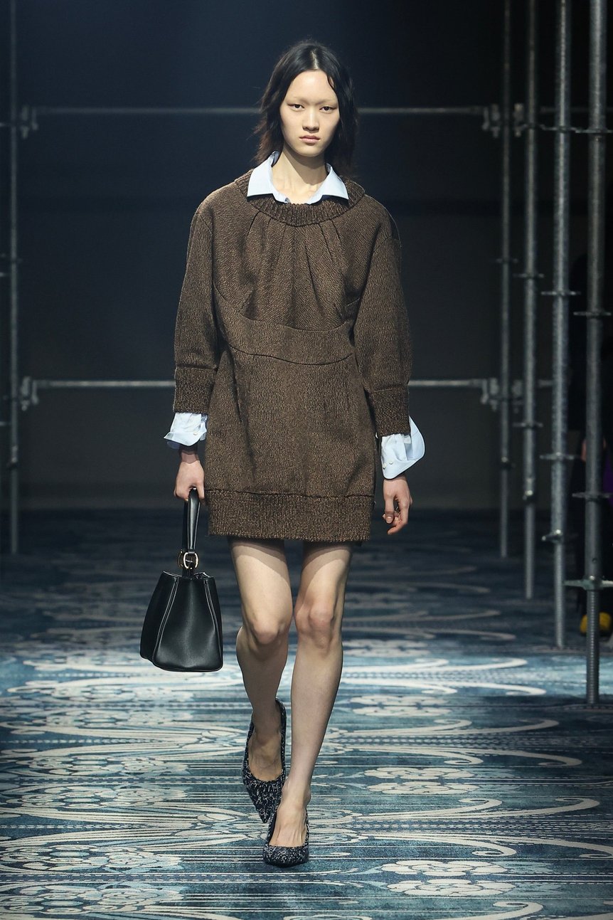 プラダはこれまでも、従来の美の概念に風穴を開けるデザインを生み出してきた。今シーズンも、「女性らしさ」の定義を再考するというテーマのもと、クラシックな要素を解体し、新たな視点を提示している。冒頭に登場した4体のリトルブラックドレス(LBD)は、単なる"女性を魅力的に見せる服"の象徴ではなく、LBDのステレオタイプから離れ、解放的な服へと変貌。ウエストが絞られた体に沿うラインではなくゆったりとしたシルエットに、切りっぱなしの裾、未完成のような縫い目の露出、首元の襟は浮いていたり、シワをあえて刻んだ生地は、近代ファッション史におけるLBDが社会的に果たしてきた"完璧さ"や"洗練さ"とは異なる方向性を打ち出している。