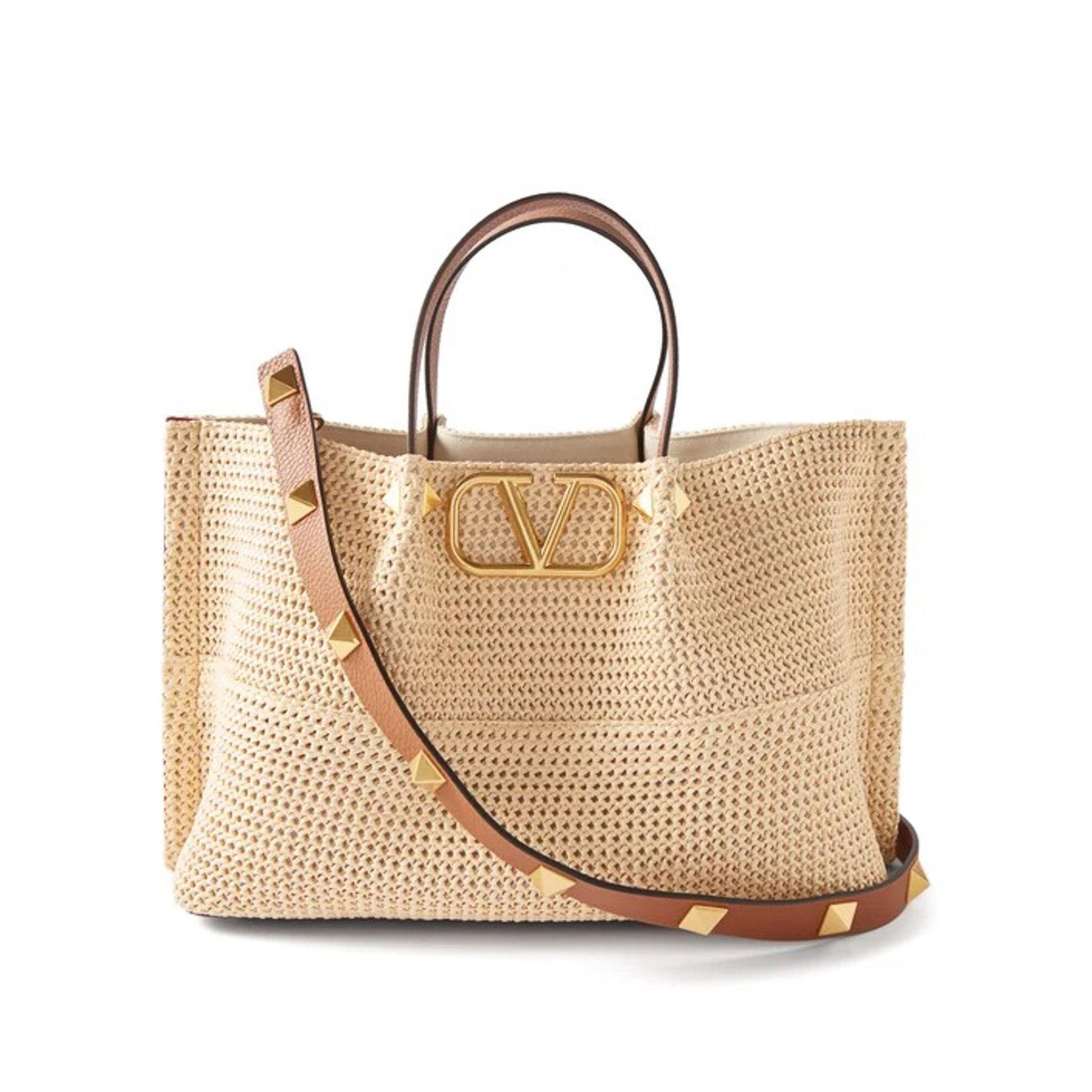 ゴールドのロゴプレート「ヴァレンティノ ガラヴァーニ(VALENTINO GARAVANI)」の大きめなバスケットバッグ。タンレザーのトップハンドルとショルダーベルトにはシグネチャーのローマンスタッズをあしらい、ブランドの魅力をぎゅっと詰めたデザインです。