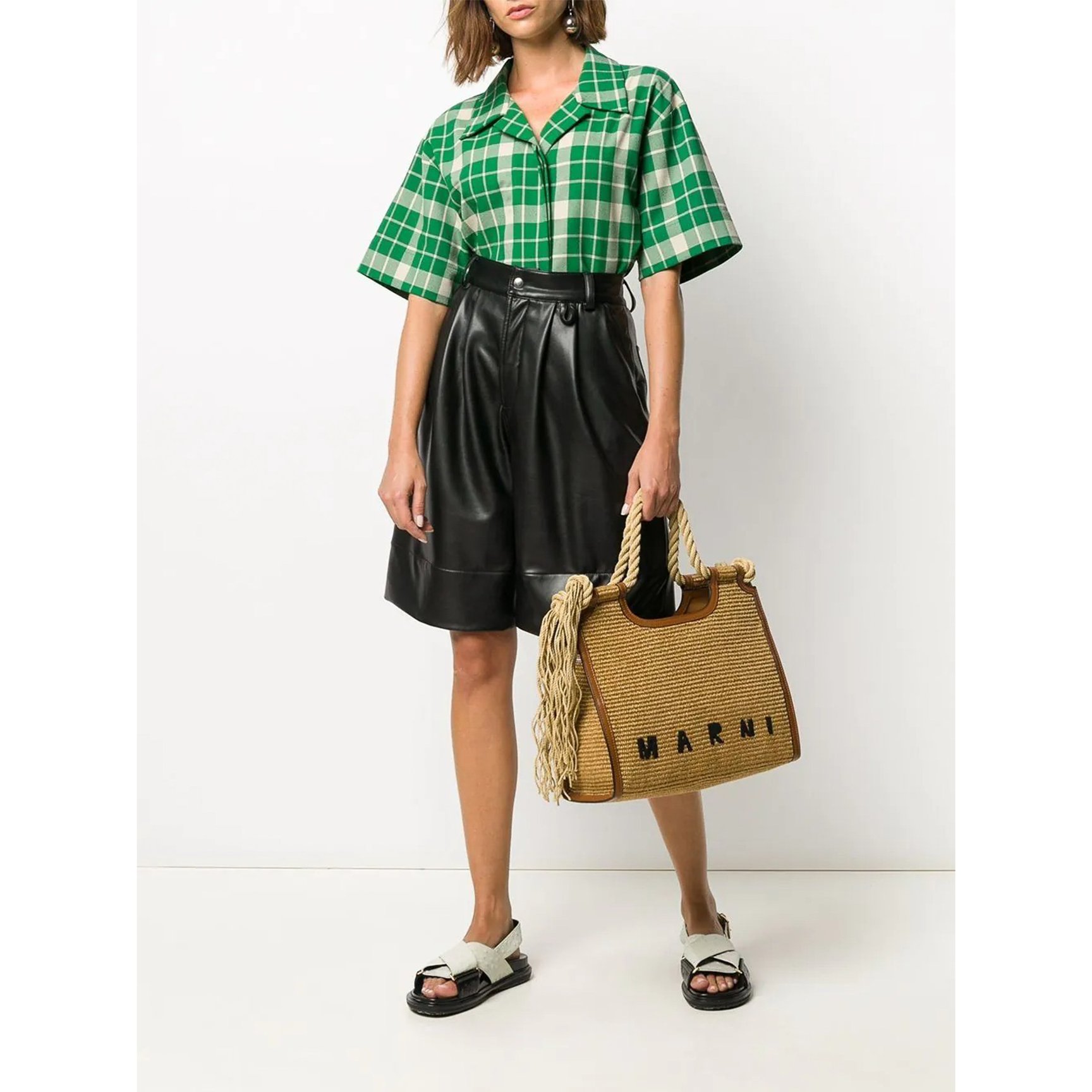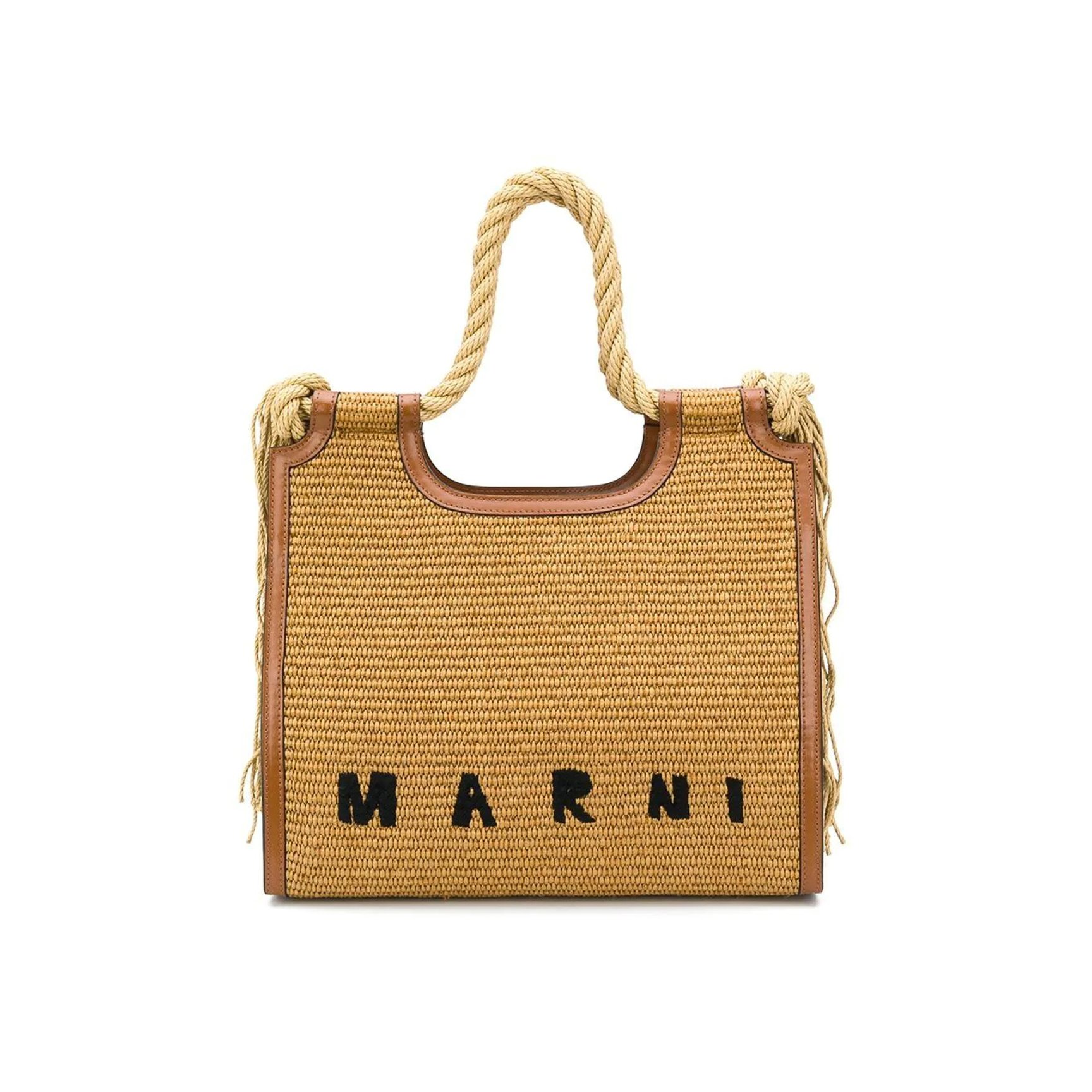 フロントにハンドペイントのロゴをあしらった「マルニ(MARNI)」のバッグ。ロープハンドルの先端をほぐして、フリンジのようにしたディティールのバッグは、持つだけでボーホーシックなスタイルに仕立ててくれます。