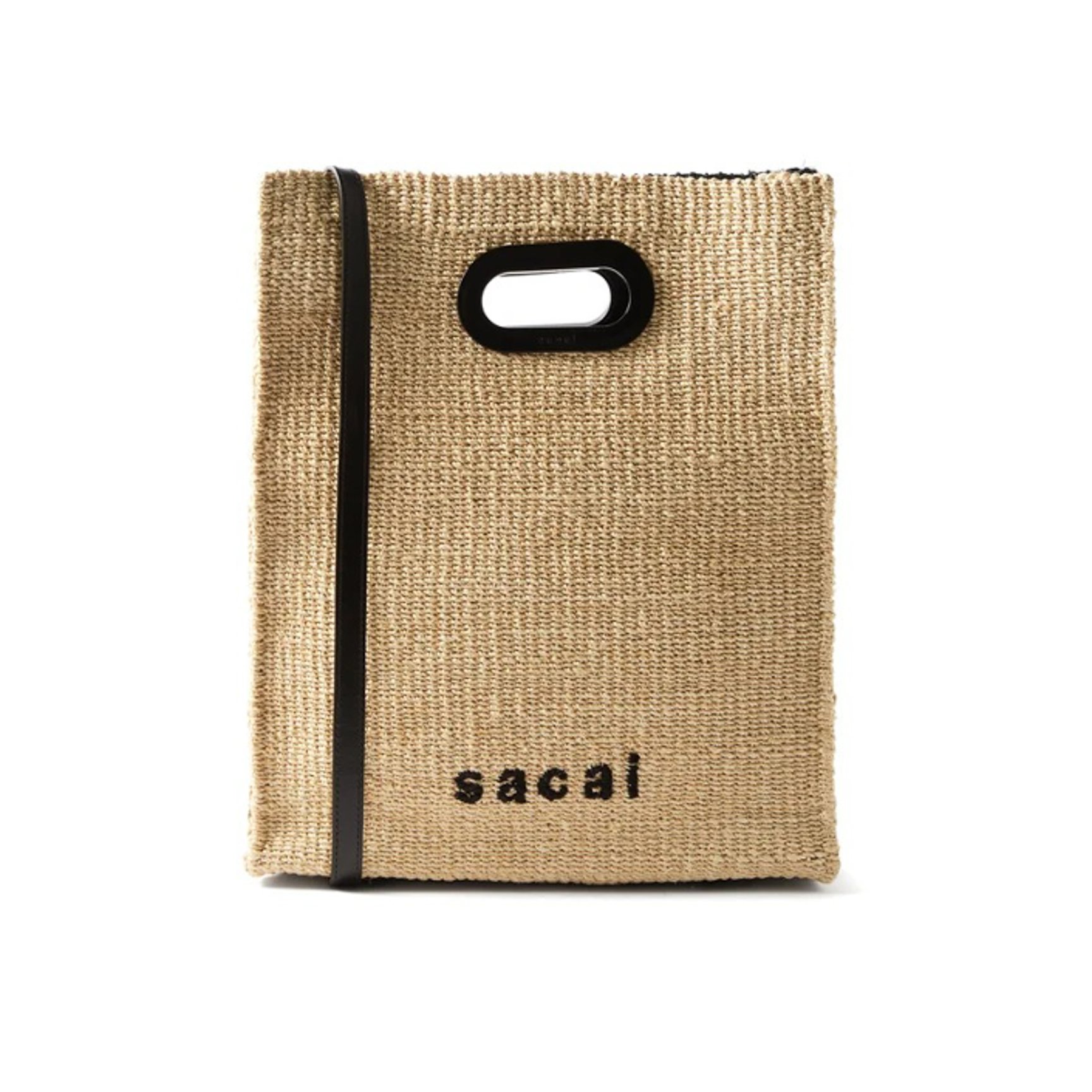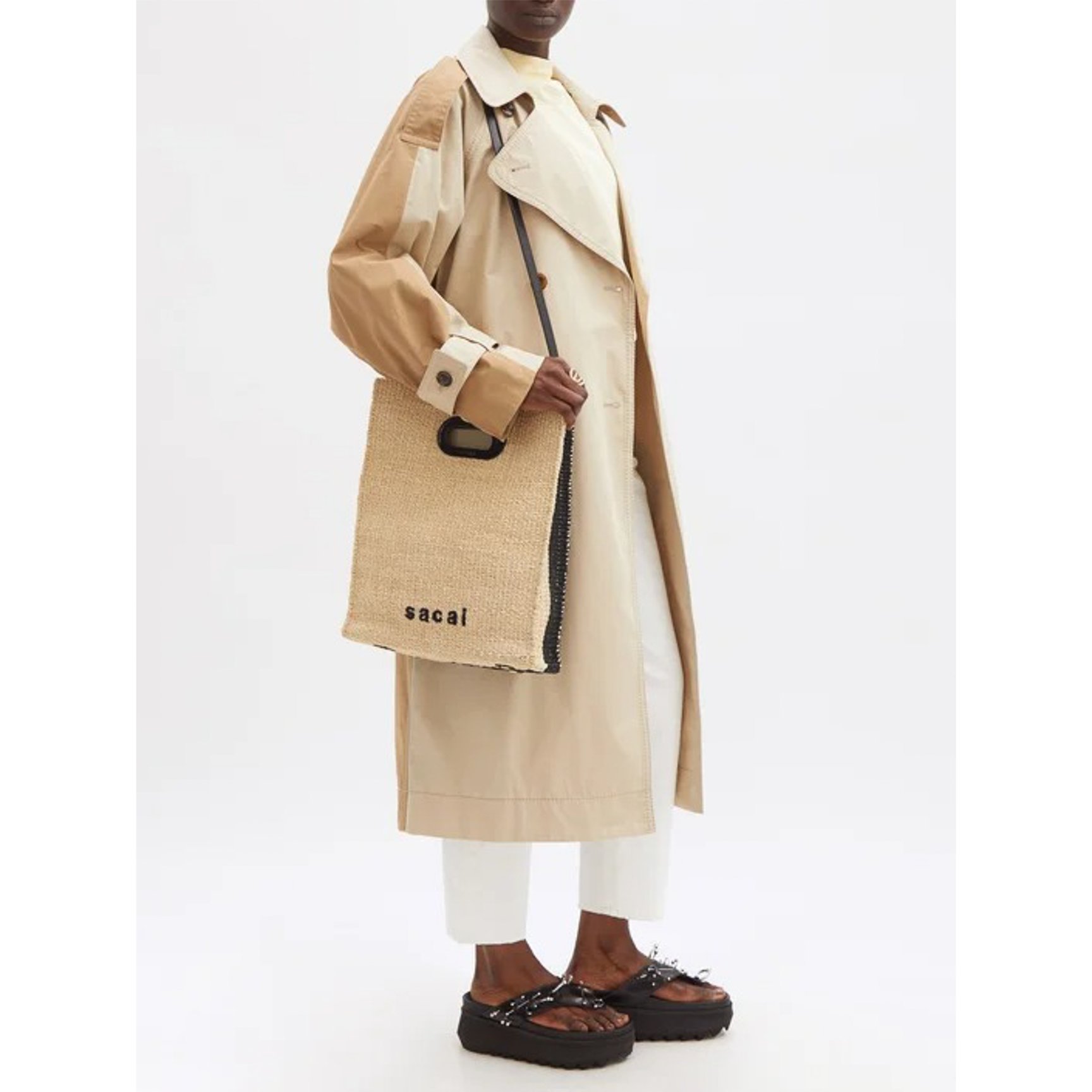 片面はナチュラル、もう片面はブラックとパネル仕立てにしたバッグは「サカイ(sacai)」のもの。ショッピングバッグのようなフォルムに、ロゴを刺繍で施したユニークなデザインです。
