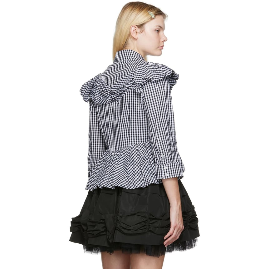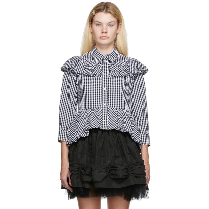 デコルテと腰に複数のフリルをあしらった「シモーン?ロシャ(Simone Rocha)」のブラウス。モノトーンのギンガムチェック柄の生地を使用することで、甘くなりすぎない絶妙なバランスに。