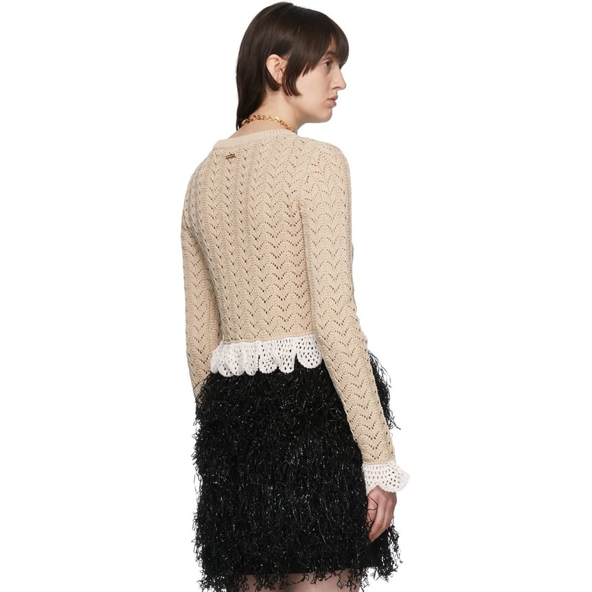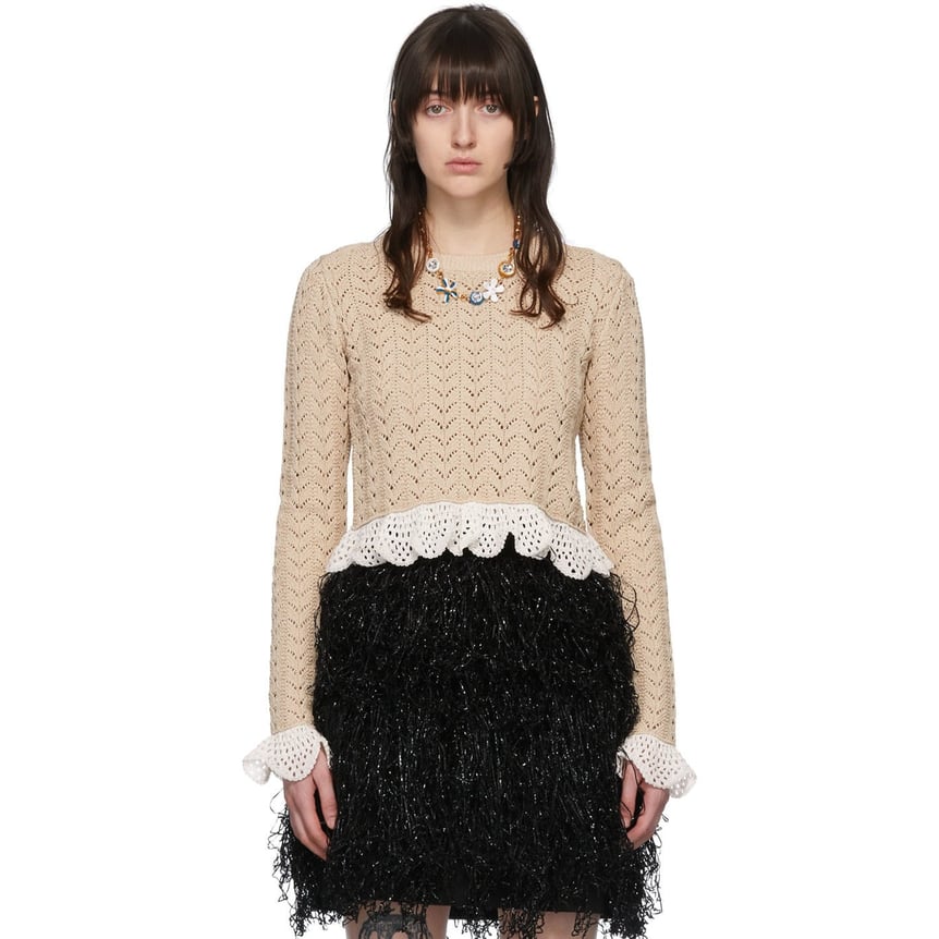 クロシェ編みのニットとポインテールニットのフリルの組み合わせで、ノスタルジックなムード漂う「JW アンダーソン(JW ANDERSON)」のトップス。裾がクロップド丈でスタイルアップが叶います。