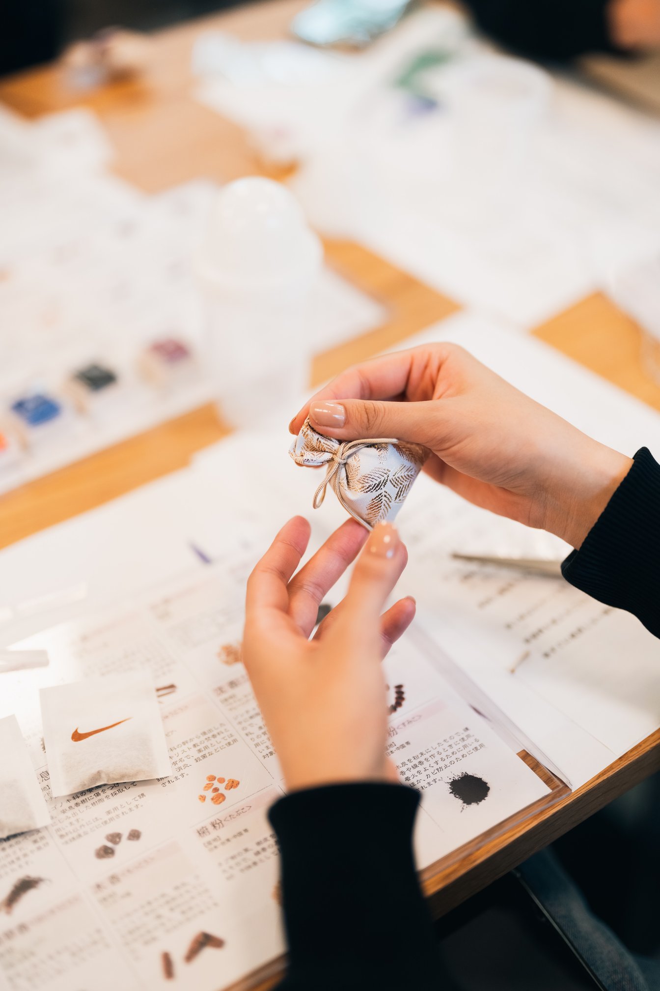 出来上がった匂い袋(金襴生地や縮緬生地に天然香料を詰めて作るお香)を手に、香りを嗅いでみると、不思議と心がスッと落ち着きました。匂い袋は、時間が経つにつれ香りが変化するのも楽しみのひとつ。レースの思い出を香りとして残せるのは嬉しいですね。