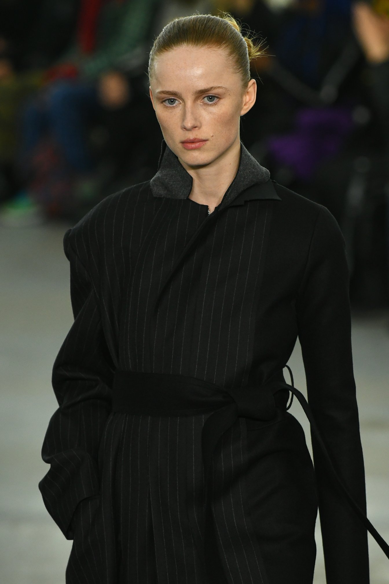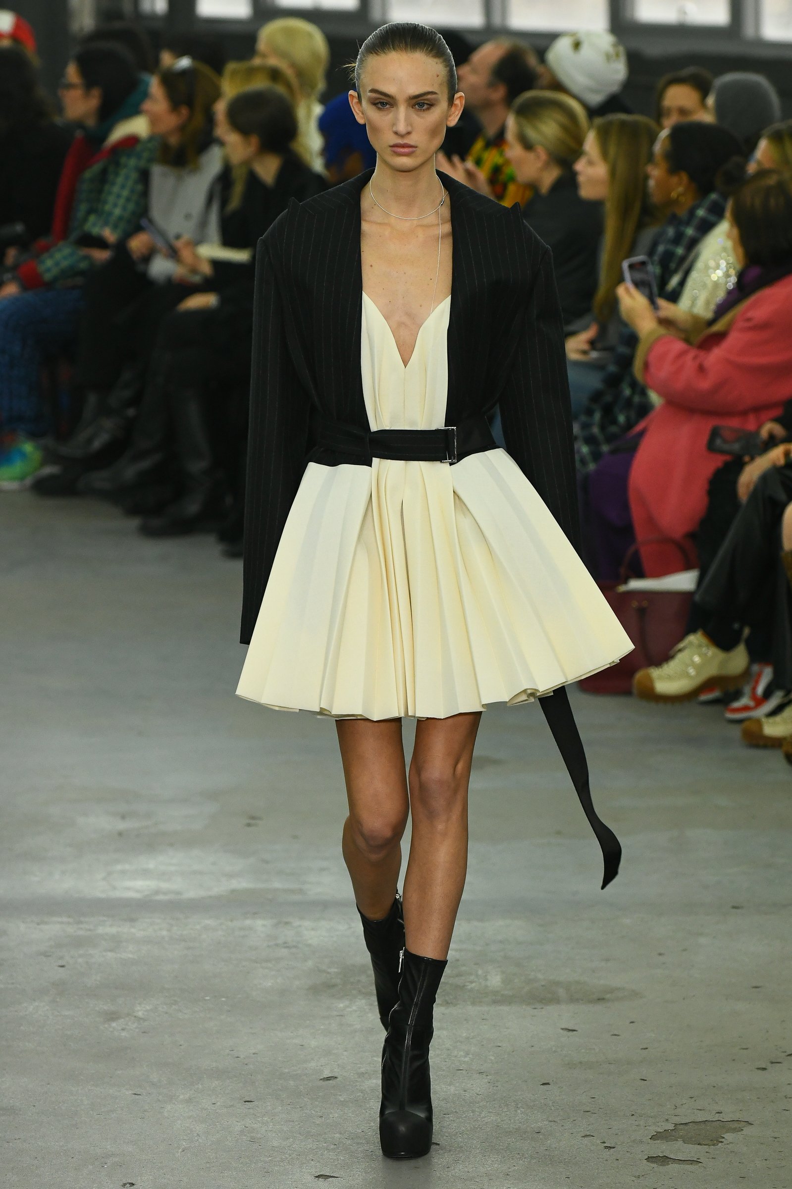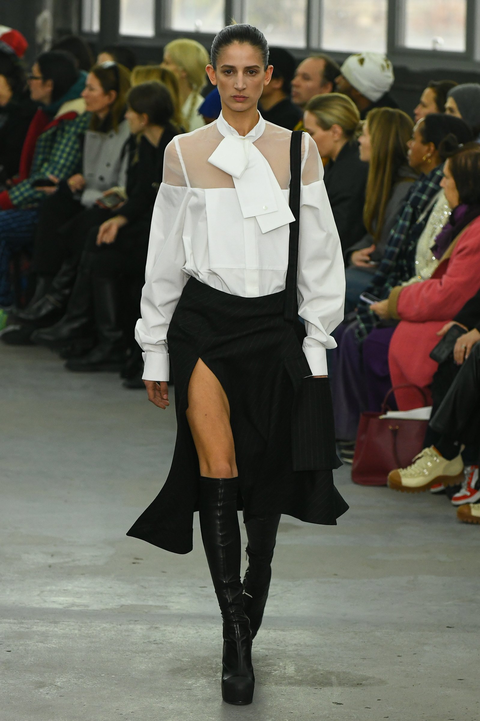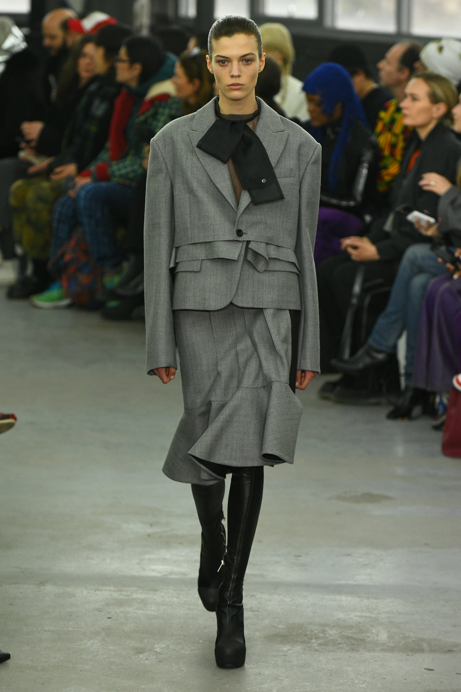 ファーストルックは、チョークストライプのチェスターコートをドレスのようにスタイリング。右半身にゆとりをもたせ、ショルダーラインも右だけドロップさせたアシンメトリーのパターンで、左側には無地の素材を組み合わせていた。サカイのシューズといえば、これまでボリュームのあるウェッジソールが多かったが、今回はプラットフォームのタイトなストレッチブーツがメインとなった。