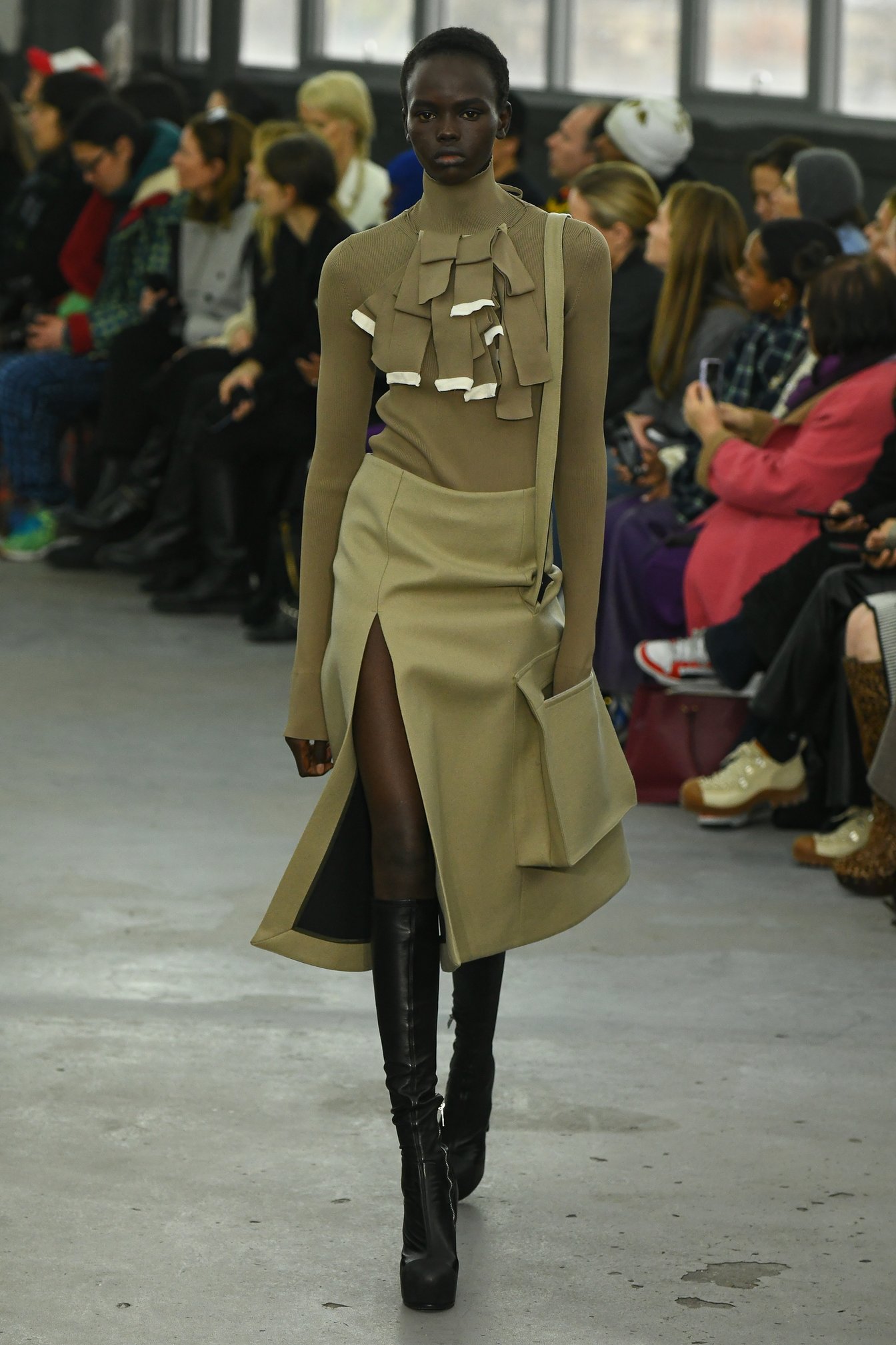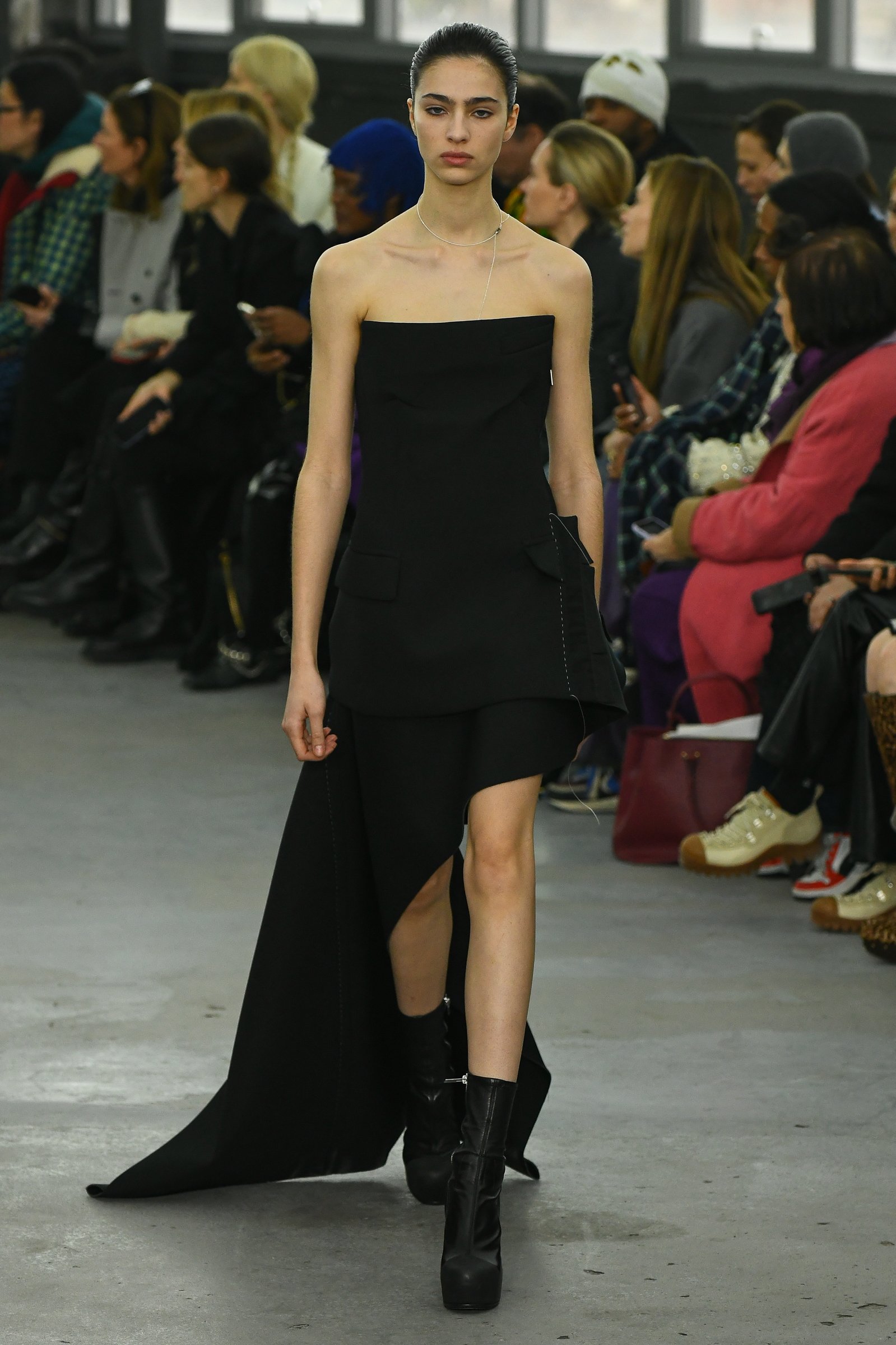 特徴的だったのは、ハンドバッグストラップのディテール。バッグを肩に掛けるようなデザインで裾を引き上げ、ドレープを生み出すと同時にポケットの存在を主張していた。