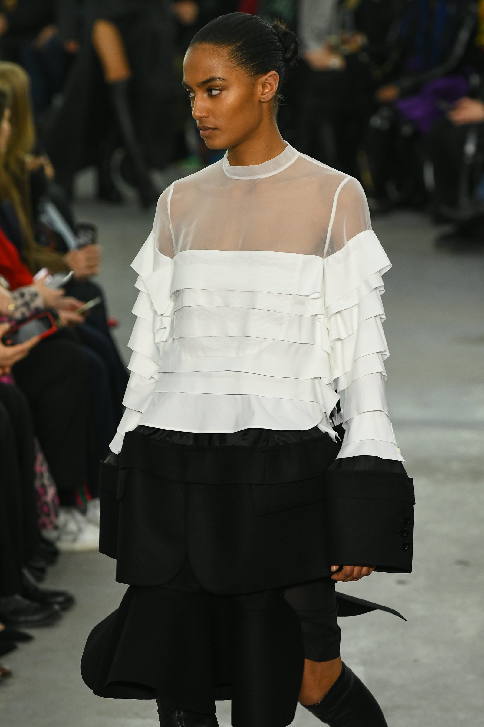 オーセンティックなデザインにハサミを入れて既存の形を壊しながら、新しいシルエットを作る。「常識にとらわれずにチャレンジし続ける」という姿勢でサカイの考えるエレガンスや美しさを探求したという。ブラウスのボディ部分を切り取ってボウタイに仕立てたり、従来のパターンを縦や横に刻んで重ねることでフリルに見立てたり。パーツを寄せることによって生まれた余白には、シフォンなど異なるテクスチャーの素材を足した。