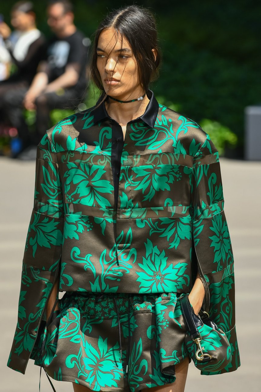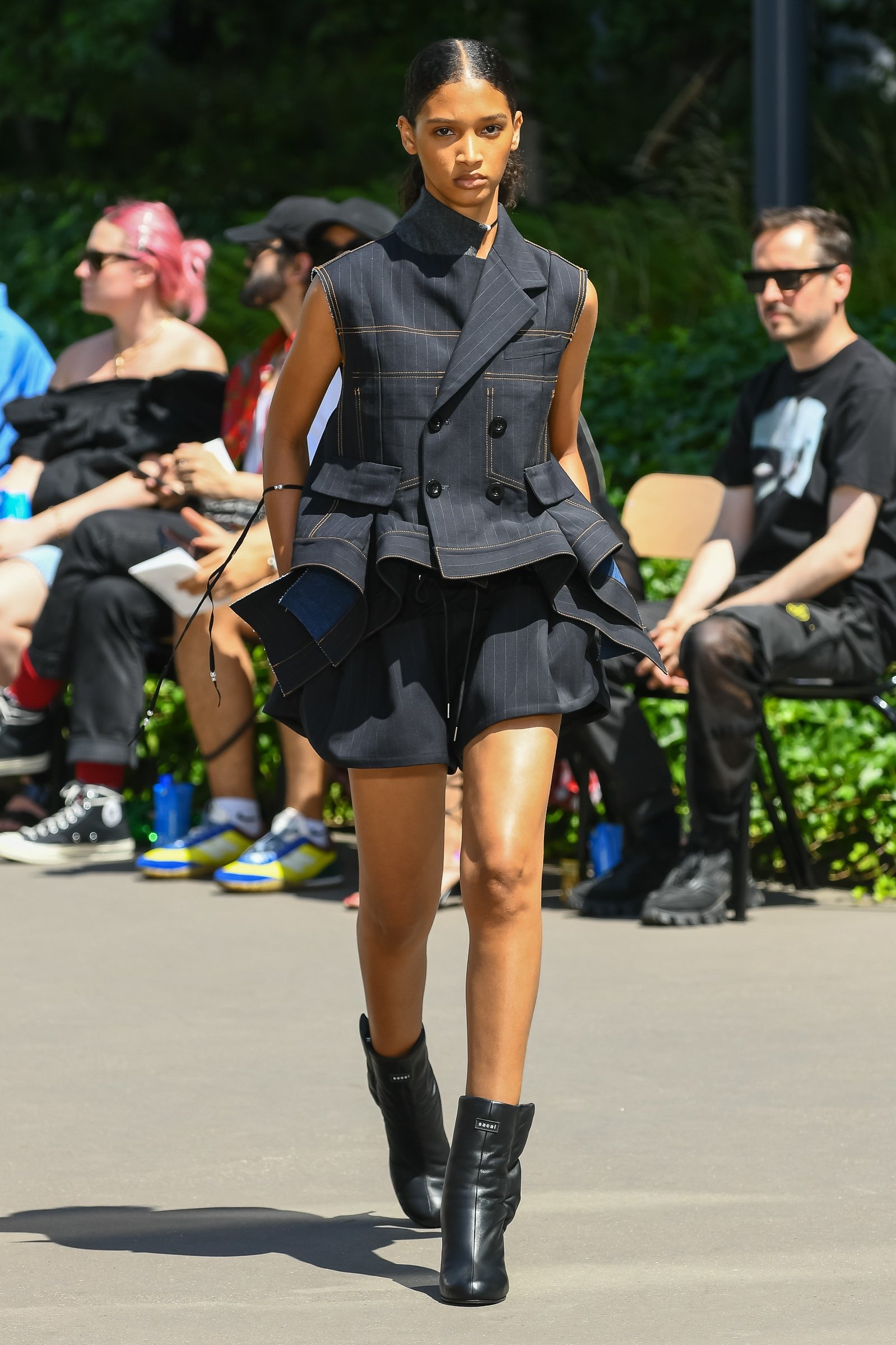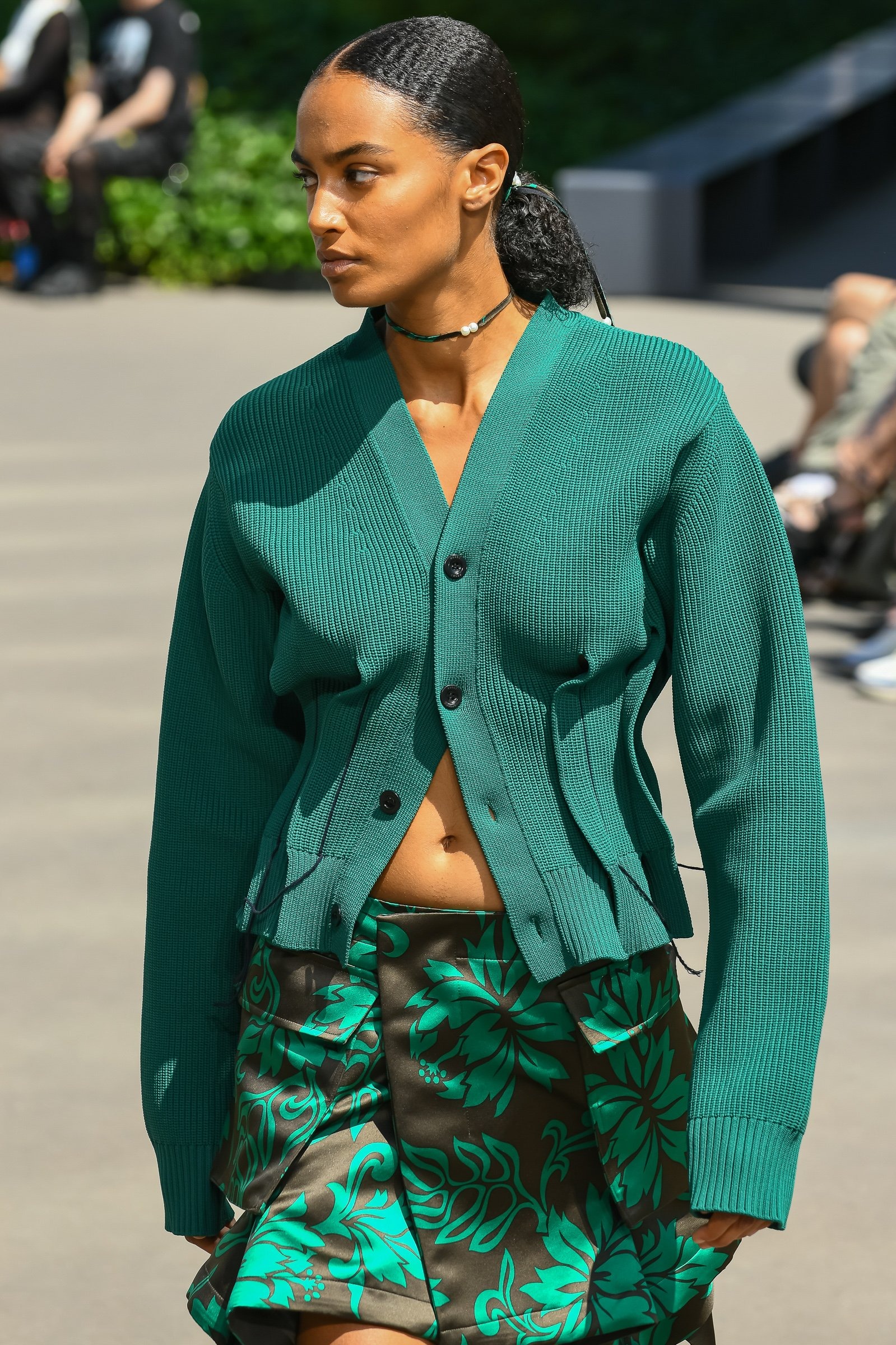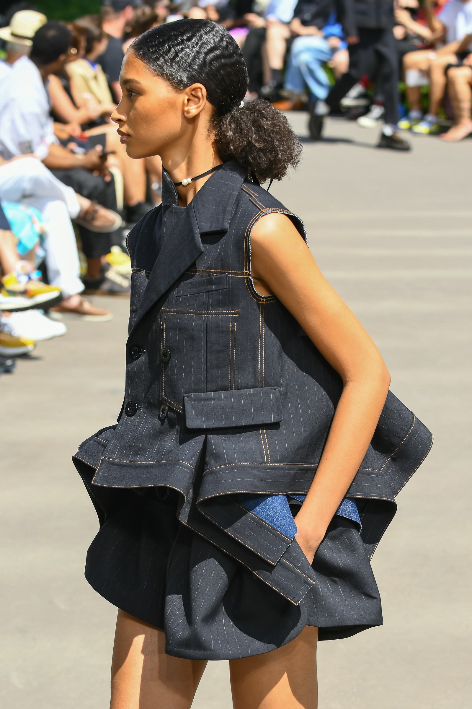 サカイに欠かせないプリーツは、細かな直線的なものではなく、少し捻って曲線的なニュアンスを伴いスカルプチュアルなシルエットを生み出したり、ノースリーブのトレンチコートやジャケットの首元からAラインに広がるシルエットを作る。ペプラムスカートやバルーン気味のショートパンツなどを合わせ、"ボリュームの実験"というプレイフルな概念で新しいシェイプを構築した。