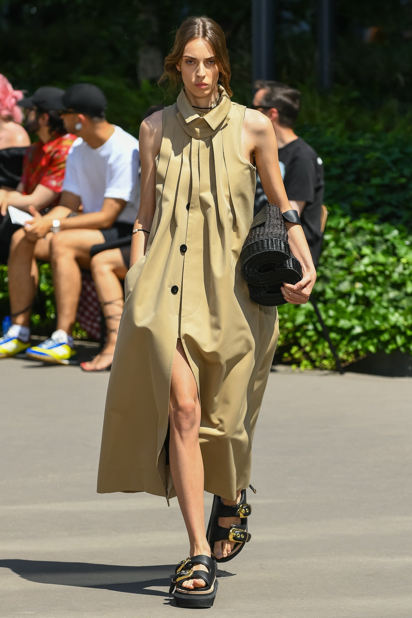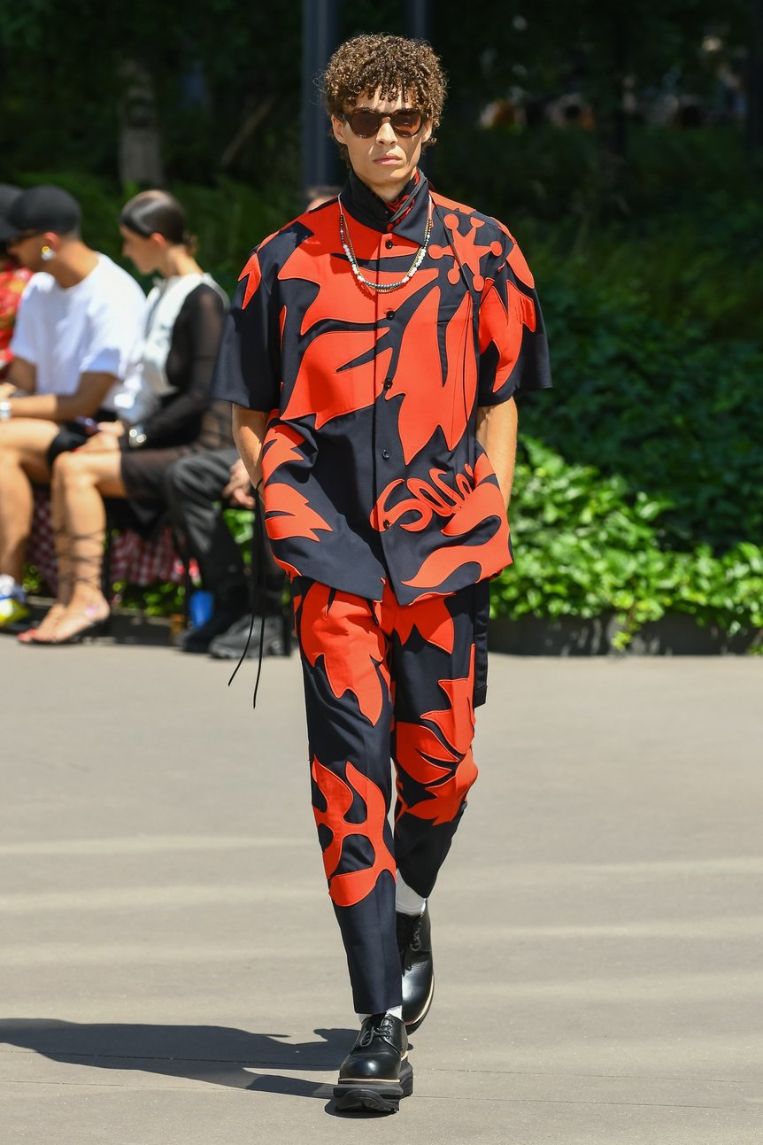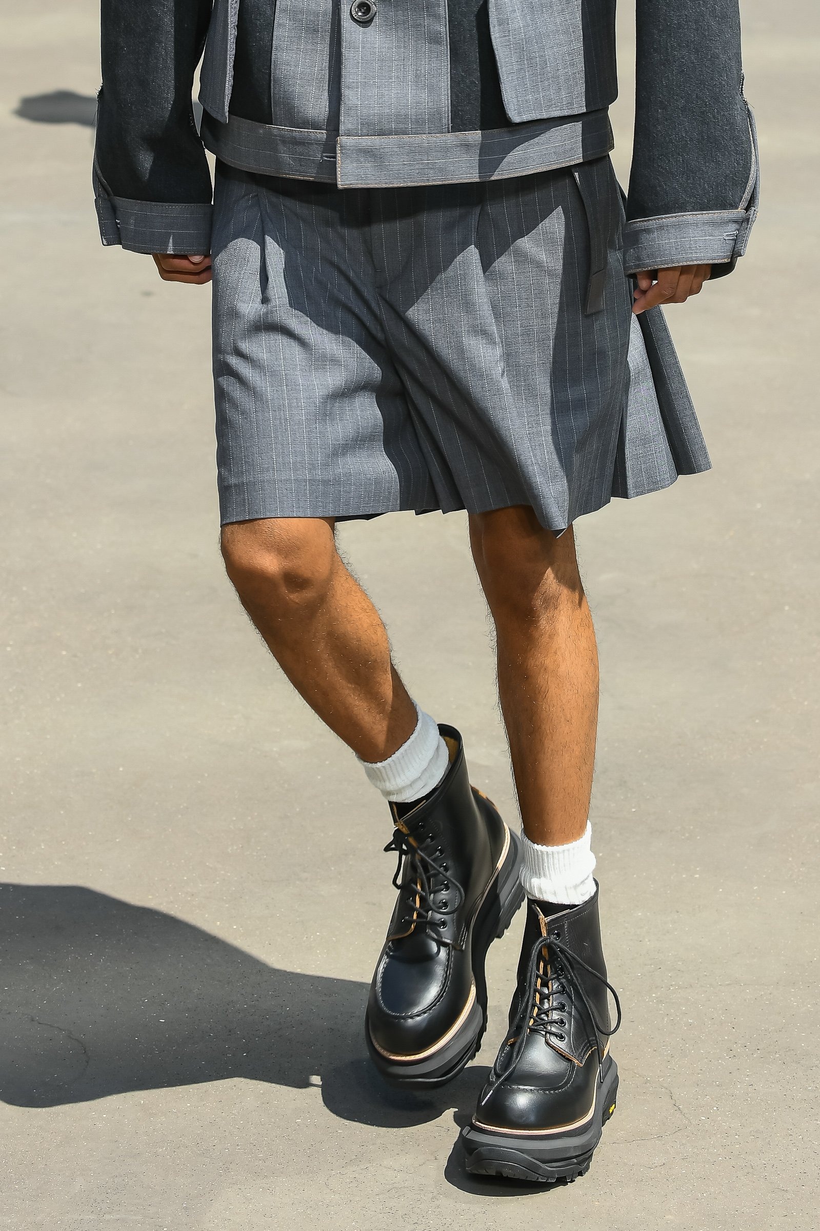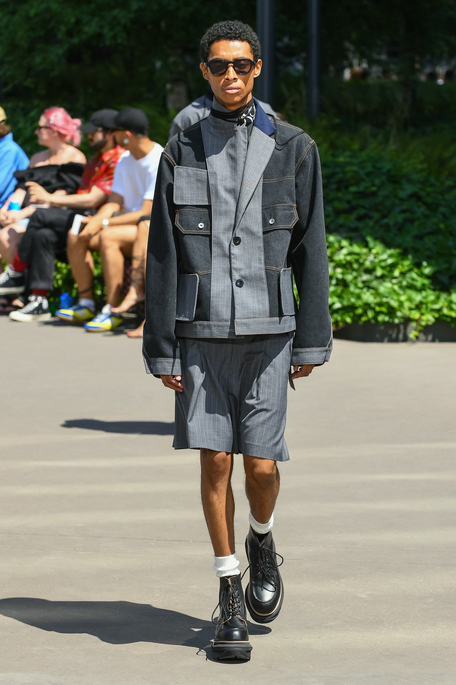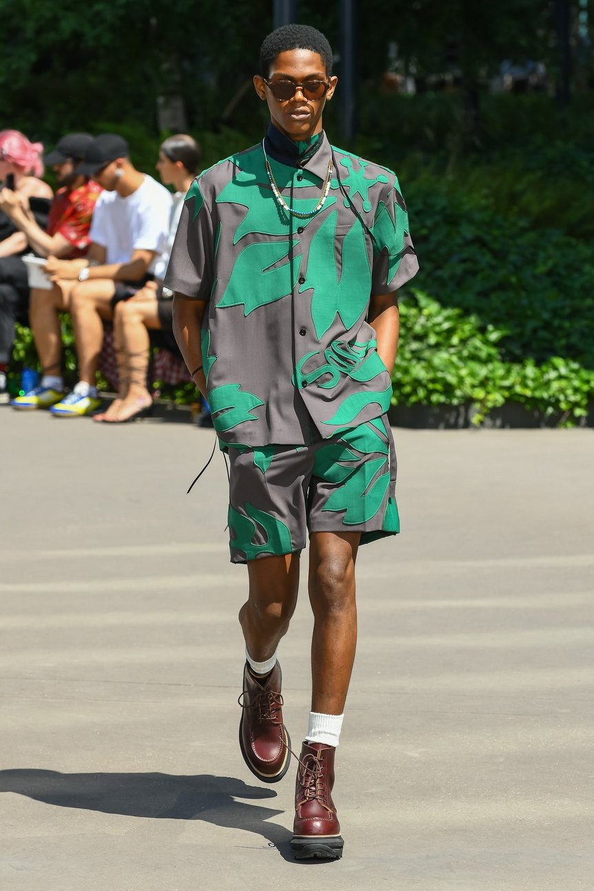 サカイに欠かせないプリーツは、細かな直線的なものではなく、少し捻って曲線的なニュアンスを伴いスカルプチュアルなシルエットを生み出したり、ノースリーブのトレンチコートやジャケットの首元からAラインに広がるシルエットを作る。ペプラムスカートやバルーン気味のショートパンツなどを合わせ、"ボリュームの実験"というプレイフルな概念で新しいシェイプを構築した。