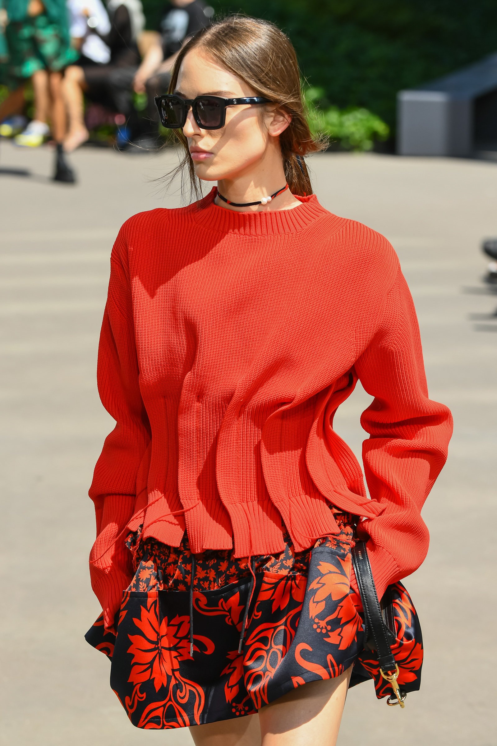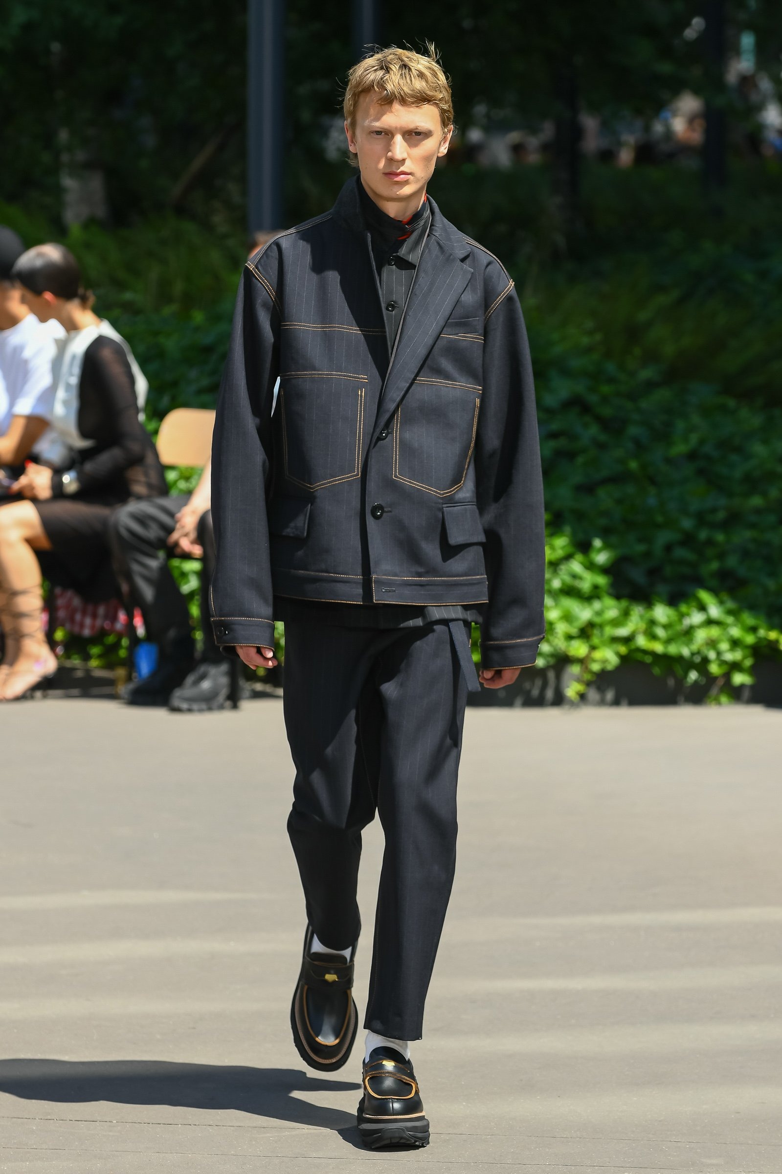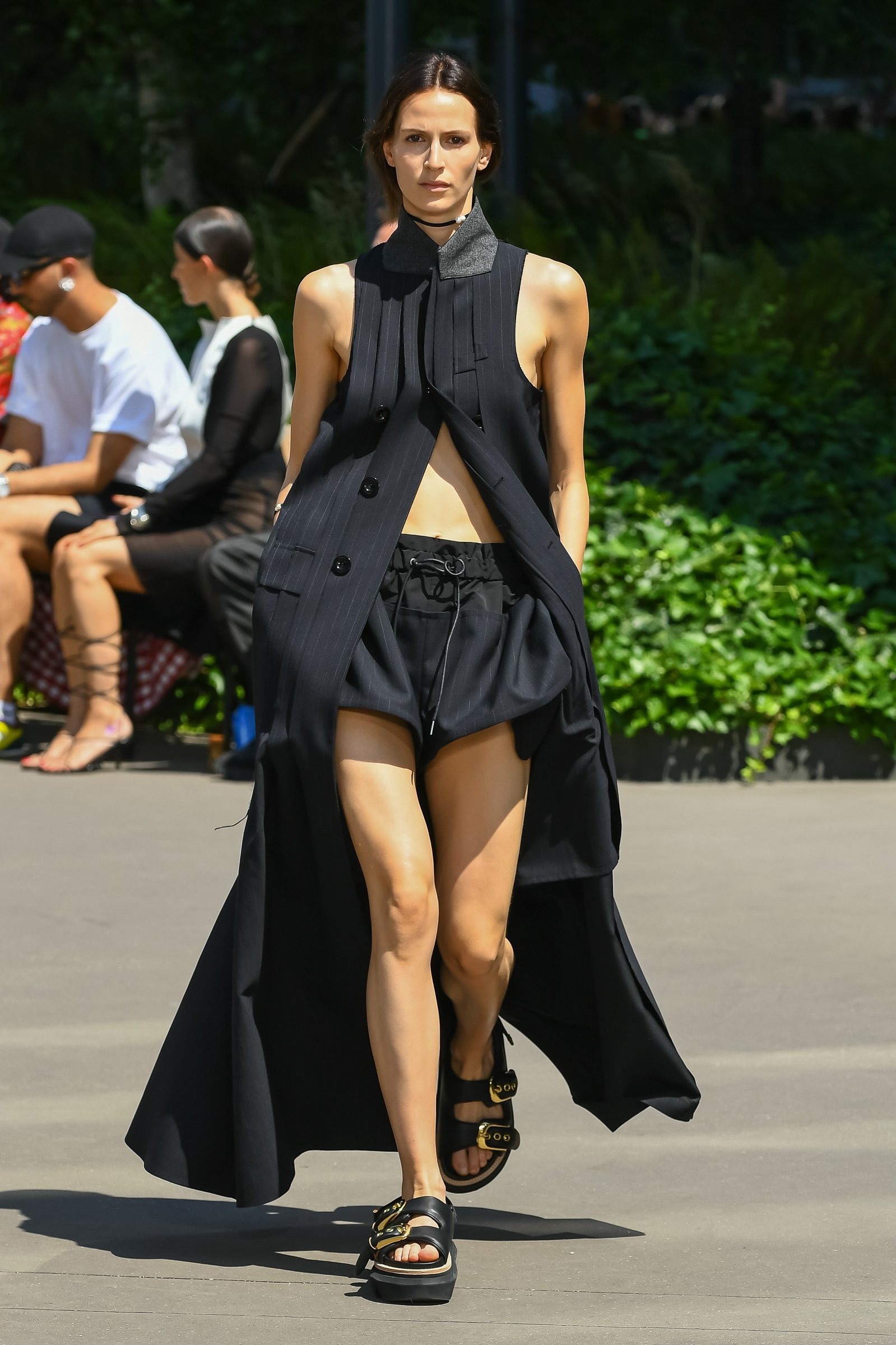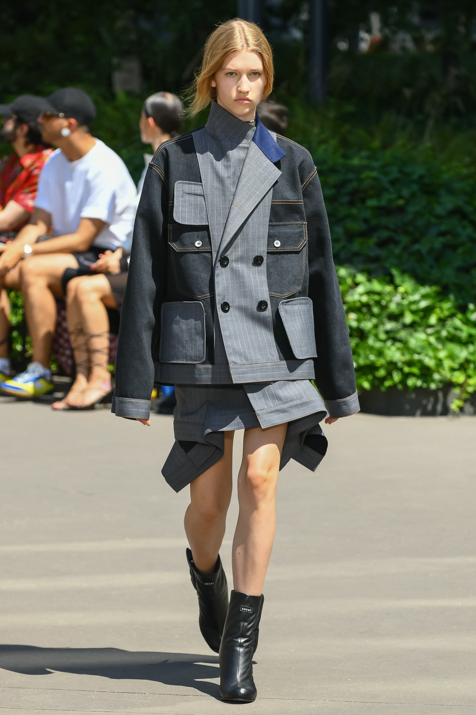 サカイに欠かせないプリーツは、細かな直線的なものではなく、少し捻って曲線的なニュアンスを伴いスカルプチュアルなシルエットを生み出したり、ノースリーブのトレンチコートやジャケットの首元からAラインに広がるシルエットを作る。ペプラムスカートやバルーン気味のショートパンツなどを合わせ、"ボリュームの実験"というプレイフルな概念で新しいシェイプを構築した。