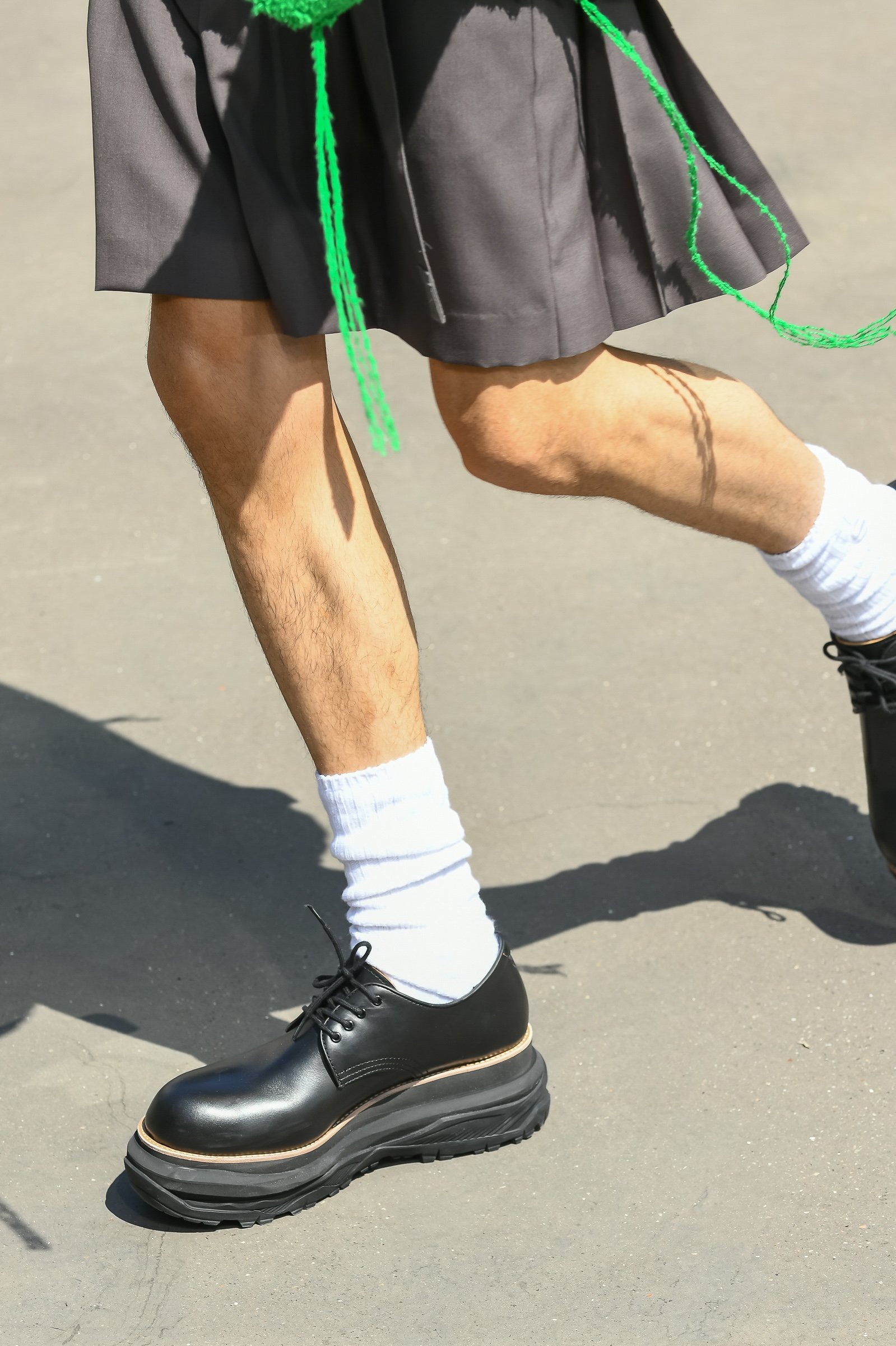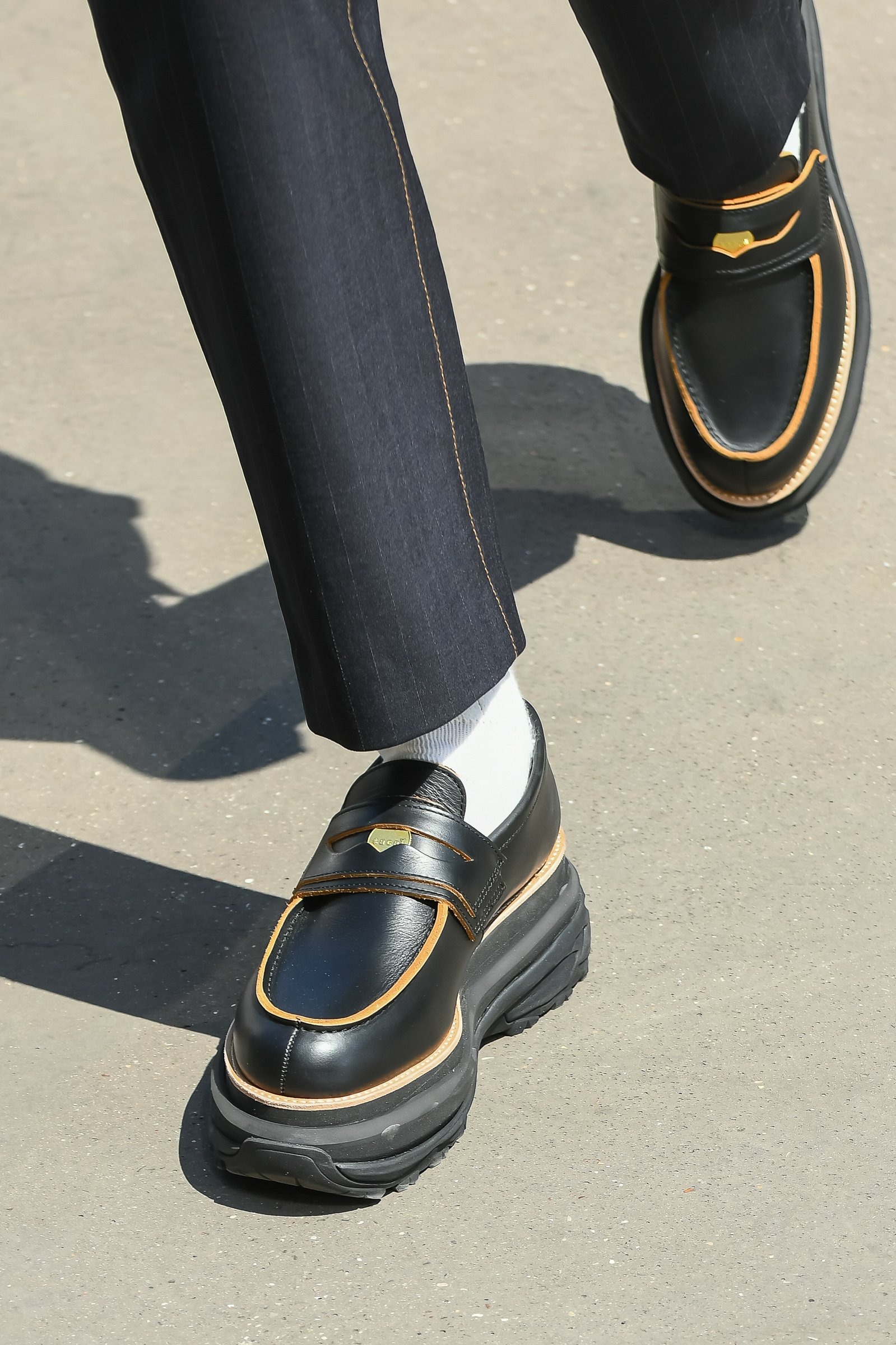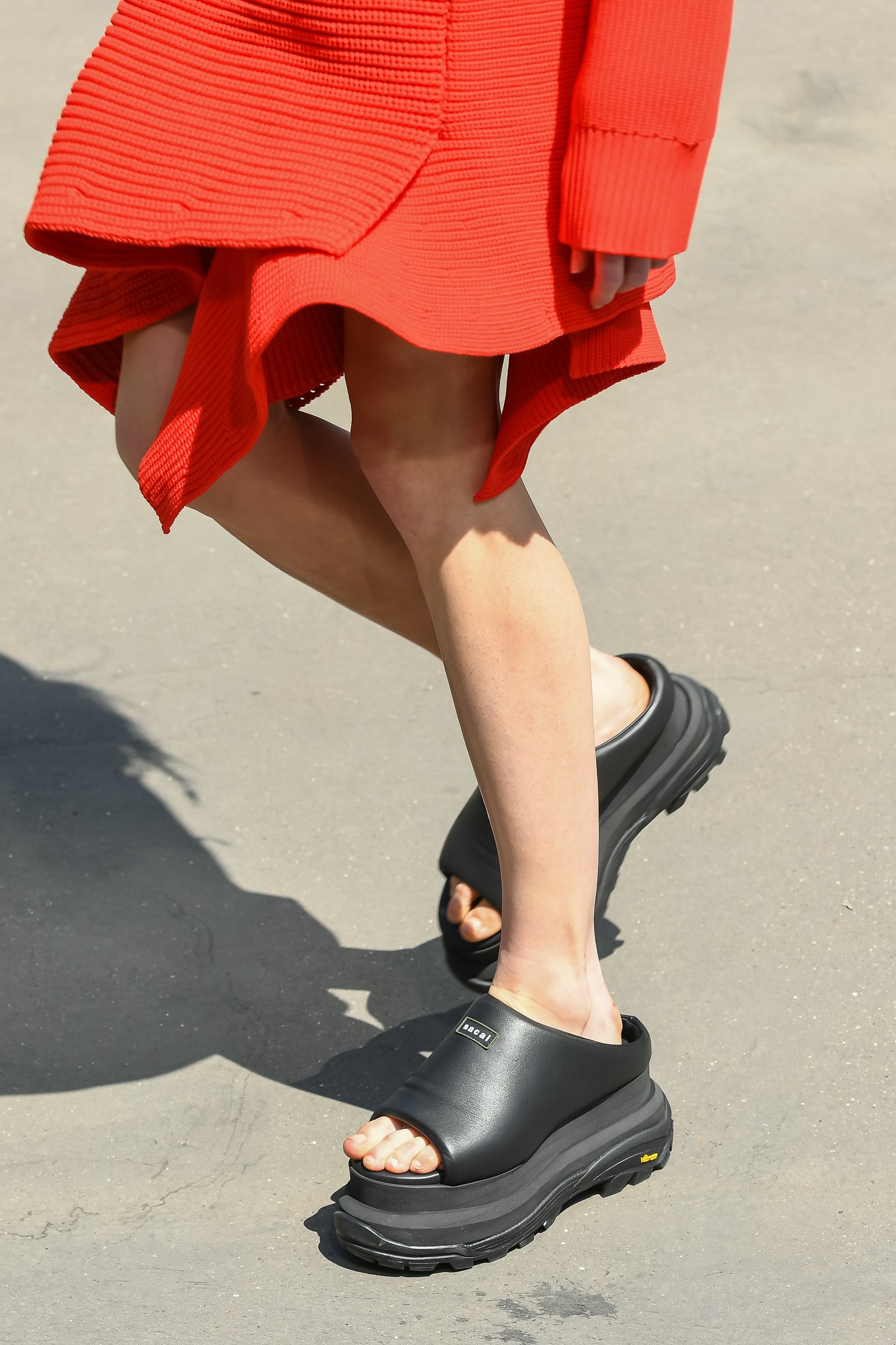 スタイリングの仕上げは、プラットフォームシューズで足元にボリュームをプラスするのがサカイ流。メンズはドレスシューズに、ウィメンズはパファーブーツやスライドサンダルにヴィブラム(Vibram)ソールをドッキングし、タフなアクセントを添えた。