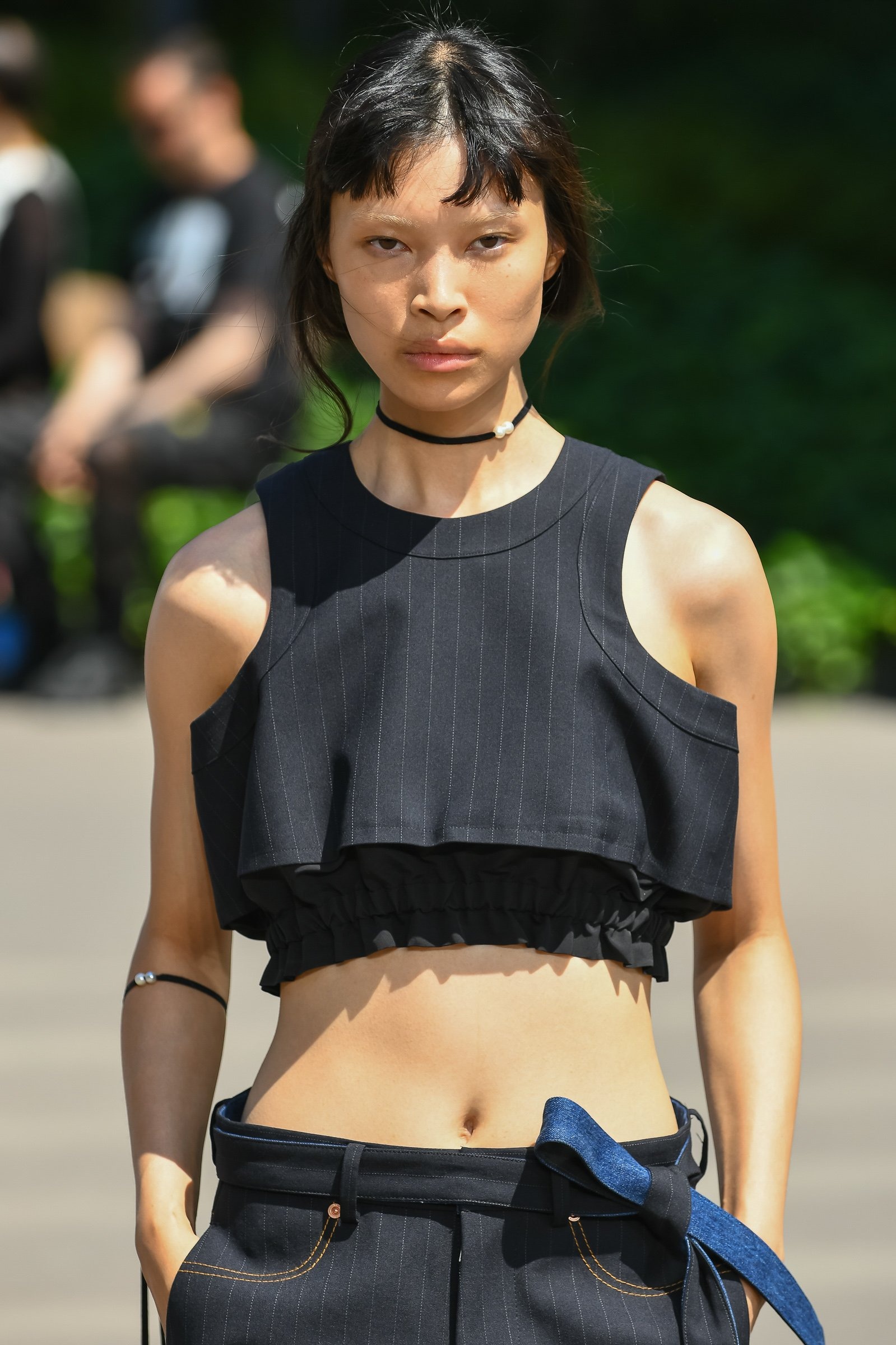 ファーストルックはまるでワークウェアのような肩の落ちたサイズ感と、ステッチが施されたダブルのピンストライプスーツ。ノースリーブジャケットの裾はペプラムデザインでボリューミーなシルエットに仕立てられている。ピンストライプのスーツ地の裏はデニム素材で、襟の折り返しやプリーツのひだ、ベルトなどからデニムのブルーがのぞく。スーツ地とデニムを表裏でドッキングした「インサイド?アウト」の手法を用いながら、トラディショナルなスーツをハイブリッドに表現した。これらはデザイナーの阿部千登勢が制服を人と違った見せ方をするためにアレンジした学生時代の記憶からインスピレーションを得たという。