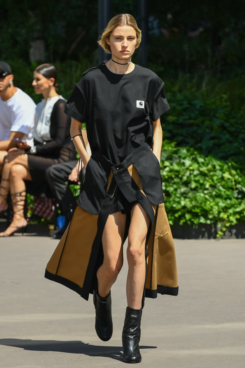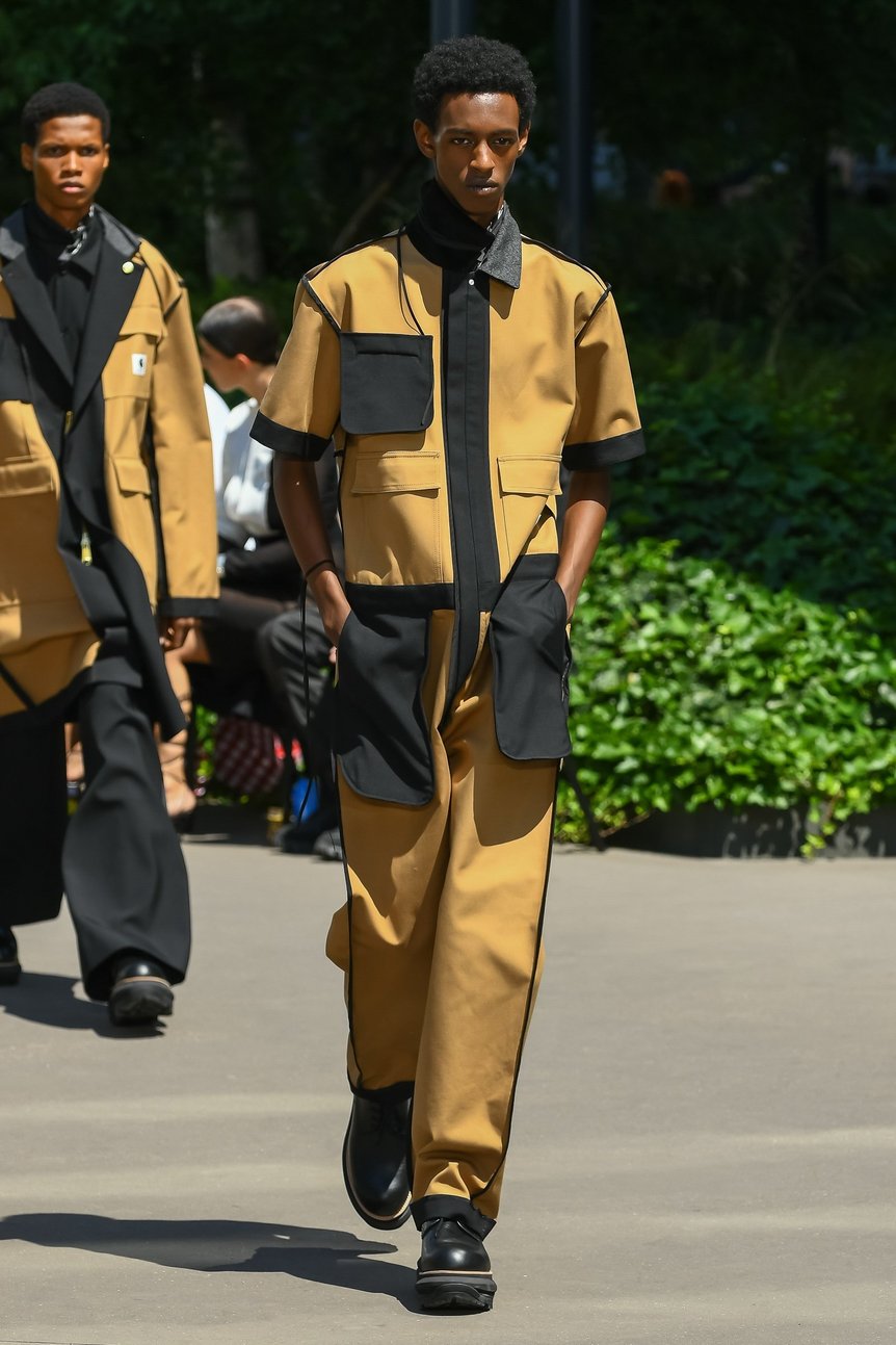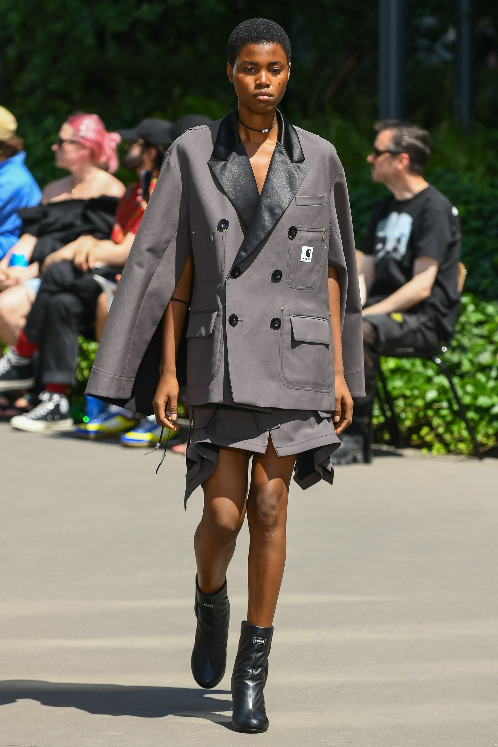 前シーズンに続く「カーハート」との協業アイテムも多数登場。コレクションと連動し、ジャケットスタイルの裏地はカーハートの代名詞でもあるダック生地を採用。ポケットやスナップボタンのディテールで、エレガントでフォーマルなジャケットスタイルにワークウェアのエッセンスを取り込んだ。また2枚のジャケットを組み合わせたデザインや、オーバーオールとプリーツドレスのドッキングが目を引いた。表裏をひっくり返したようなインサイド?アウトのジャンプスーツやジャケット、エプロンスカートなども登場し、サカイらしい表現で相対する素材を掛け合わせることで、服に新たな視点を与えている。