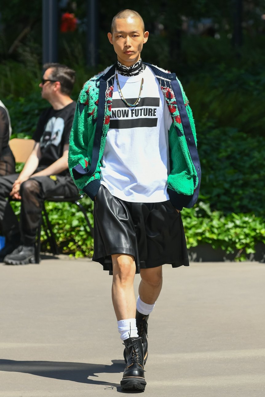 大胆なフラワーモチーフは、カッティングされたモールスキン素材を縫い付けた切り絵のようなパッチワークで表現され、会場の熱気も伴い陽気なサマームードを加速。Tシャツにプリントされた「KNOW FUTURE」は、「NO FUTURE」という悲観的なワードをポジティブな未来を見据えるために置き換えた阿部のステイトメントを込めた言葉遊びだ。