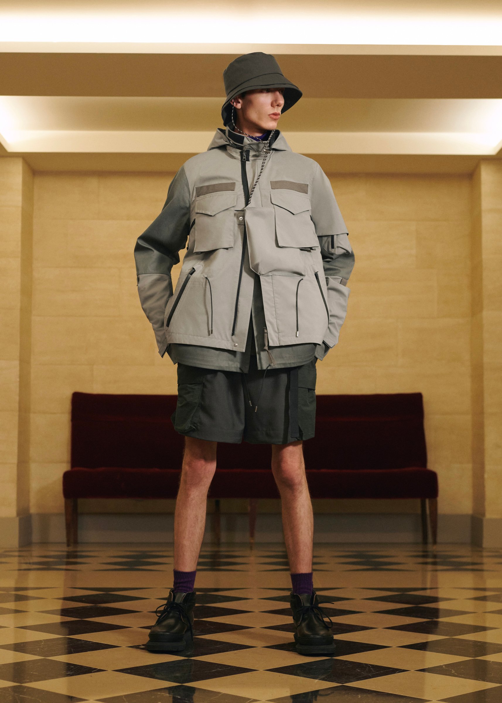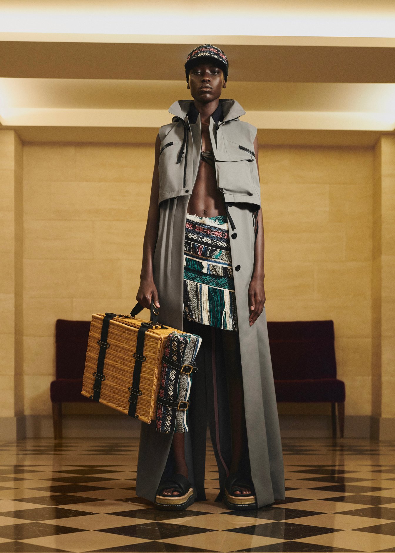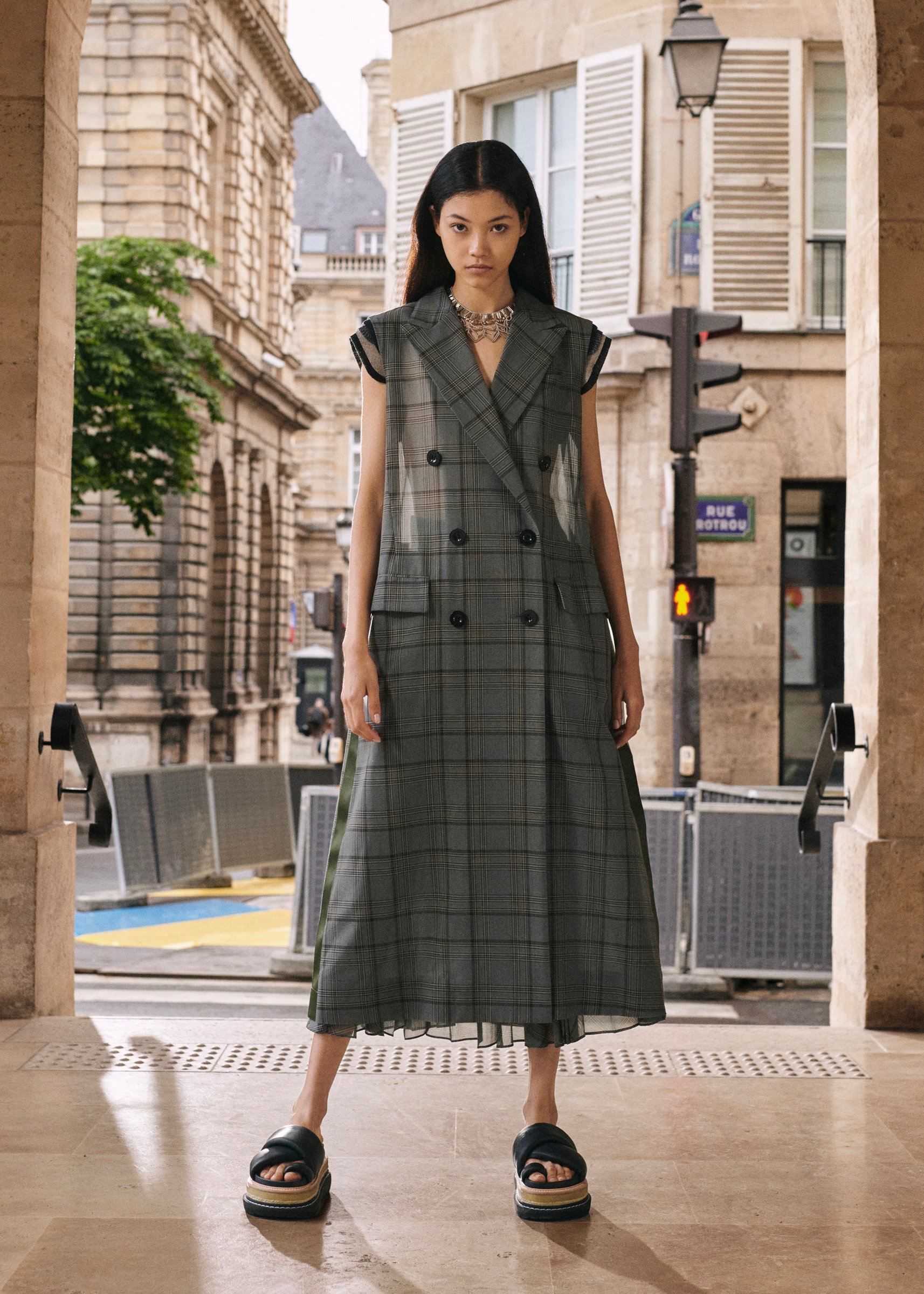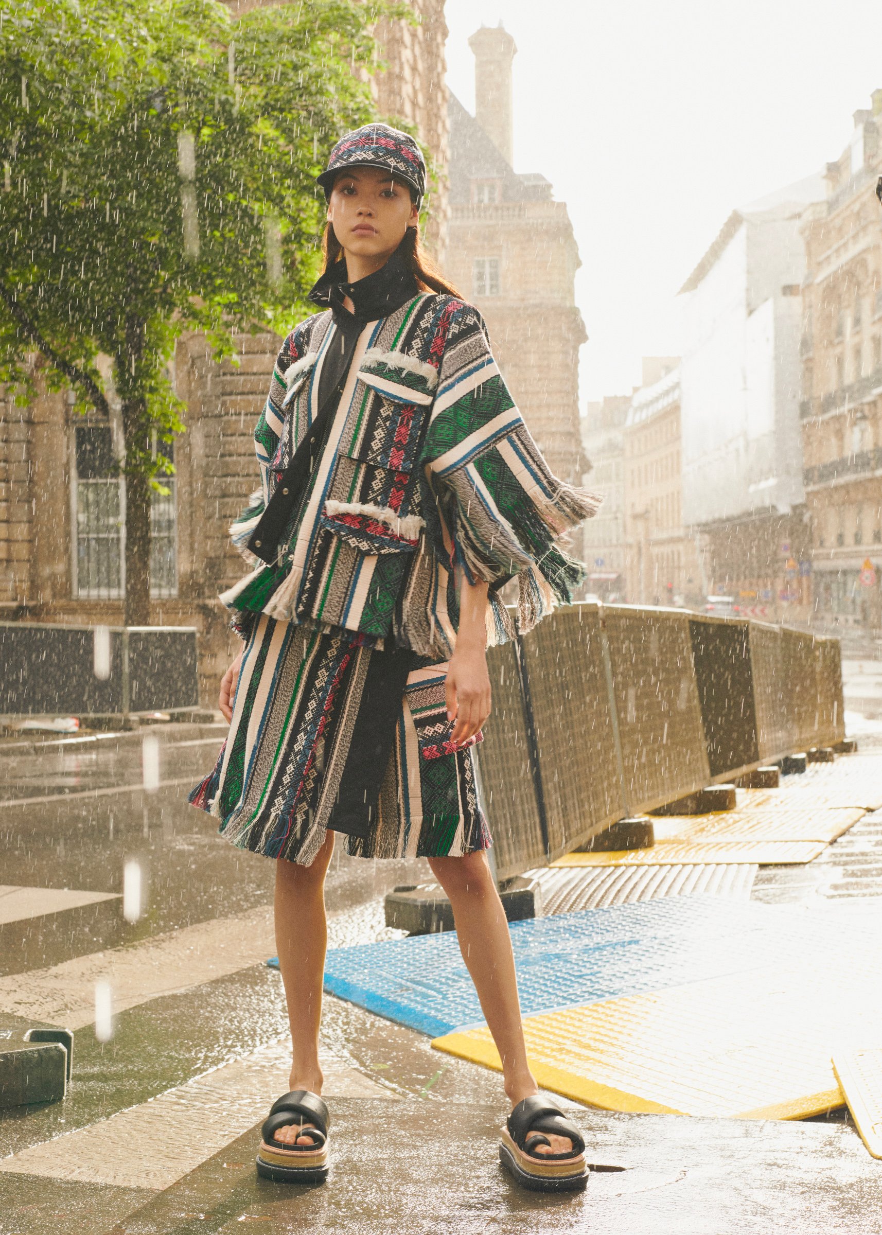 実用性とテクニカルウェアの機能を果たすボンディング加工から生まれた今シーズンのアイデアは、大胆な構築や、ファブリックの意外な掛け合わせに見られる。ペイズリーバンタ?ナのプリント、バッファロー?チェック、ラグ?ジャカードといったサカイの象徴的なファブリックが撥水加工されたテクニカル?ナイロンと融合した。テーラードスーツにワークウェアのポケットや止水テープといったアウトドアのディテールを施し、またチェスターフィールドのロングコートは撥水加工のコートドレスに仕立てている。