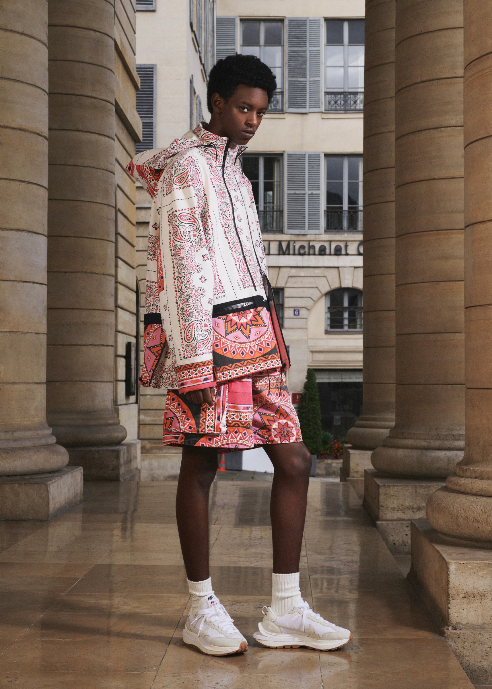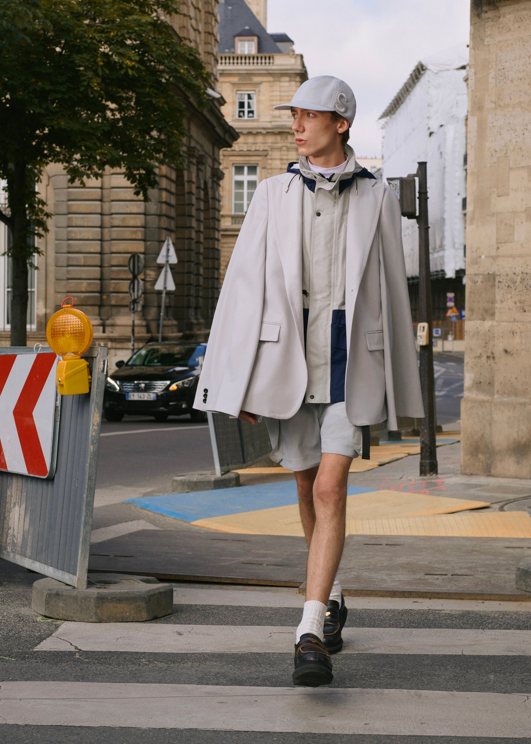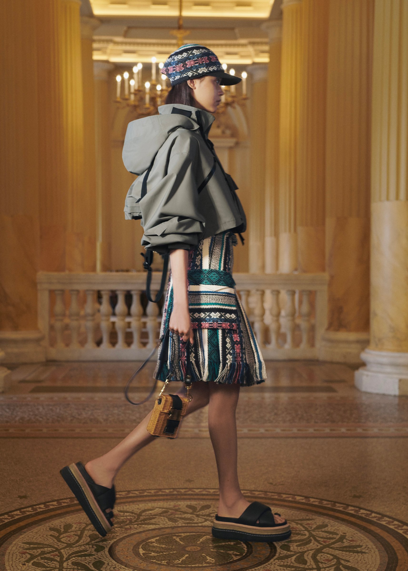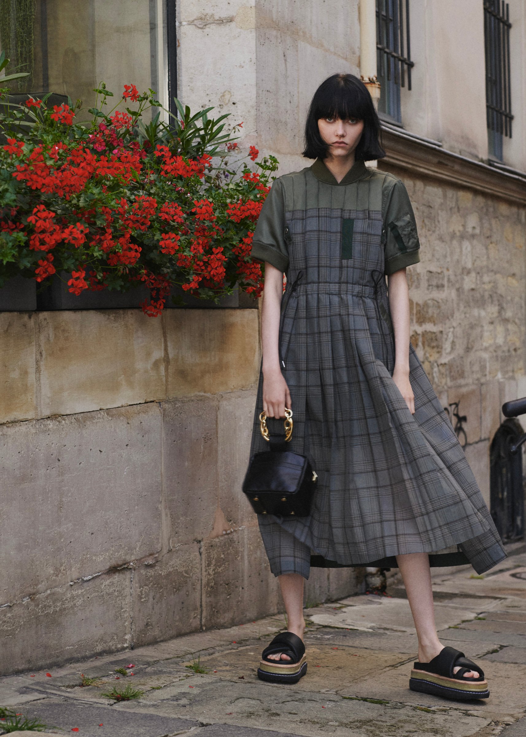 実用性とテクニカルウェアの機能を果たすボンディング加工から生まれた今シーズンのアイデアは、大胆な構築や、ファブリックの意外な掛け合わせに見られる。ペイズリーバンタ?ナのプリント、バッファロー?チェック、ラグ?ジャカードといったサカイの象徴的なファブリックが撥水加工されたテクニカル?ナイロンと融合した。テーラードスーツにワークウェアのポケットや止水テープといったアウトドアのディテールを施し、またチェスターフィールドのロングコートは撥水加工のコートドレスに仕立てている。