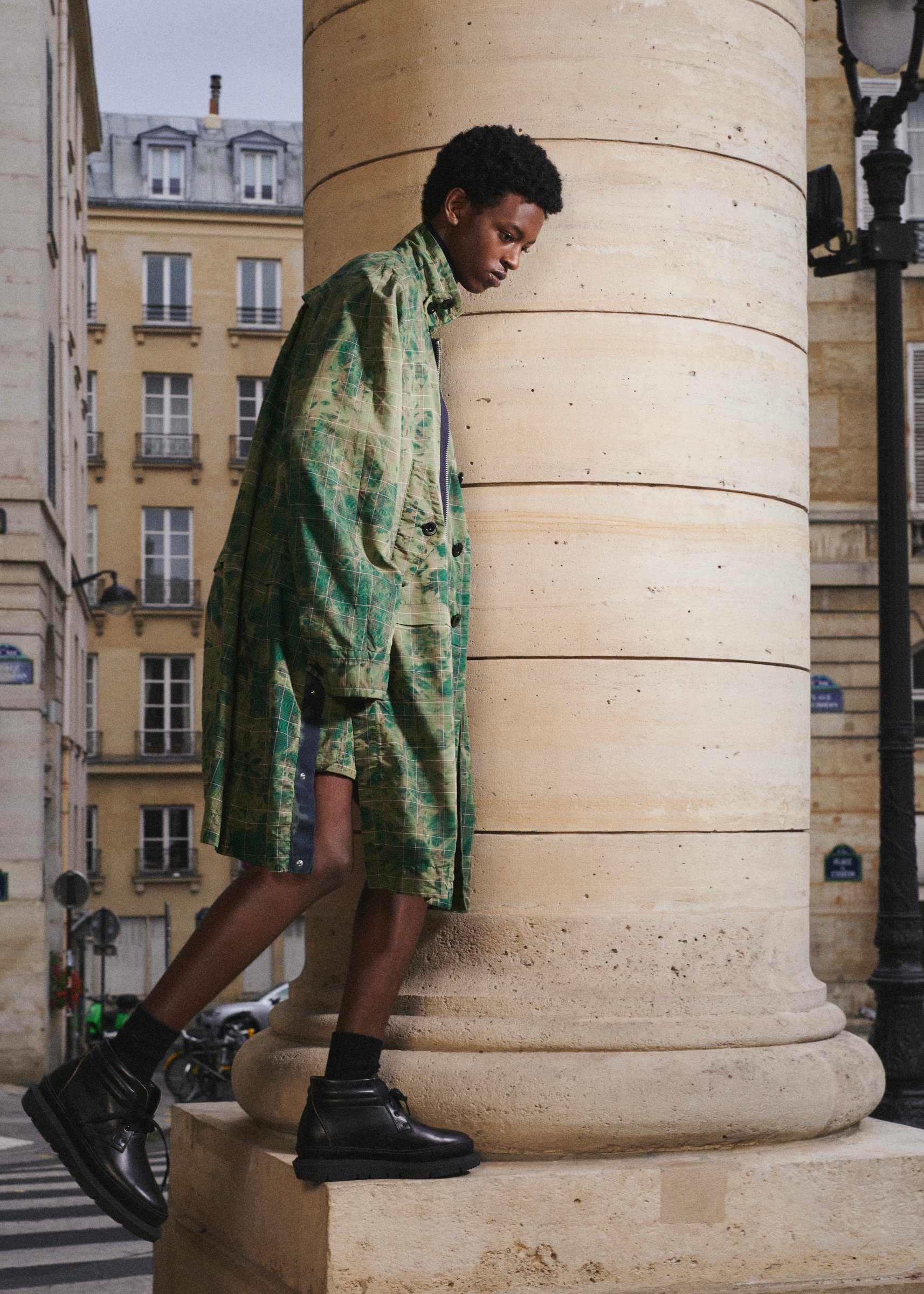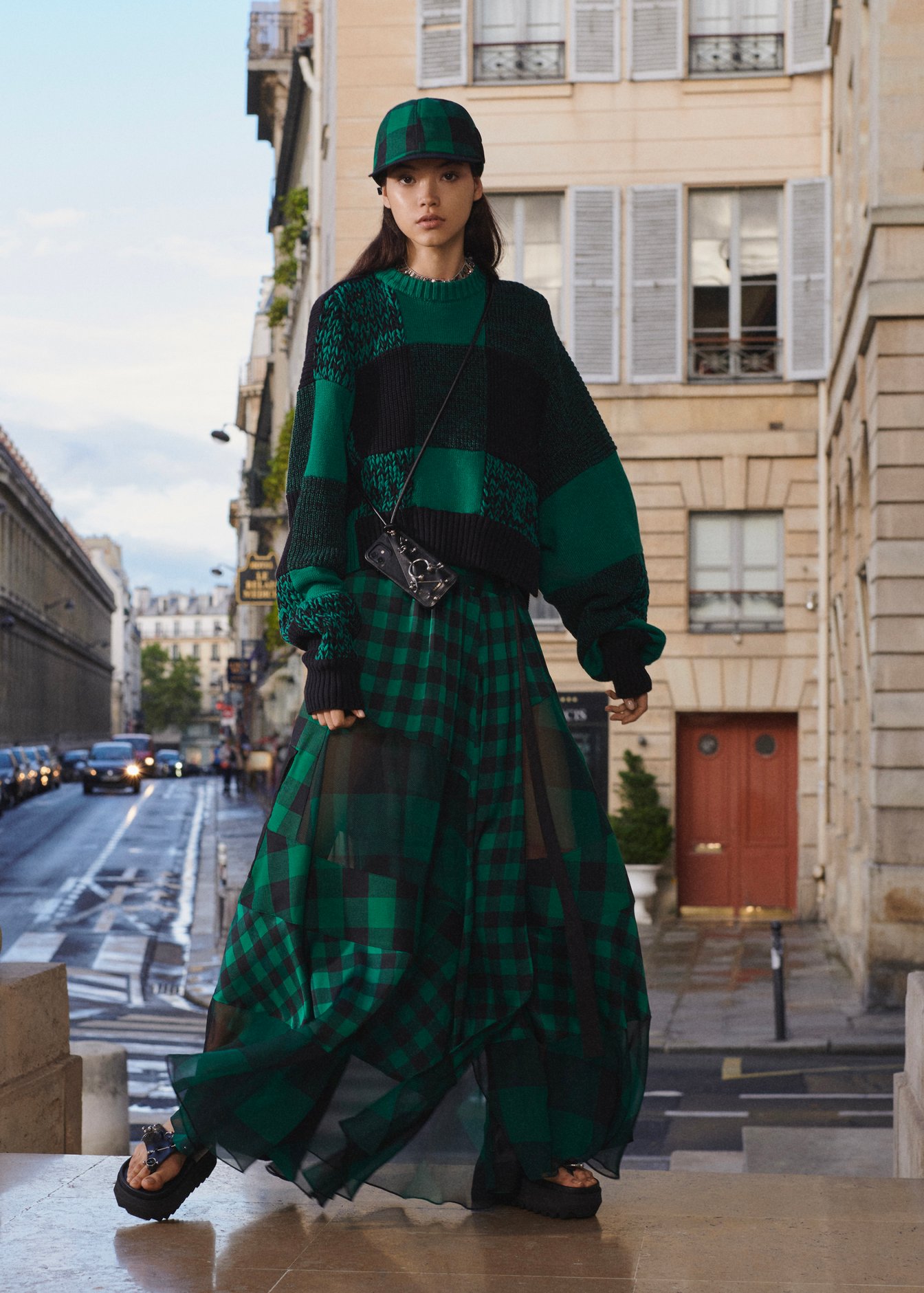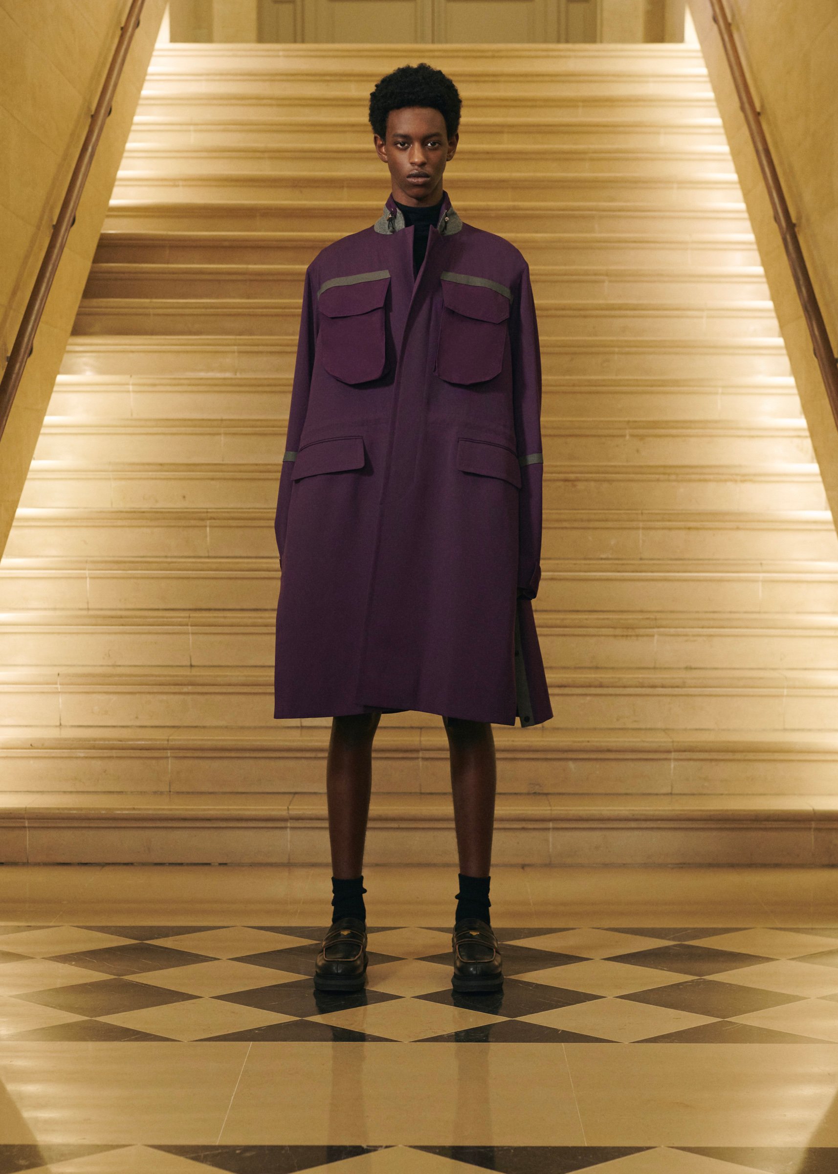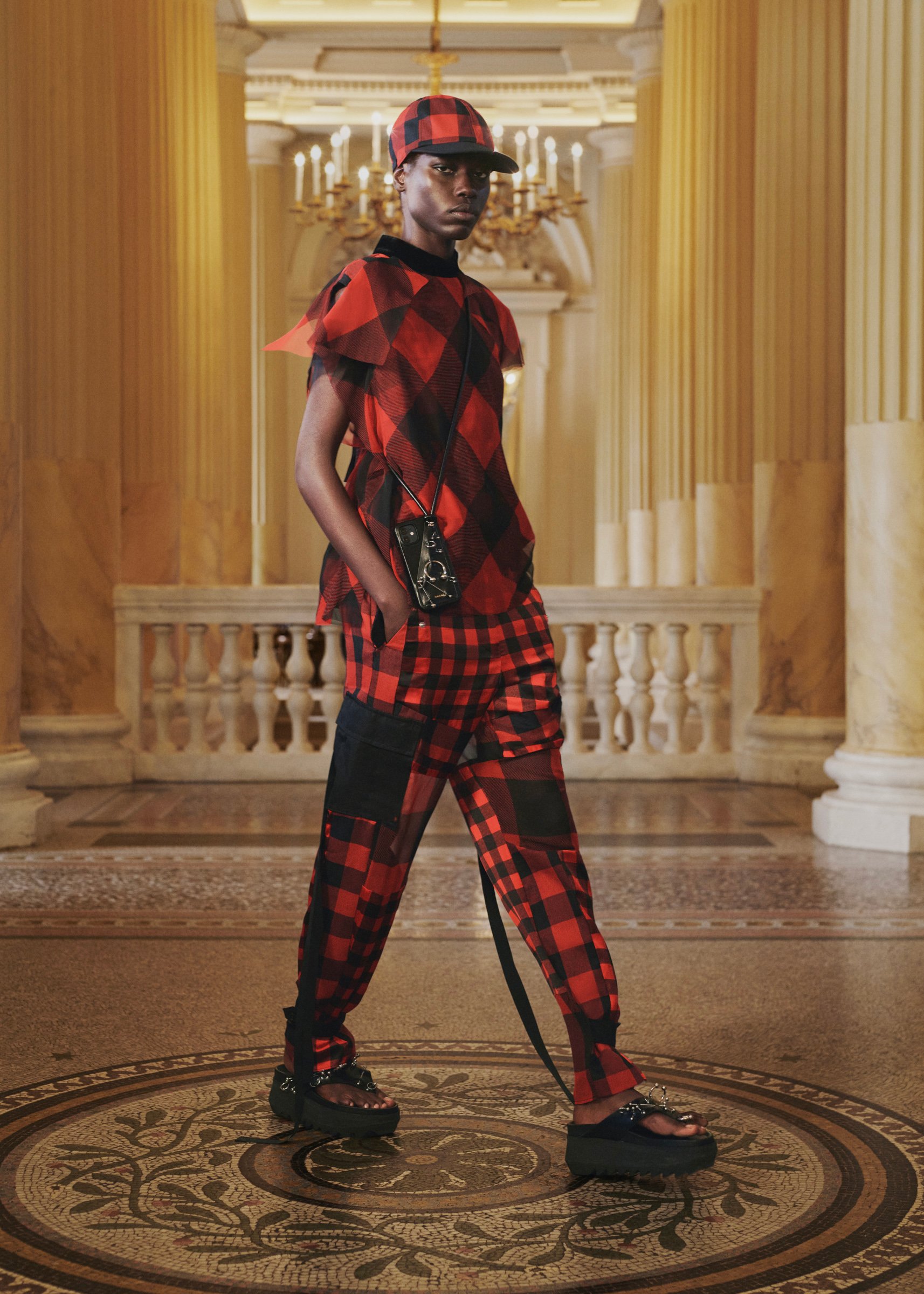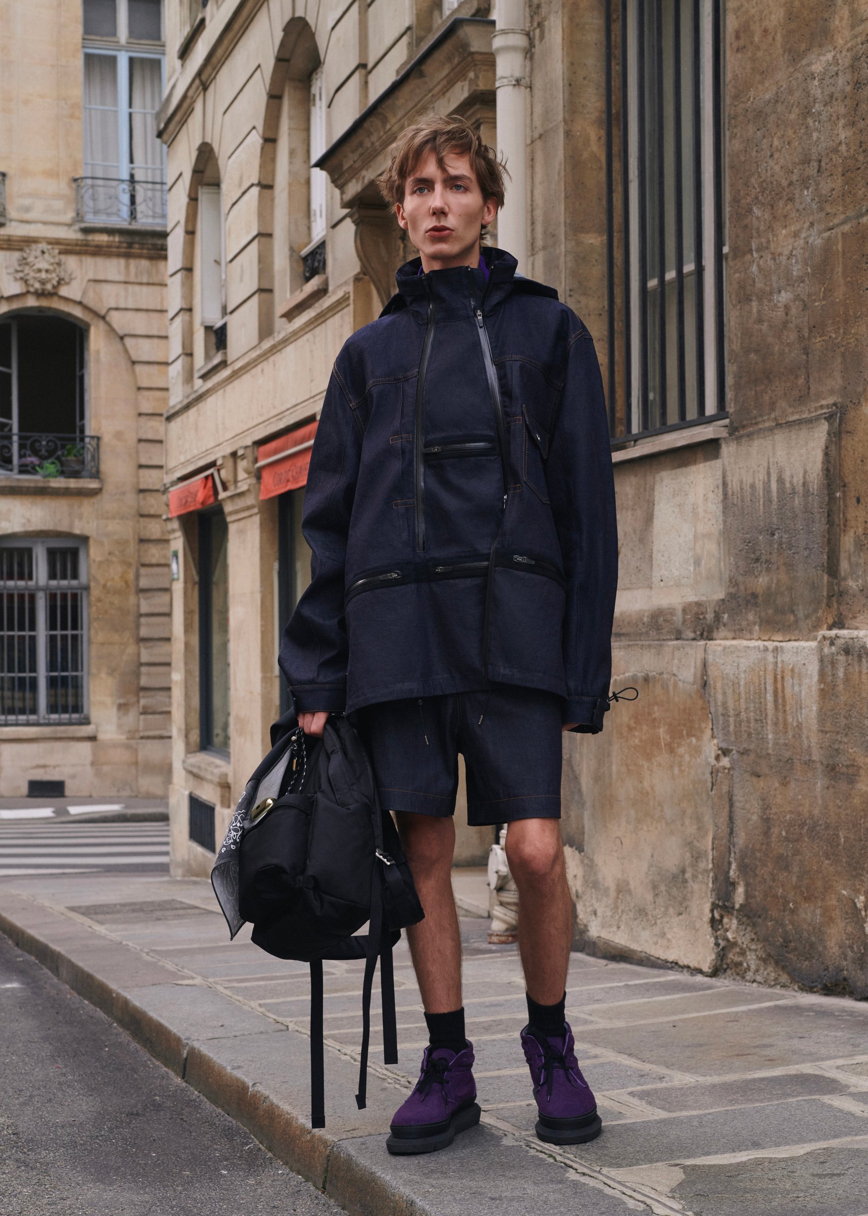 実用性とテクニカルウェアの機能を果たすボンディング加工から生まれた今シーズンのアイデアは、大胆な構築や、ファブリックの意外な掛け合わせに見られる。ペイズリーバンタ?ナのプリント、バッファロー?チェック、ラグ?ジャカードといったサカイの象徴的なファブリックが撥水加工されたテクニカル?ナイロンと融合した。テーラードスーツにワークウェアのポケットや止水テープといったアウトドアのディテールを施し、またチェスターフィールドのロングコートは撥水加工のコートドレスに仕立てている。