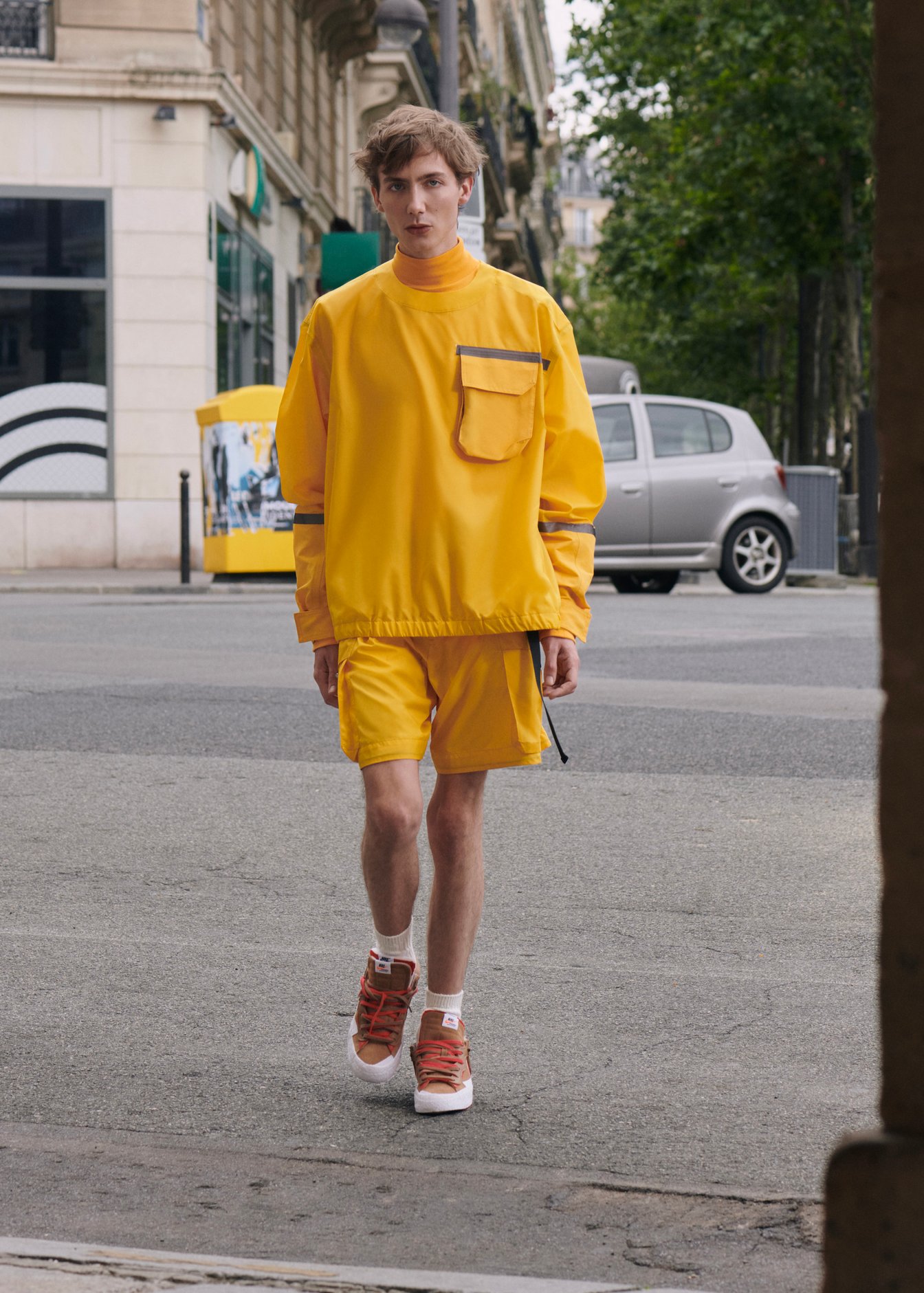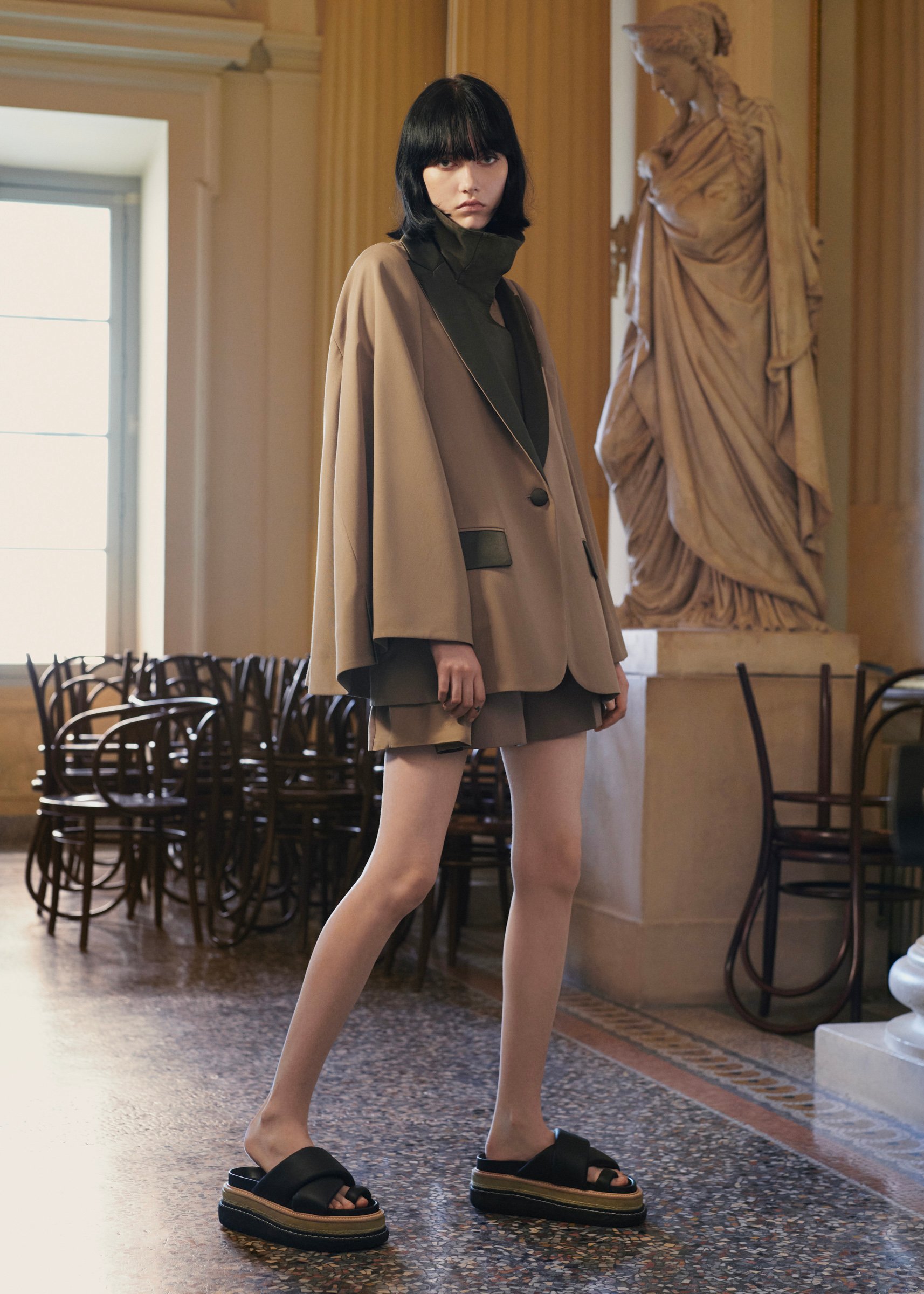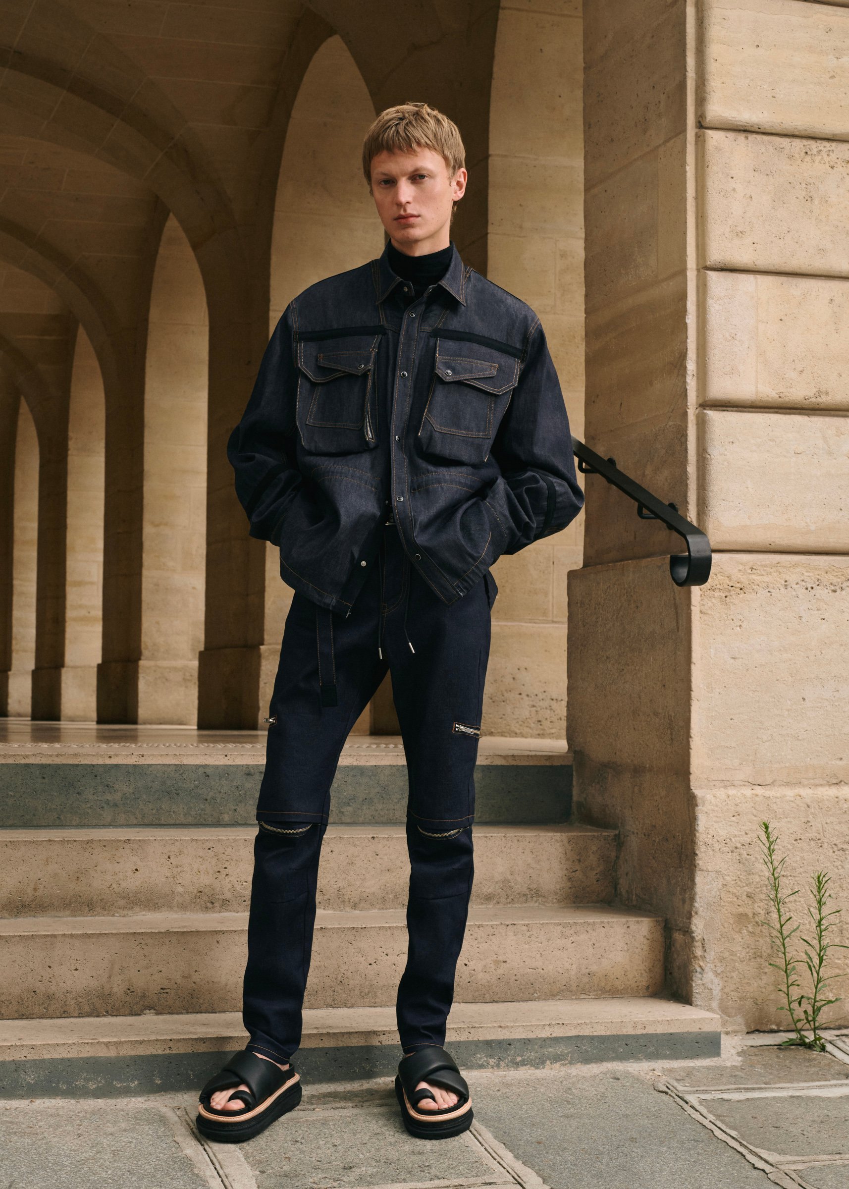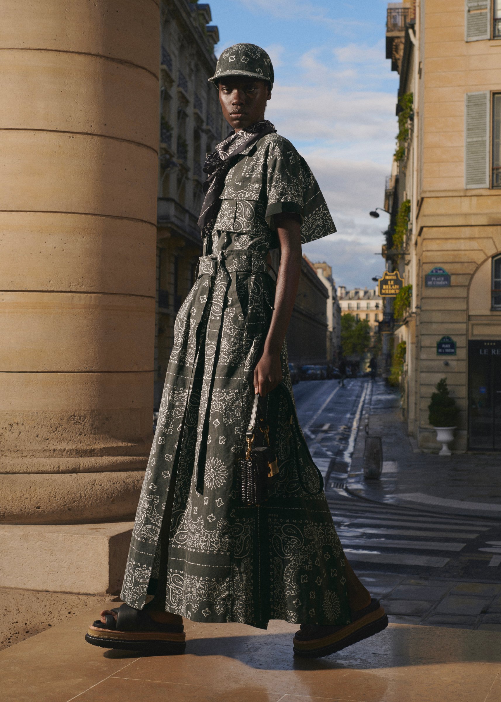 実用性とテクニカルウェアの機能を果たすボンディング加工から生まれた今シーズンのアイデアは、大胆な構築や、ファブリックの意外な掛け合わせに見られる。ペイズリーバンタ?ナのプリント、バッファロー?チェック、ラグ?ジャカードといったサカイの象徴的なファブリックが撥水加工されたテクニカル?ナイロンと融合した。テーラードスーツにワークウェアのポケットや止水テープといったアウトドアのディテールを施し、またチェスターフィールドのロングコートは撥水加工のコートドレスに仕立てている。