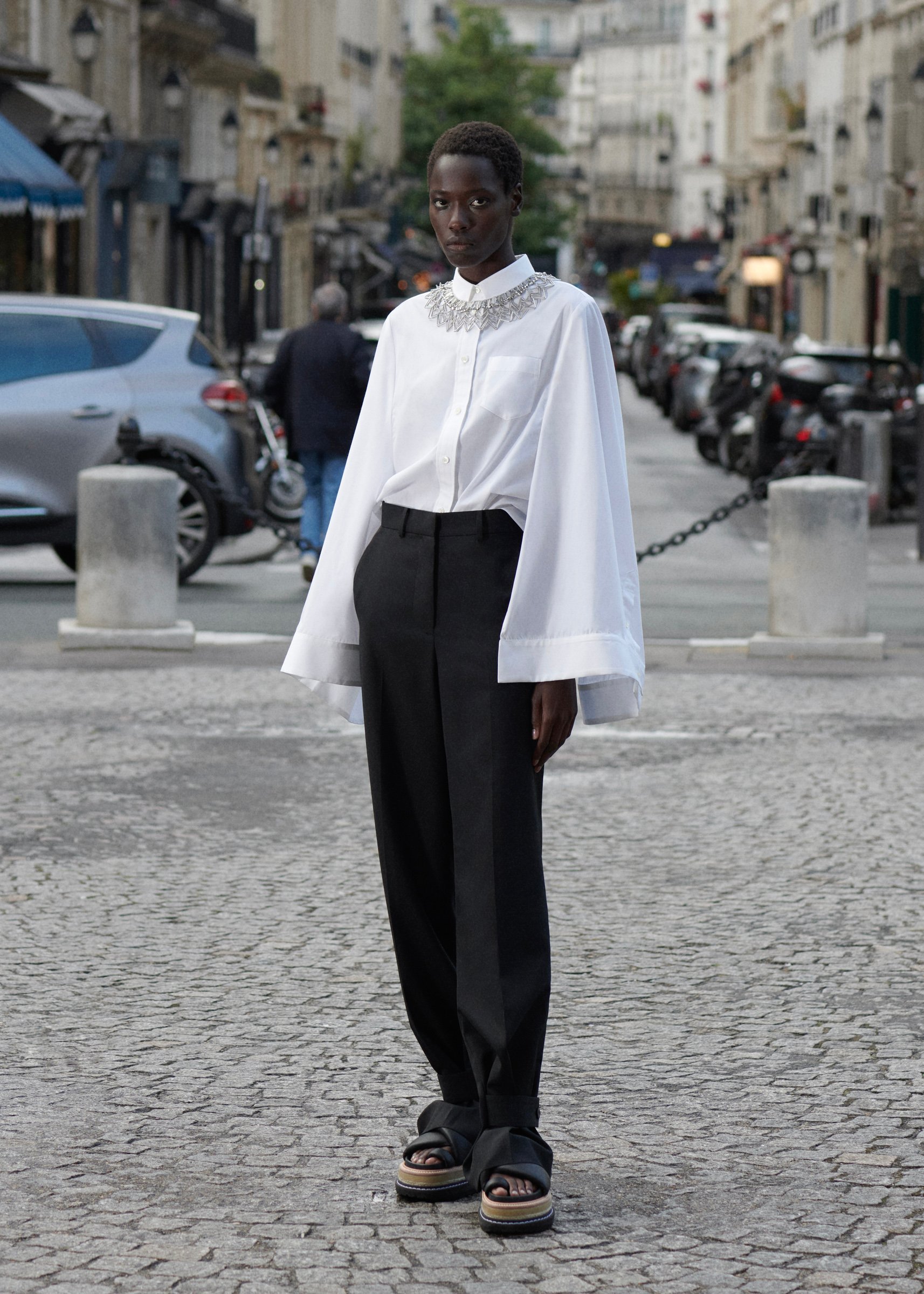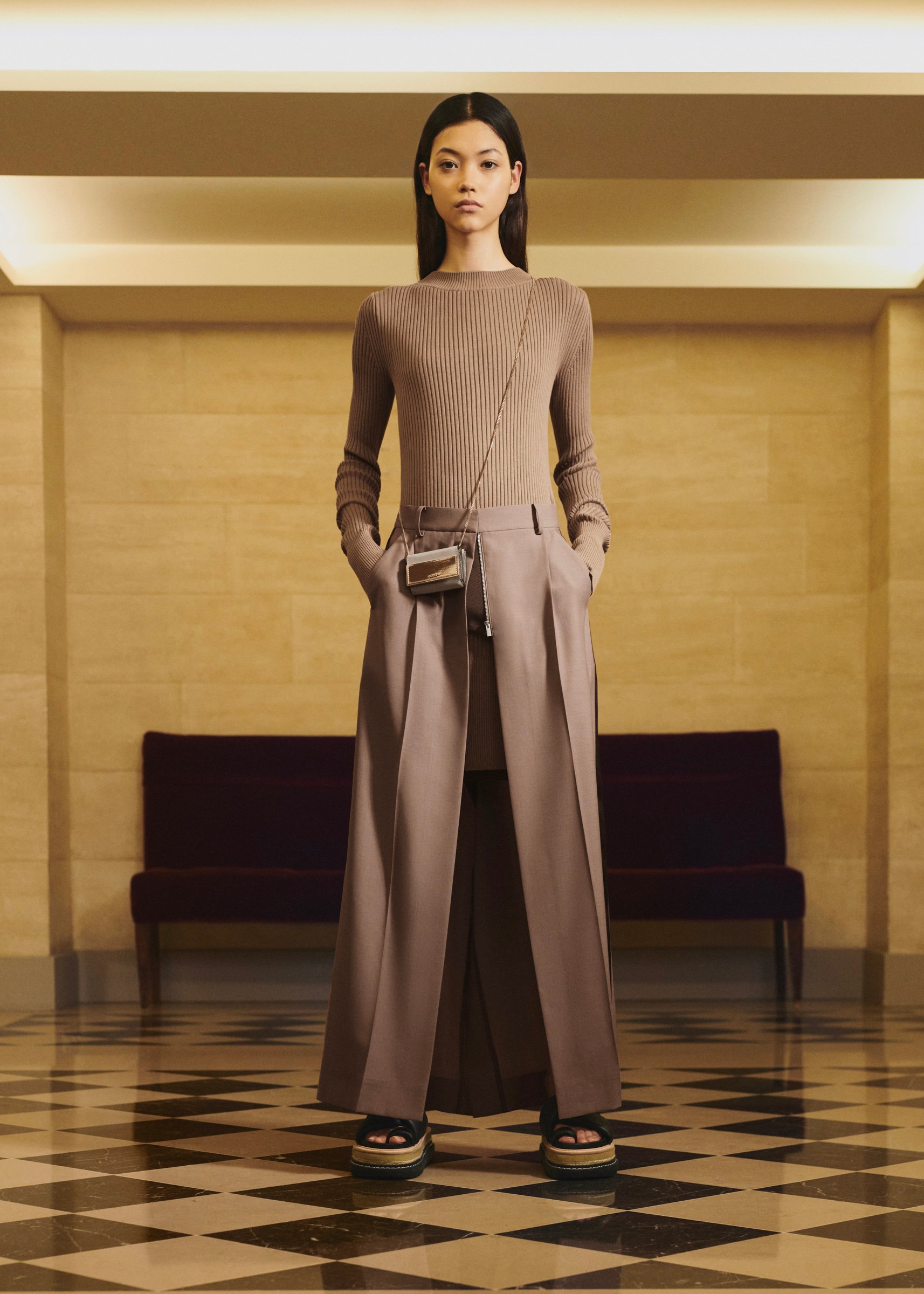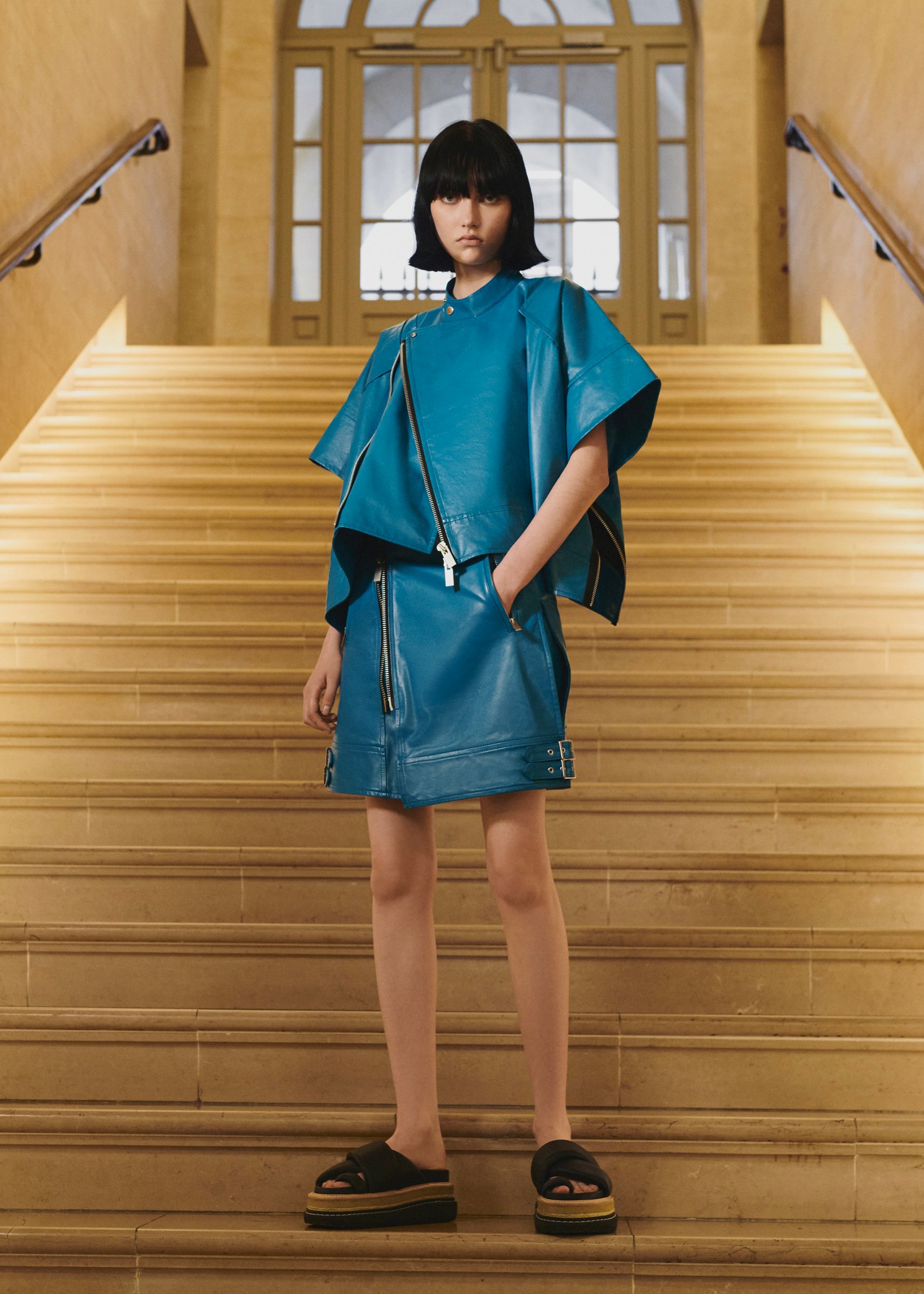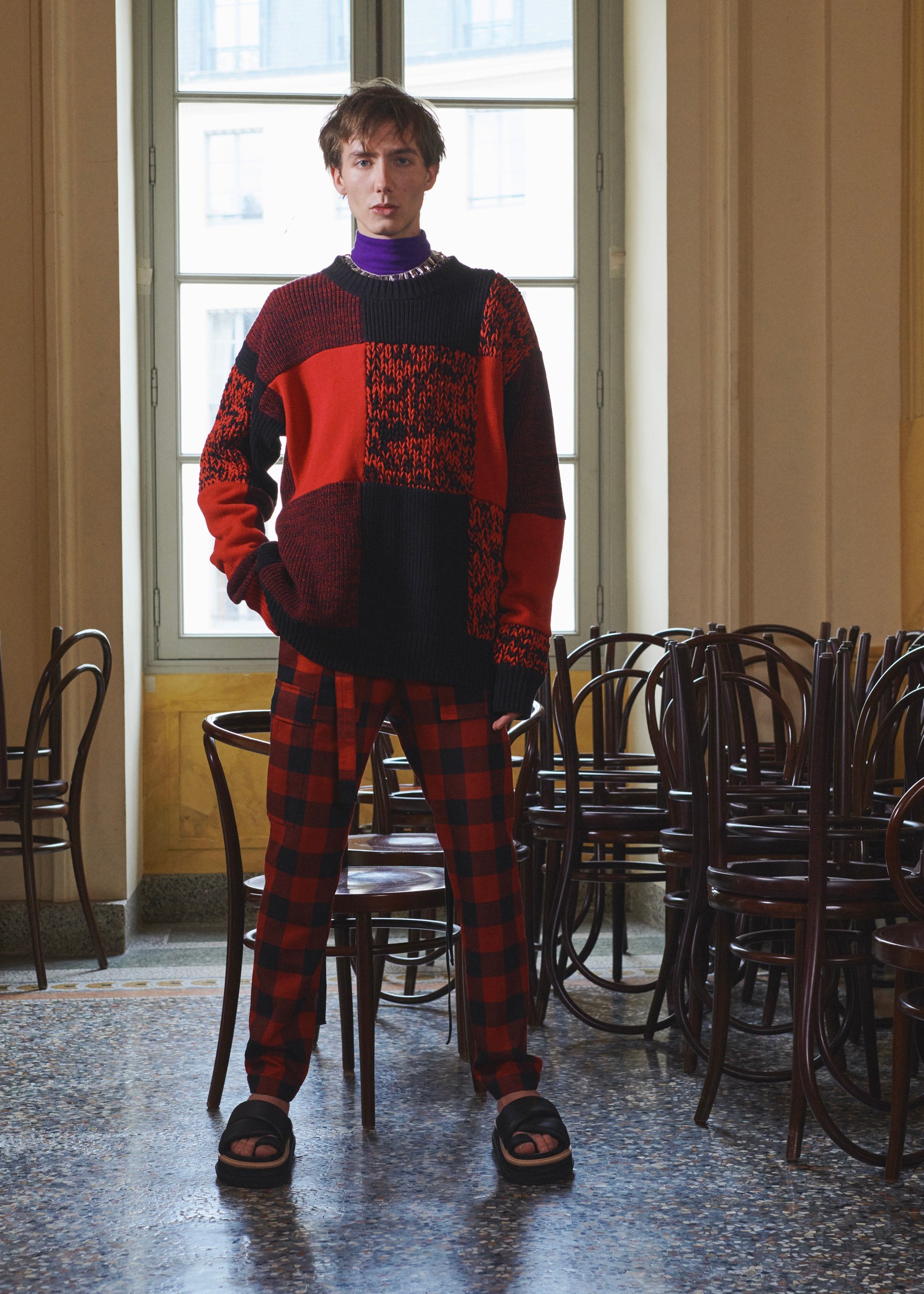実用性とテクニカルウェアの機能を果たすボンディング加工から生まれた今シーズンのアイデアは、大胆な構築や、ファブリックの意外な掛け合わせに見られる。ペイズリーバンタ?ナのプリント、バッファロー?チェック、ラグ?ジャカードといったサカイの象徴的なファブリックが撥水加工されたテクニカル?ナイロンと融合した。テーラードスーツにワークウェアのポケットや止水テープといったアウトドアのディテールを施し、またチェスターフィールドのロングコートは撥水加工のコートドレスに仕立てている。