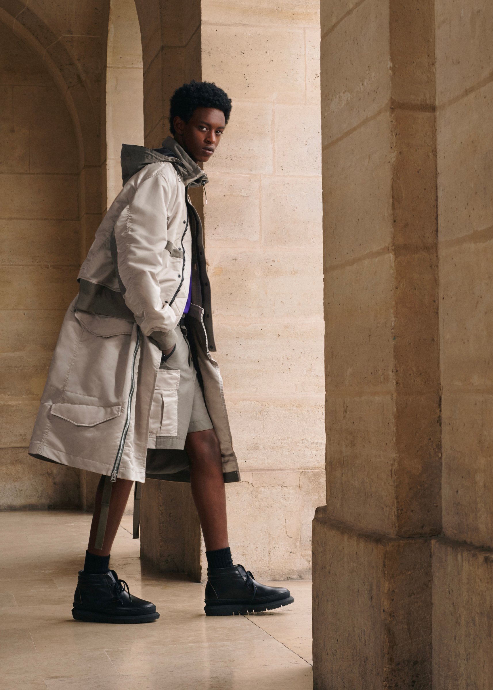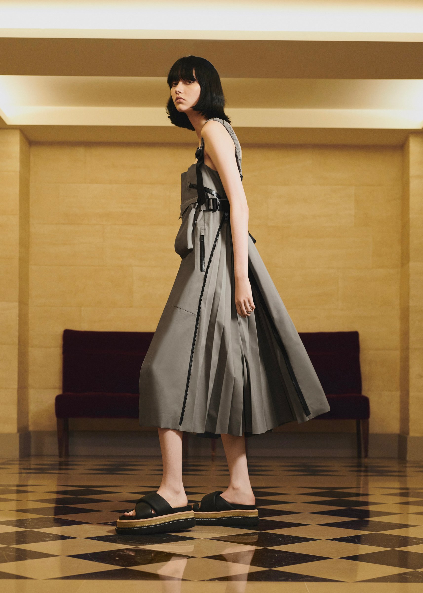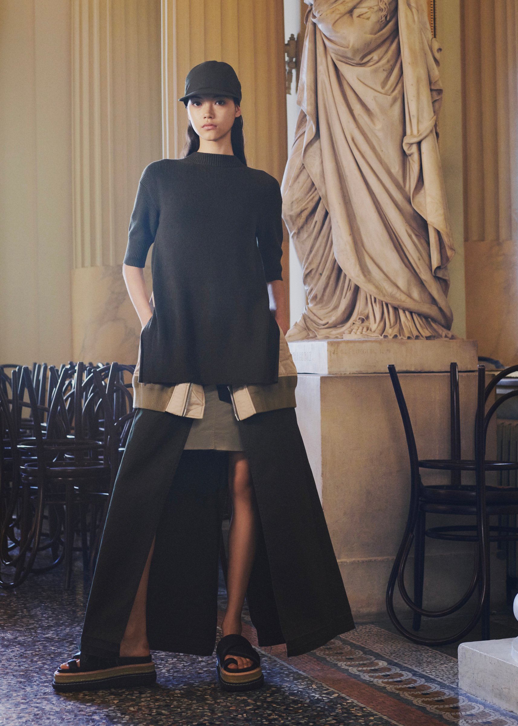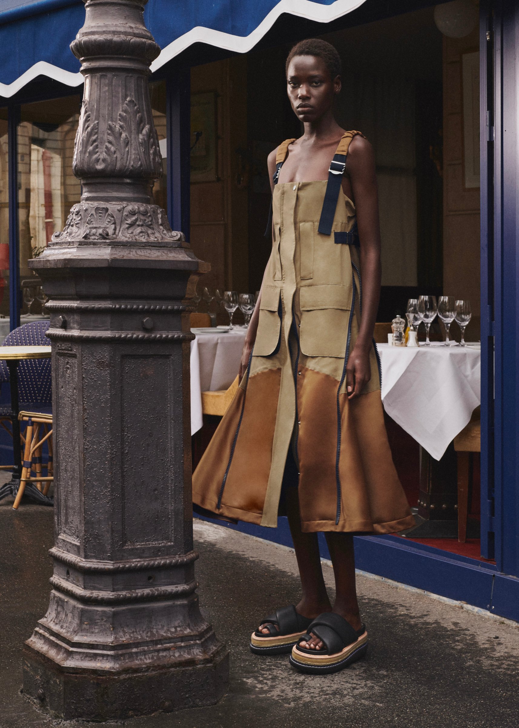 発表されたコラボは、メンズとウィメンズそれぞれ3ルック、ブラックとカーキの2色展開。ミリタリーやアウトドアがベースとなり、サカイで培われたデザインと素材に、アクロニウムが得意とするテクニカルなディテールを融合した。これまでメンズウェアをメインに展開してきたアクロニウムにとって、初のドレスも登場し新しい領域への挑戦も行われている。
