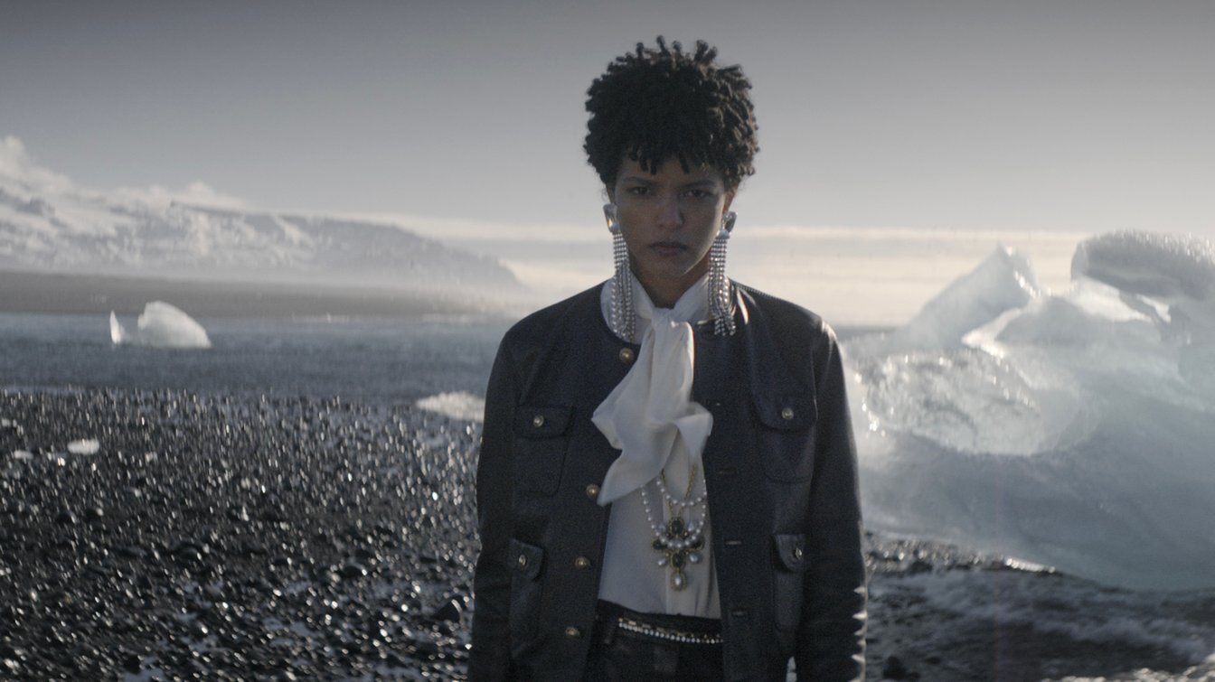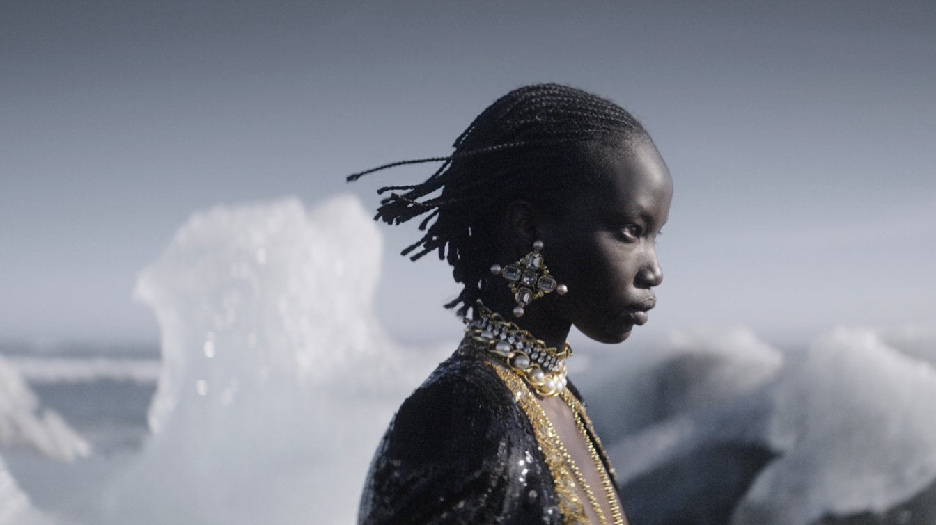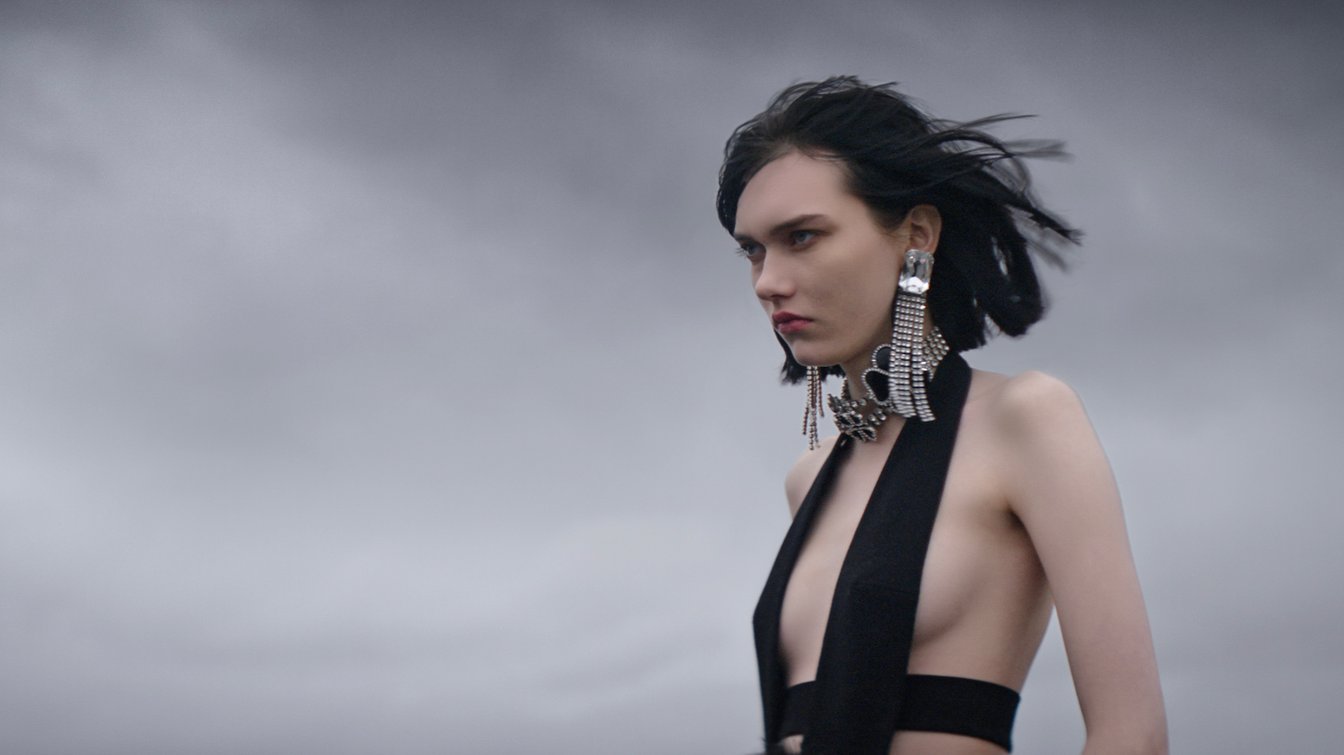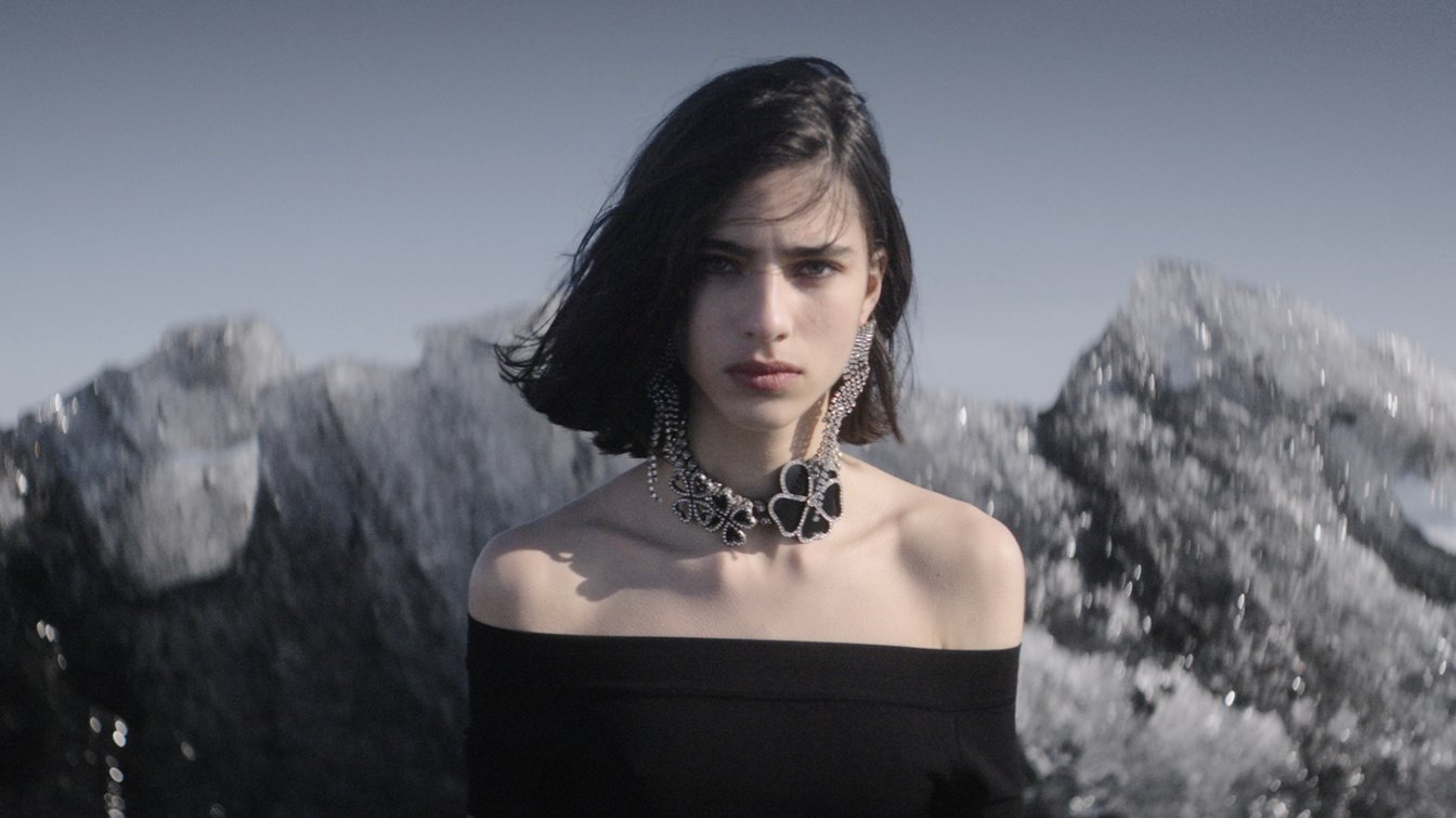 コレクションフィルムの中盤、ブラックサンドビーチを歩くシーンで印象的だったのはジュエリーの輝き。黒い砂の上に打ち上げられた氷塊と呼応するように、ガラスのフリンジが揺れるイヤリングや、クローバーのモチーフのチョーカーが映えた。