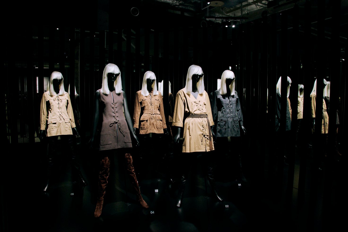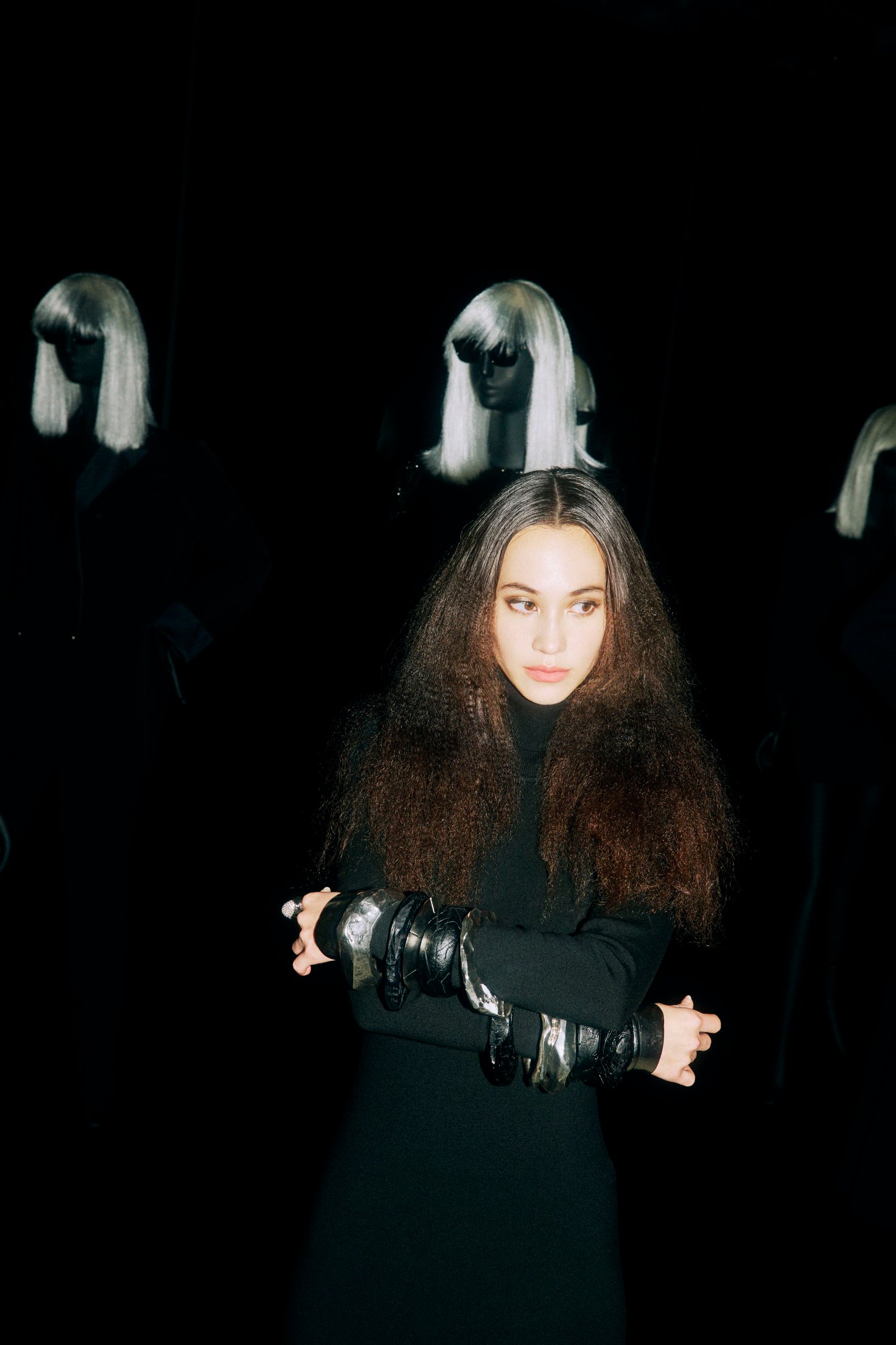 エキシビションの開幕に先駆けて、気鋭のフォトグラファーSASU TEIが漆黒の館内で現代のファッションアイコンである水原希子を撮り下ろした。