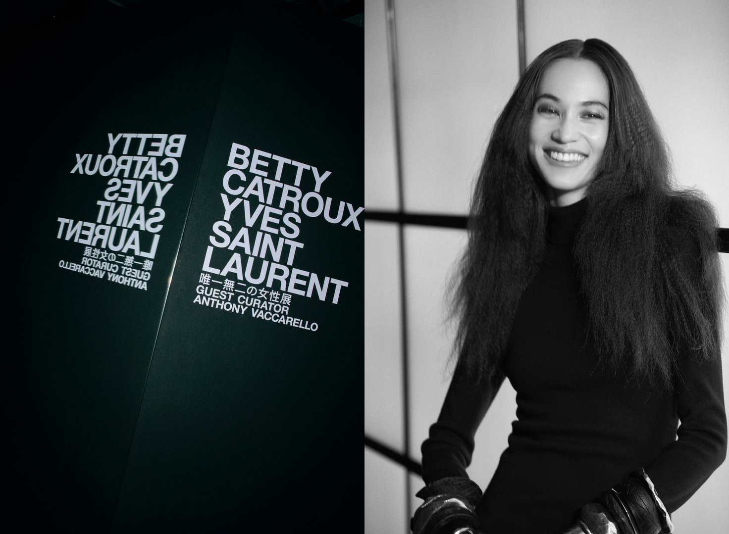 「私はアンソニー?ヴァカレロの佇まいがとても好き。彼はサンローランの空気感や、ミステリアスなムードをよく理解している。女性に対する捉え方もね」と語るベティ。最後の展示空間には、ヴァカレロがベティへのオマージュとして作成した「サンローラン」のルックが煌びやかに並ぶ。彼女のスタイルは永遠だ。