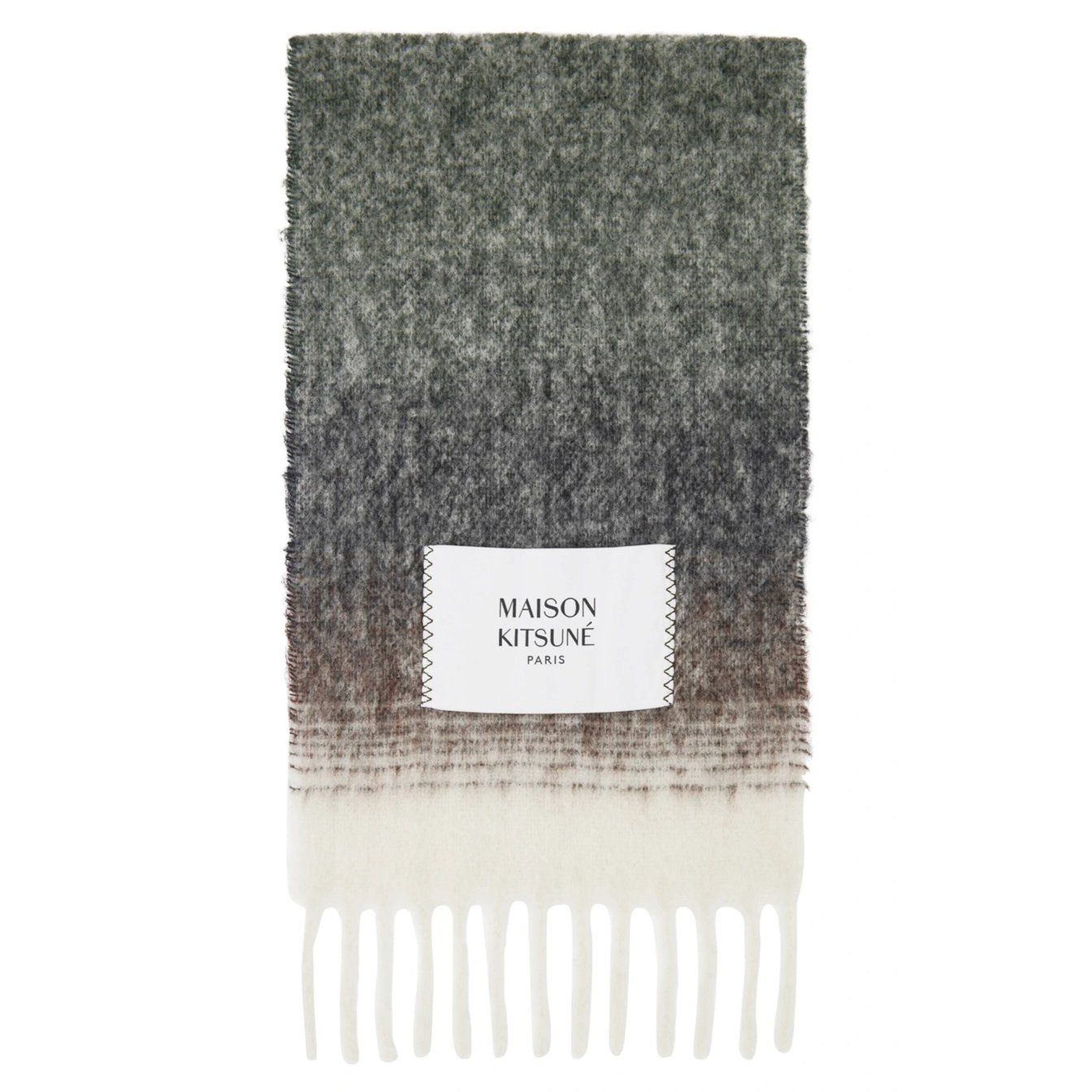 バーガンディ、グレー、ホワイトのグラデーションが美しい「メゾンキツネ(MAISON KITSUN?)」のアルパカ混ニットマフラー。シンプルすぎず、この絶妙な色合いが装いを格上げしてくれます。