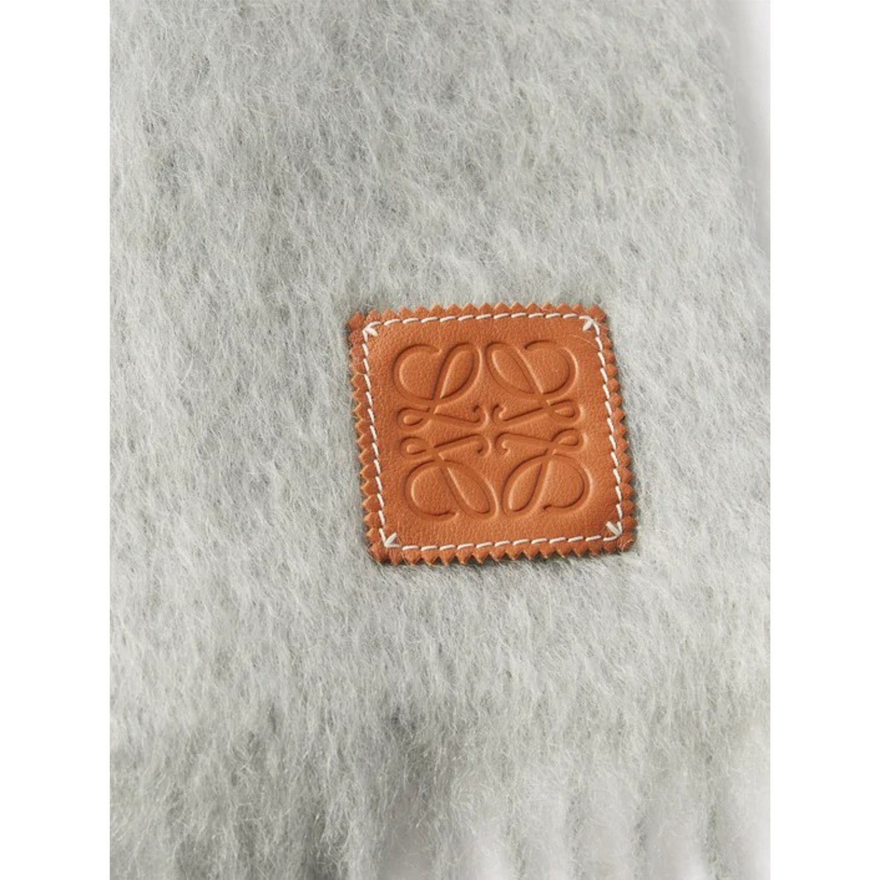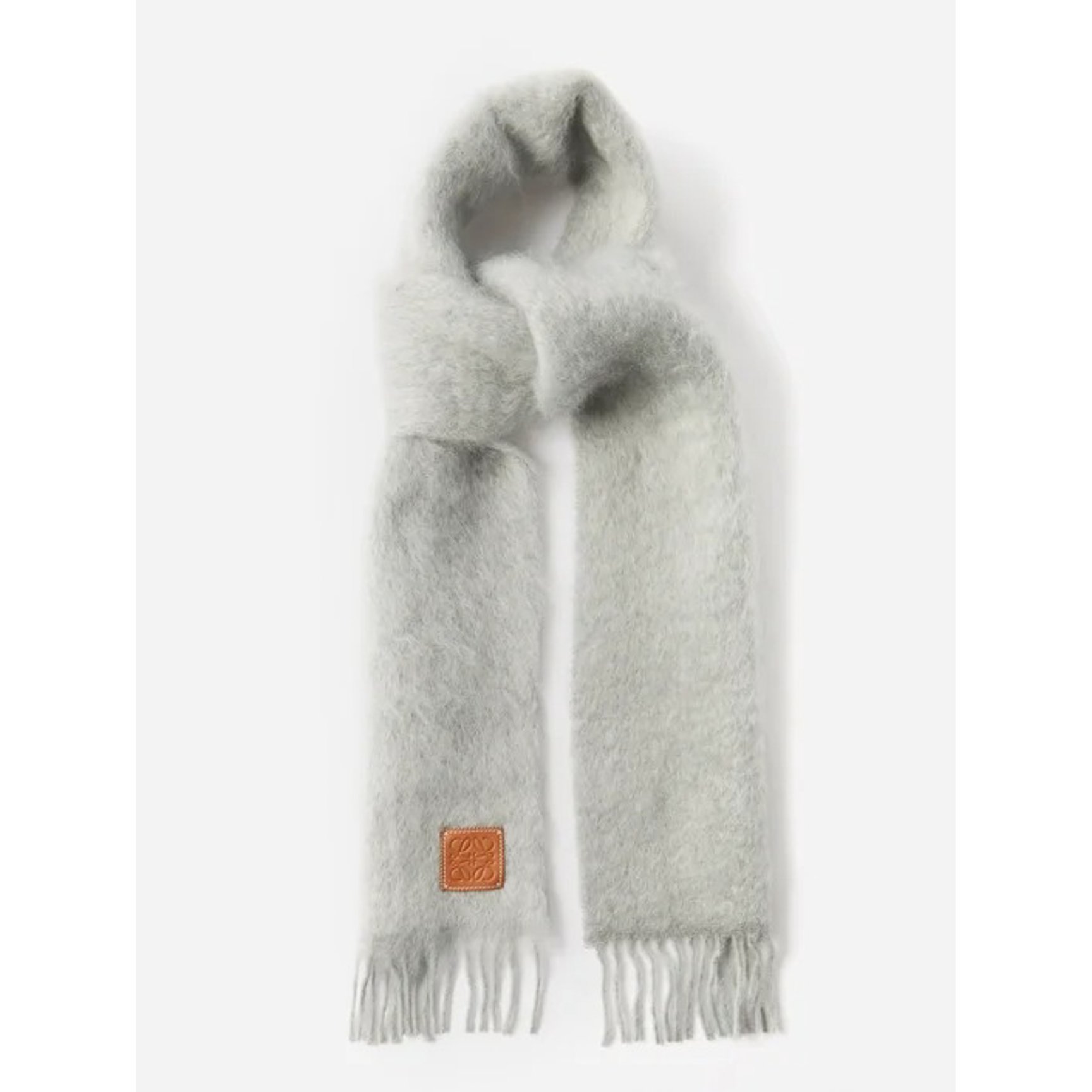 モヘア特有のふんわり感が見た目にもあたたかい「ロエベ(LOEWE)」のマフラー。淡いグレーはスタイルを選ばず汎用性も高いです。レザーパッチのブランドロゴが嬉しいアクセント。