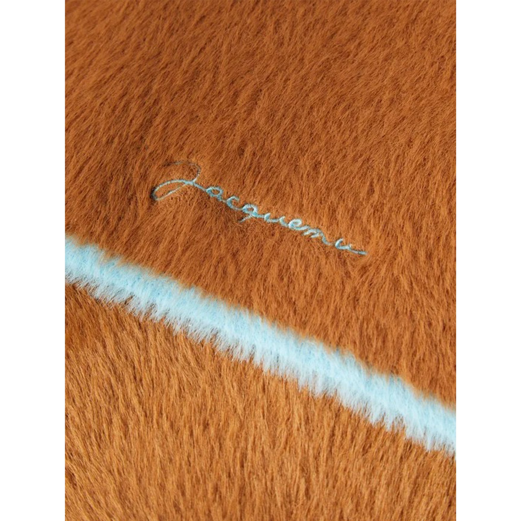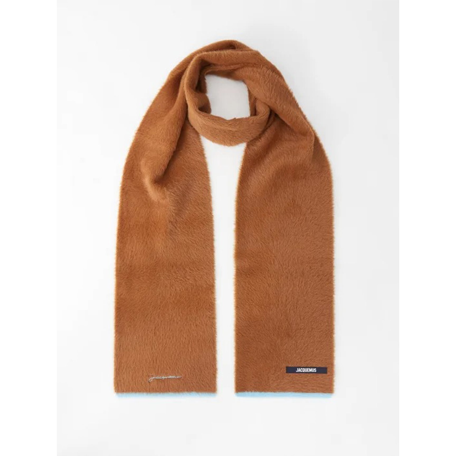 手触りの良いシャギー感のある「ジャックムス(JACQUEMUS)」のマフラーです。両端にさり気なく入ったブルーのラインとロゴ刺繍がポイント。