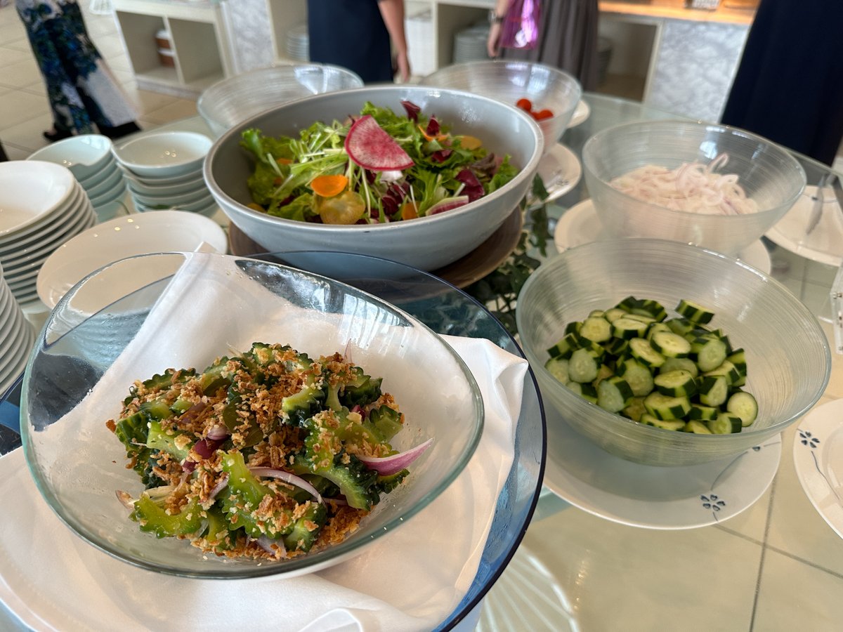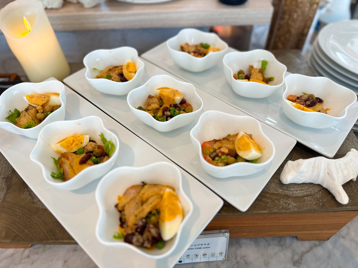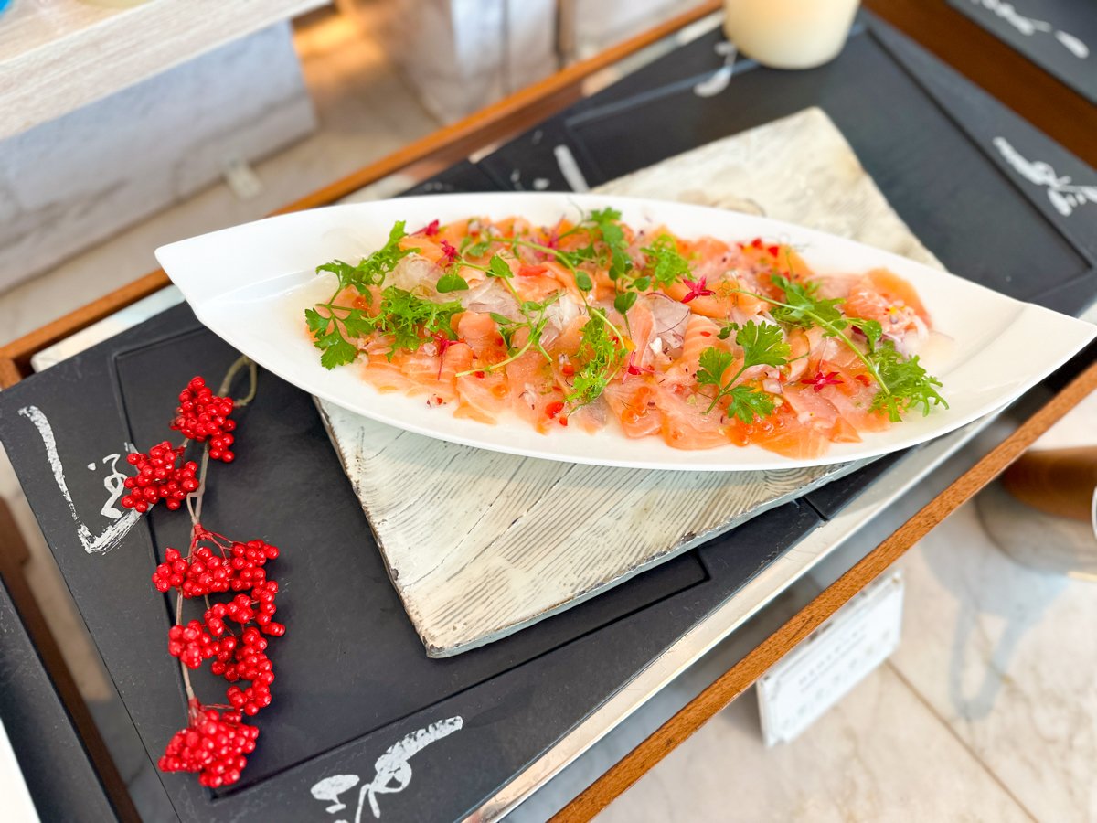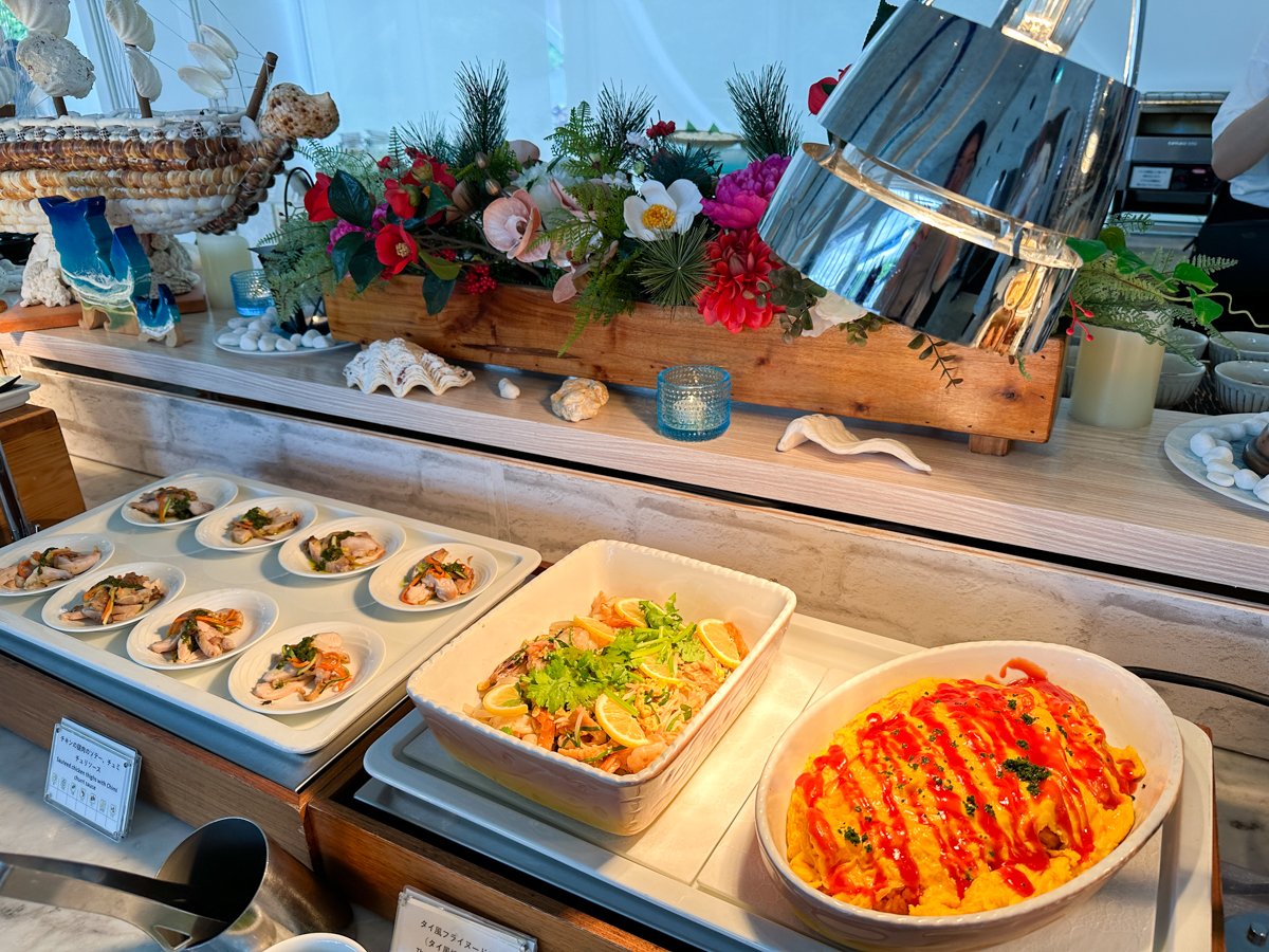 食事は沖縄や宮古島で採れた新鮮な野菜や魚、沖縄特産のアグー豚などのお肉がずらり。室内でのバイキングや、レストラン真横のプールサイドでのBBQなどがあります。カルパッチョなどに使われている魚は、その日に獲れた新鮮な白身魚で、不飽和脂肪酸であるDHAやEPAなどを豊富に含みます。また、沖縄の中でも限られたレストランでしか食べられない、ブランド牛「宮古島泡盛ほろよい牛」の赤身も必見。エサに泡盛の酒粕を混ぜているのだそう。