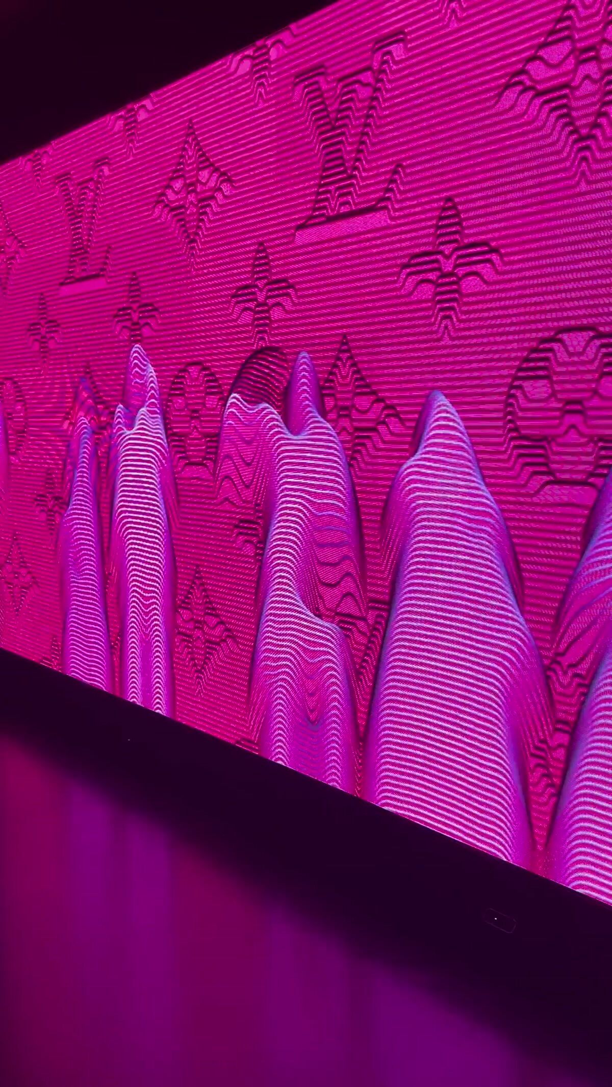 エントランスでは、デジタルアーティストのレフィーク?アナドールがAI技術を用いて描いた若き日の創業者ルイ?ヴィトンのポートレートがゲストを迎えます。約200年前の1821年ルイ生誕の地?ジュラ地方を写した100万枚の画像の中から、まるで動く砂絵のように浮かび上がってきます。